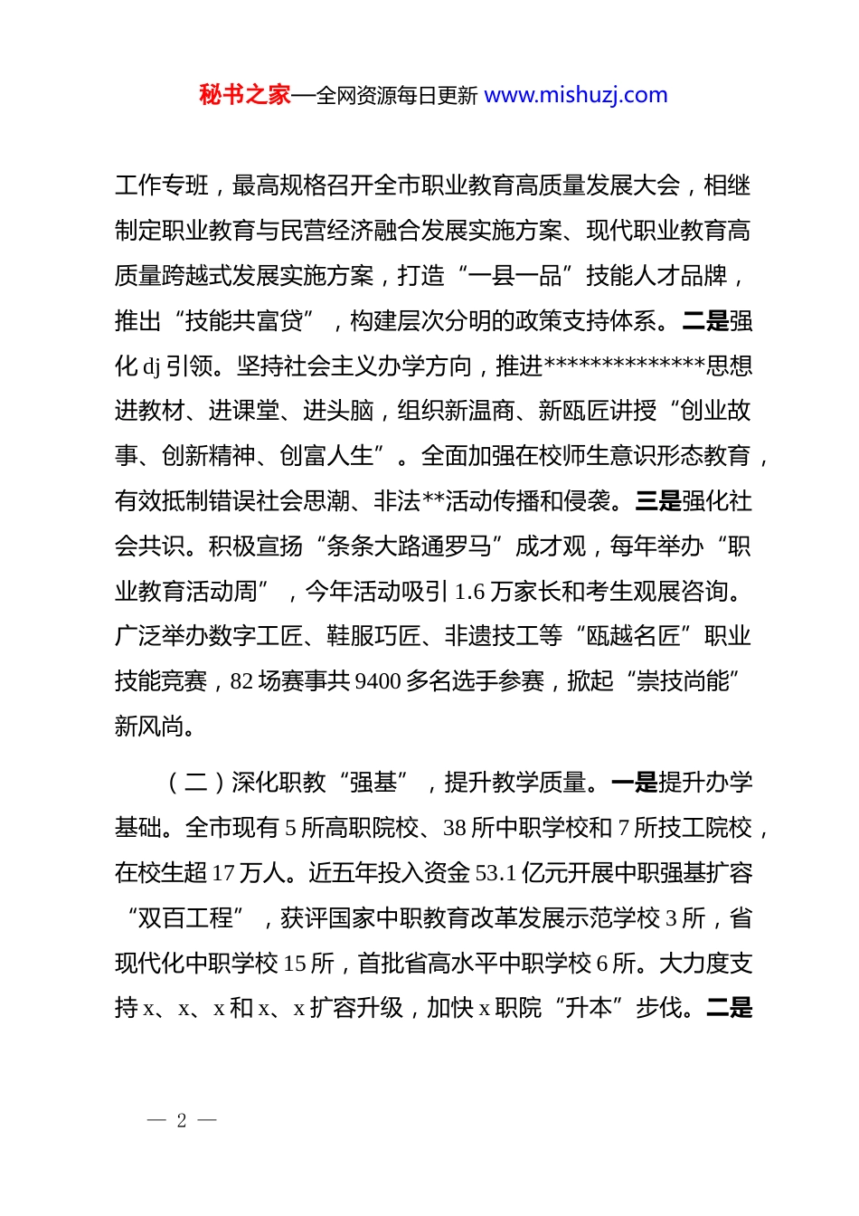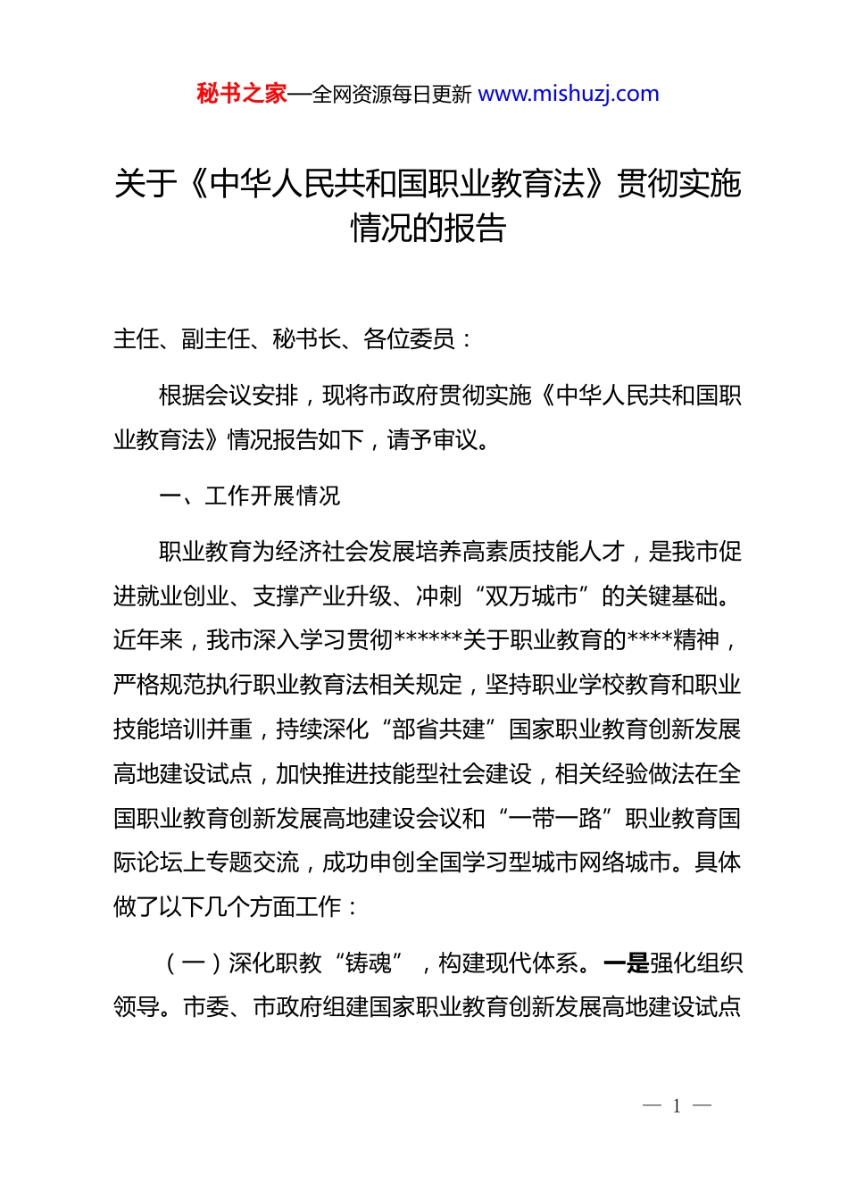 秘书之家—全网资源每日更新 www.mishuzj.com关于《中华人民共和国职业教育法》贯彻实施情况的报告主任、副主任、秘书长、各位委员:根据会议安排,现将市政府贯彻实施《中华人民共和国职业教育法》情况报告如下,请予审议。一、工作开展情况职业教育为经济社会发展培养高素质技能人才,是我市促进就业创业、支撑产业升级、冲刺“双万城市”的关键基础。近年来,我市深入学习贯彻******关于职业教育的****精神,严格规范执行职业教育法相关规定,坚持职业学校教育和职业技能培训并重,持续深化“部省共建”国家职业教育创新发展高地建设试点,加快推进技能型社会建设,相关经验做法在全国职业教育创新发展高地建设会议和“一带一路”职业教育国际论坛上专题交流,成功申创全国学习型城市网络城市。具体做了以下几个方面工作:(一)深化职教“铸魂”,构建现代体系。一是强化组织领导。市委、市政府组建国家职业教育创新发展高地建设试点— 1 —秘书之家—全网资源每日更新 www.mishuzj.com工作专班,最高规格召开全市职业教育高质量发展大会,相继制定职业教育与民营经济融合发展实施方案、现代职业教育高质量跨越式发展实施方案,打造“一县一品”技能人才品牌,推出“技能共富贷”,构建层次分明的政策支持体系。二是强化 dj 引领。坚持社会主义办学方向,推进**************思想进教材、进课堂、进头脑,组织新温商、新瓯匠讲授“创业故事、创新精神、创富人生”。全面加强在校师生意识形态教育,有效抵制错误社会思潮、非法**活动传播和侵袭。三是强化社会共识。积极宣扬“条条大路通罗马”成才观,每年举办“职业教育活动周”,今年活动吸引 1.6 万家长和考生观展咨询。广泛举办数字工匠、鞋服巧匠、非遗技工等“瓯越名匠”职业技能竞赛,82 场赛事共 9400 多名选手参赛,掀起“崇技尚能”新风尚。(二)深化职教“强基”,提升教学质量。一是提升办学基础。全市现有 5 所高职院校、38 所中职学校和 7 所技工院校,在校生超 17 万人。近五年投入资金 53.1 亿元开展中职强基扩容“双百工程”,获评国家中职教育改革发展示范学校 3 所,省现代化中职学校 15 所,首批省高水平中职学校 6 所。大力度支持 x、x、x 和 x、x 扩容升级,加快 x 职院“升本”步伐。二是— 2 —秘书之家—全网资源每日更新 www.mishuzj.com提升教师团队。建立全市统一的职业教育“双师型”教师(专业名师、技能大师)认定机制,近五年全市职业学校获评“全国高校黄大年式教师团队”2 支、“国家级教师教学创新团队”6 支,12 个项目获国家级教学成果奖。三是提升培养能力。统筹推进“一体设计、学段衔接、技能递进”的长学制人才培养改革,获批省级“中本一体化”试点专业 9 个,职业教育长学制招生人数占比 5 年提高 26 个百分点。构建“岗课赛证”融通的人才培养方案,摘得 2024 世界职业院校技能大赛奖项 16项、x 省职业学校技能大赛奖项 201 项。(三)深化职教“赋能”,创新产教融合。一是创新产业学院。立项培育 14 个市域产教联合体和行业产教融合共同体,5 所高职院校分别与 10 个县(市、区)中职学校共建 13 个省级“区域中高职一体化人才培养改革”专业。大力推进政校行企四方共建“一县一产业学院”,建成 x 市智能泵阀学院、汽车学院、新能源学院、眼镜产业学院等一批产业学院,今年新获批 x 省首批县域产业学院 4 个,数量全省第二。二是创新校企共育。与 x、x、x、x 等龙头企业建立多层次合作关系,推动高职院校及技师学院与 250 余家企业开设 475 个订单班,定向培养技术技能人才。实施 x 特色的企业新型学徒制培育模式,立— 3 —秘书之家—全网资源每日更新 www.mishuzj.com项培育市级产教融合型企业 74 家。持续加大岗位资源供给,强化个性化帮扶指导,高职院校毕业生留温率稳定在 50%以上(高出温籍生源率约 20 个百分点),市属技工院校学生留温率达 90%。三是创新专业设置。立足“5+5+n”支柱产业,创新打造高水平专业集群,两所高职院校获首批国家“双高计划”建设绩效优秀等次,新增 ...