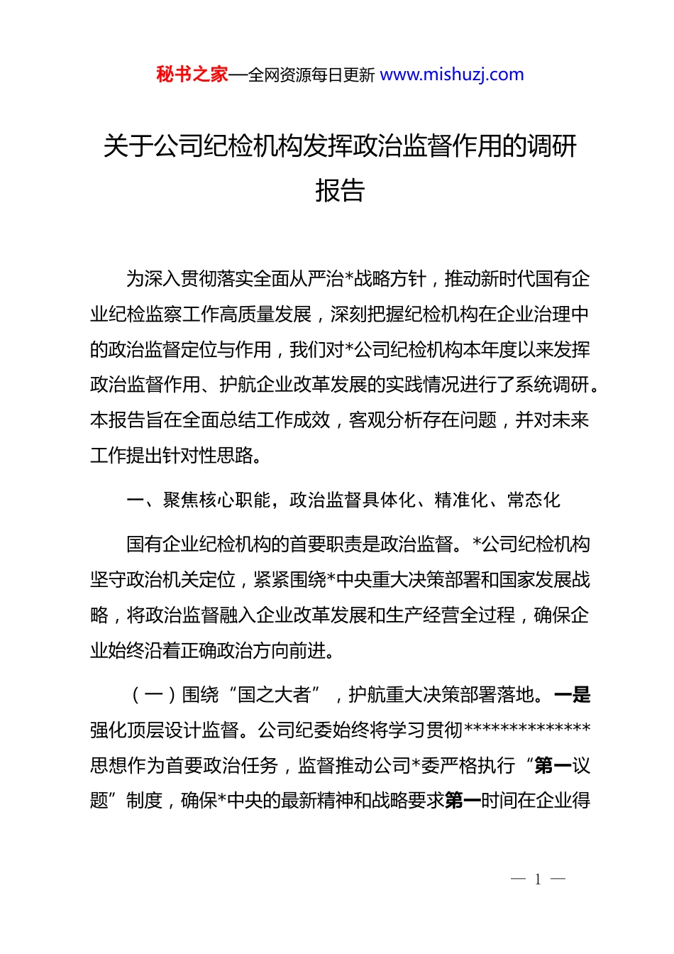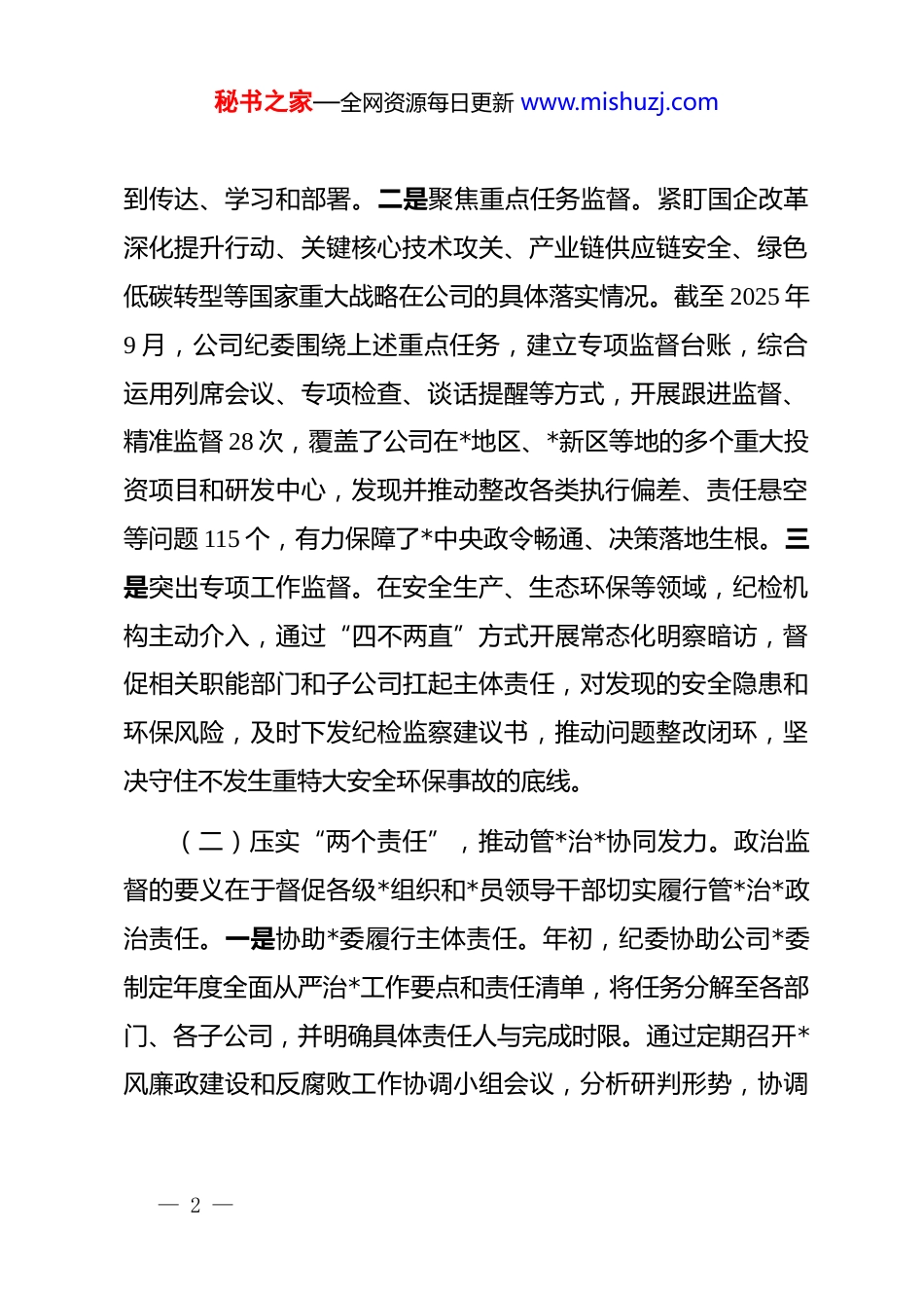 秘书之家—全网资源每日更新 www.mishuzj.com关于公司纪检机构发挥政治监督作用的调研报告为深入贯彻落实全面从严治*战略方针,推动新时代国有企业纪检监察工作高质量发展,深刻把握纪检机构在企业治理中的政治监督定位与作用,我们对*公司纪检机构本年度以来发挥政治监督作用、护航企业改革发展的实践情况进行了系统调研。本报告旨在全面总结工作成效,客观分析存在问题,并对未来工作提出针对性思路。一、聚焦核心职能,政治监督具体化、精准化、常态化国有企业纪检机构的首要职责是政治监督。*公司纪检机构坚守政治机关定位,紧紧围绕*中央重大决策部署和国家发展战略,将政治监督融入企业改革发展和生产经营全过程,确保企业始终沿着正确政治方向前进。(一)围绕“国之大者”,护航重大决策部署落地。一是强化顶层设计监督。公司纪委始终将学习贯彻**************思想作为首要政治任务,监督推动公司*委严格执行“第一议题”制度,确保*中央的最新精神和战略要求第一时间在企业得— 1 —秘书之家—全网资源每日更新 www.mishuzj.com到传达、学习和部署。二是聚焦重点任务监督。紧盯国企改革深化提升行动、关键核心技术攻关、产业链供应链安全、绿色低碳转型等国家重大战略在公司的具体落实情况。截至 2025 年9 月,公司纪委围绕上述重点任务,建立专项监督台账,综合运用列席会议、专项检查、谈话提醒等方式,开展跟进监督、精准监督 28 次,覆盖了公司在*地区、*新区等地的多个重大投资项目和研发中心,发现并推动整改各类执行偏差、责任悬空等问题 115 个,有力保障了*中央政令畅通、决策落地生根。三是突出专项工作监督。在安全生产、生态环保等领域,纪检机构主动介入,通过“四不两直”方式开展常态化明察暗访,督促相关职能部门和子公司扛起主体责任,对发现的安全隐患和环保风险,及时下发纪检监察建议书,推动问题整改闭环,坚决守住不发生重特大安全环保事故的底线。(二)压实“两个责任”,推动管*治*协同发力。政治监督的要义在于督促各级*组织和*员领导干部切实履行管*治*政治责任。一是协助*委履行主体责任。年初,纪委协助公司*委制定年度全面从严治*工作要点和责任清单,将任务分解至各部门、各子公司,并明确具体责任人与完成时限。通过定期召开*风廉政建设和反腐败工作协调小组会议,分析研判形势,协调— 2 —秘书之家—全网资源每日更新 www.mishuzj.com解决重点难点问题。二是推动监督责任贯通融合。强化对*委班子成员履行“一岗双责”情况的监督检查,通过政治生态画像、日常谈心谈话等方式,动态掌握班子成员在分管领域内抓*风廉政建设的情况。本年度以来,已向公司*委及班子成员提出相关工作建议 12 条,推动主体责任和监督责任在决策、执行、监督等环节同向发力、同频共振,形成了齐抓共管的良好局面。(三)紧扣“关键环节”,保障权力规范有序运行。公司纪检机构聚焦选人用人、招标采购、工程建设等权力集中、资金密集、资源富集的关键领域,开展全过程监督。在选人用人方面,监督推动公司*委严格执行干部选拔任用程序,对动议、民主推荐、考察、讨论决定等环节进行全程跟进,防止“带病提拔”“违规破格”等问题发生。在招标采购领域,通过建立招标采购监督清单,对招标文件审核、开标评标、合同签订等关键节点实施嵌入式监督,严肃查处围标串标、虚假招标等违规行为,今年以来共开展专项检查 5 次,发现问题 8 个,均已督促整改到位。在工程建设方面,对项目立项、设计、施工、验收等环节开展常态化监督,重点检查是否存在违规插手干预工程项目、偷工减料、虚报工程量等问题,确保工程建设质量安全、资金使用合规。通过紧扣这些关键环节,公司纪检机构— 3 —秘书之家—全网资源每日更新 www.mishuzj.com有效规范了权力运行,防止了利益输送和腐败问题的发生,为公司健康发展提供了坚强纪律保障。二、前移监督关口,日常监督精准化规范化公司纪检机构坚持抓早抓小、防微杜渐,将监督关口前移把日常监督做实做细,以精准有效的监督规范权力运行,保障企业在法治轨道上健康运营。(一)紧盯“三重一大”,规范权力运行。“...