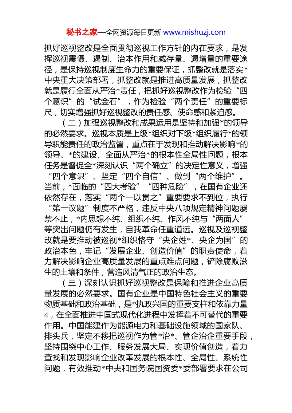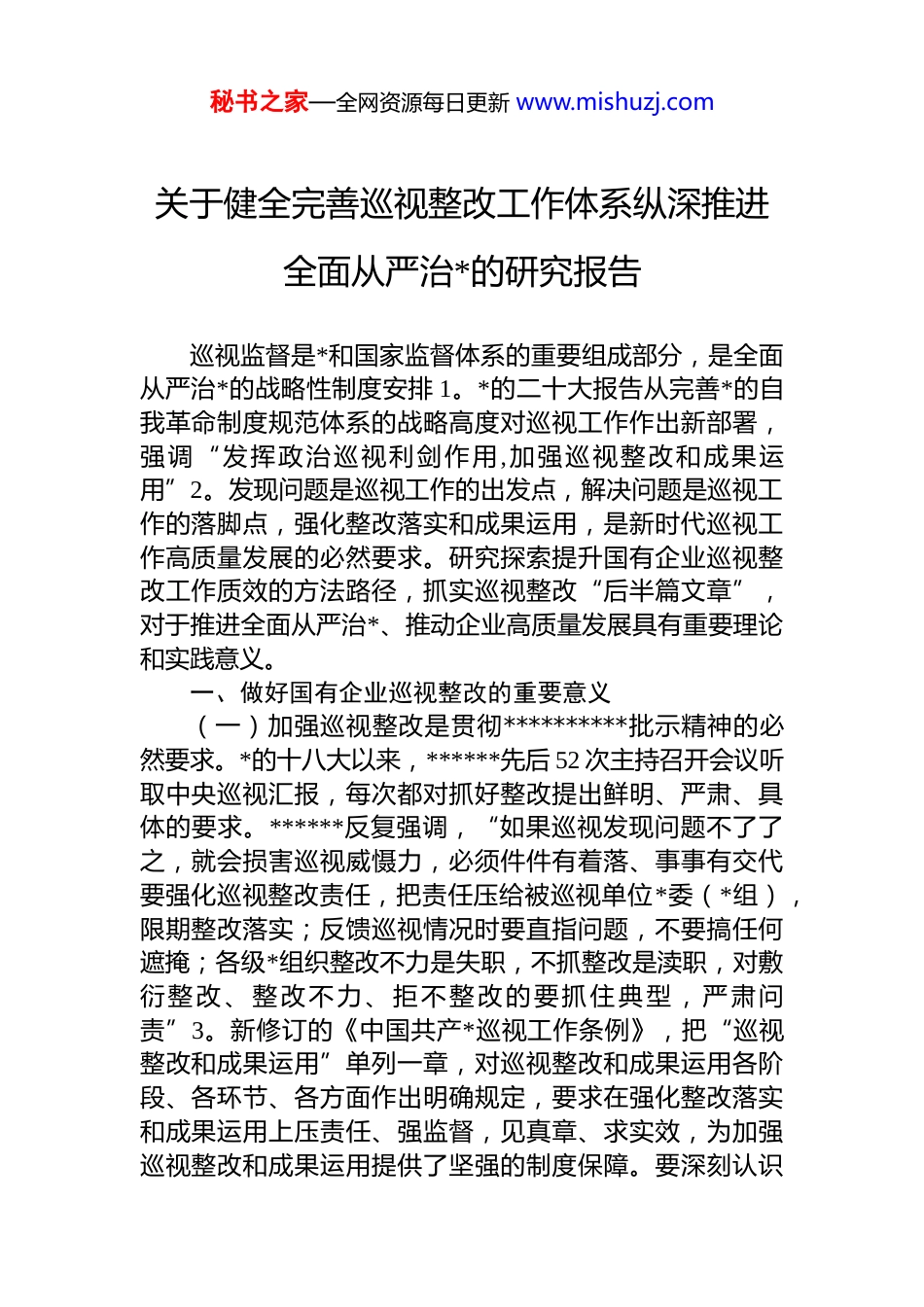 秘书之家—全网资源每日更新 www.mishuzj.com关于健全完善巡视整改工作体系纵深推进全面从严治*的研究报告巡视监督是*和国家监督体系的重要组成部分,是全面从严治*的战略性制度安排 1。*的二十大报告从完善*的自我革命制度规范体系的战略高度对巡视工作作出新部署,强调“发挥政治巡视利剑作用,加强巡视整改和成果运用”2。发现问题是巡视工作的出发点,解决问题是巡视工作的落脚点,强化整改落实和成果运用,是新时代巡视工作高质量发展的必然要求。研究探索提升国有企业巡视整改工作质效的方法路径,抓实巡视整改“后半篇文章”,对于推进全面从严治*、推动企业高质量发展具有重要理论和实践意义。一、做好国有企业巡视整改的重要意义(一)加强巡视整改是贯彻**********批示精神的必然要求。*的十八大以来,******先后 52 次主持召开会议听取中央巡视汇报,每次都对抓好整改提出鲜明、严肃、具体的要求。******反复强调,“如果巡视发现问题不了了之,就会损害巡视威慑力,必须件件有着落、事事有交代要强化巡视整改责任,把责任压给被巡视单位*委(*组),限期整改落实;反馈巡视情况时要直指问题,不要搞任何遮掩;各级*组织整改不力是失职,不抓整改是渎职,对敷衍整改、整改不力、拒不整改的要抓住典型,严肃问责”3。新修订的《中国共产*巡视工作条例》,把“巡视整改和成果运用”单列一章,对巡视整改和成果运用各阶段、各环节、各方面作出明确规定,要求在强化整改落实和成果运用上压责任、强监督,见真章、求实效,为加强巡视整改和成果运用提供了坚强的制度保障。要深刻认识秘书之家—全网资源每日更新 www.mishuzj.com抓好巡视整改是全面贯彻巡视工作方针的内在要求,是发挥巡视震慑、遏制、治本作用和减存量、遏增量的重要途径,是保持巡视制度生命力的重要保证,抓整改就是落实*中央重大决策部署,抓整改就是推进高质量发展,抓整改就是履行全面从严治*责任,把抓好巡视整改作为检验“四个意识”的“试金石”,作为检验“两个责任”的重要标尺,切实增强抓好巡视整改的责任感、使命感和紧迫感。(二)加强巡视整改和成果运用是坚持和加强*的领导的必然要求。巡视本质是上级*组织对下级*组织履行*的领导职能责任的政治监督,重点在于发现和推动解决影响*的领导、*的建设、全面从严治*的根本性全局性问题,根本任务是督促全*深刻认识“两个确立”的决定性意义,增强“四个意识”、坚定“四个自信”、做到“两个维护”。当前,*面临的“四大考验”“四种危险”,在国有企业还依然存在,落实“两个一以贯之”重要要求不到位,执行“第一议题”制度不严格,违反中央八项规定精神问题屡禁不止,*内思想不纯、组织不纯、作风不纯与“两面人”等突出问题仍有发生,自我革命任重道远。巡视及巡视整改就是要推动被巡视*组织恪守“央企姓*、央企为国”的政治本色,牢记“发展企业、创造价值”的职责使命,着力解决影响企业高质量发展的重点难点问题,铲除腐败滋生的土壤和条件,营造风清气正的政治生态。(三)深刻认识抓好巡视整改是保障和推进企业高质量发展的必然要求。国有企业是中国特色社会主义的重要物质基础和政治基础,是*执政兴国的重要支柱和依靠力量4,在全面推进中国式现代化进程中发挥着不可替代的重要作用。中国能建作为能源电力和基础设施领域的国家队、排头兵,坚定不移把巡视作为管*治*、管企治企重要手段,坚持围绕中心工作、服务发展大局、实现价值创造,着力查找和发现影响企业改革发展的根本性、全局性、系统性问题,有效推动*中央和国务院国资委*委部署要求在公司秘书之家—全网资源每日更新 www.mishuzj.com落实落地。从近几年巡视发现问题来看,被巡视企业*组织仍不同程度存在领导班子“三力”建设不够强、贯彻“三新一高”措施不够实、基础管理水平不够高、防范化解风险有差距等问题。只有压实巡视整改“四方责任”,从严传导压力,推动巡视整改与强化风险防控相结合,与强化长效机制建设相结合,打好整改“组合拳”,才能推动解决制约企业改革发展的深层次问题,助力企业做强做优做大。二、新形势下国有企业强化巡视整改面临的问题******强...