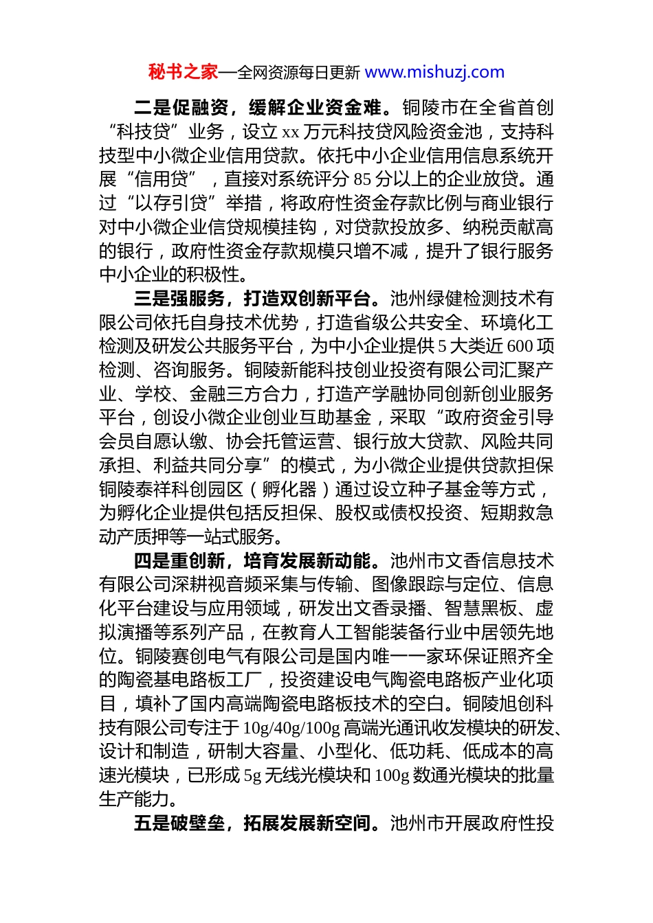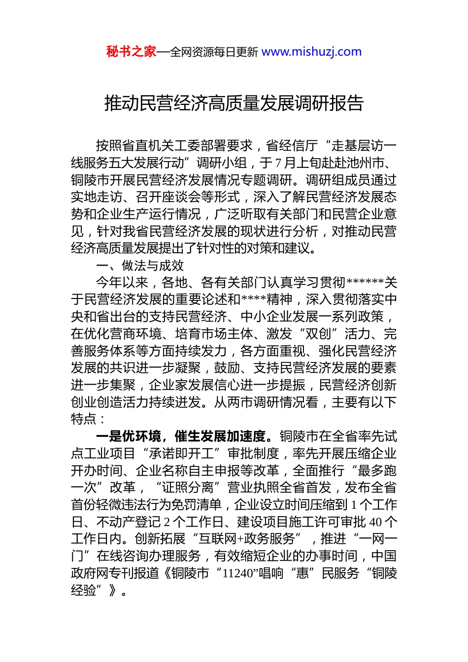 秘书之家—全网资源每日更新 www.mishuzj.com推动民营经济高质量发展调研报告按照省直机关工委部署要求,省经信厅“走基层访一线服务五大发展行动”调研小组,于 7 月上旬赴赴池州市、铜陵市开展民营经济发展情况专题调研。调研组成员通过实地走访、召开座谈会等形式,深入了解民营经济发展态势和企业生产运行情况,广泛听取有关部门和民营企业意见,针对我省民营经济发展的现状进行分析,对推动民营经济高质量发展提出了针对性的对策和建议。一、做法与成效今年以来,各地、各有关部门认真学习贯彻******关于民营经济发展的重要论述和****精神,深入贯彻落实中央和省出台的支持民营经济、中小企业发展一系列政策,在优化营商环境、培育市场主体、激发“双创”活力、完善服务体系等方面持续发力,各方面重视、强化民营经济发展的共识进一步凝聚,鼓励、支持民营经济发展的要素进一步集聚,企业家发展信心进一步提振,民营经济创新创业创造活力持续迸发。从两市调研情况看,主要有以下特点:一是优环境,催生发展加速度。铜陵市在全省率先试点工业项目“承诺即开工”审批制度,率先开展压缩企业开办时间、企业名称自主申报等改革,全面推行“最多跑一次”改革,“证照分离”营业执照全省首发,发布全省首份轻微违法行为免罚清单,企业设立时间压缩到 1 个工作日、不动产登记 2 个工作日、建设项目施工许可审批 40 个工作日内。创新拓展“互联网+政务服务”,推进“一网一门”在线咨询办理服务,有效缩短企业的办事时间,中国政府网专刊报道《铜陵市“11240”唱响“惠”民服务“铜陵经验”》。秘书之家—全网资源每日更新 www.mishuzj.com二是促融资,缓解企业资金难。铜陵市在全省首创“科技贷”业务,设立 xx 万元科技贷风险资金池,支持科技型中小微企业信用贷款。依托中小企业信用信息系统开展“信用贷”,直接对系统评分 85 分以上的企业放贷。通过“以存引贷”举措,将政府性资金存款比例与商业银行对中小微企业信贷规模挂钩,对贷款投放多、纳税贡献高的银行,政府性资金存款规模只增不减,提升了银行服务中小企业的积极性。三是强服务,打造双创新平台。池州绿健检测技术有限公司依托自身技术优势,打造省级公共安全、环境化工检测及研发公共服务平台,为中小企业提供 5 大类近 600 项检测、咨询服务。铜陵新能科技创业投资有限公司汇聚产业、学校、金融三方合力,打造产学融协同创新创业服务平台,创设小微企业创业互助基金,采取“政府资金引导会员自愿认缴、协会托管运营、银行放大贷款、风险共同承担、利益共同分享”的模式,为小微企业提供贷款担保铜陵泰祥科创园区(孵化器)通过设立种子基金等方式,为孵化企业提供包括反担保、股权或债权投资、短期救急动产质押等一站式服务。四是重创新,培育发展新动能。池州市文香信息技术有限公司深耕视音频采集与传输、图像跟踪与定位、信息化平台建设与应用领域,研发出文香录播、智慧黑板、虚拟演播等系列产品,在教育人工智能装备行业中居领先地位。铜陵赛创电气有限公司是国内唯一一家环保证照齐全的陶瓷基电路板工厂,投资建设电气陶瓷电路板产业化项目,填补了国内高端陶瓷电路板技术的空白。铜陵旭创科技有限公司专注于 10g/40g/100g 高端光通讯收发模块的研发、设计和制造,研制大容量、小型化、低功耗、低成本的高速光模块,已形成 5g 无线光模块和 100g 数通光模块的批量生产能力。五是破壁垒,拓展发展新空间。池州市开展政府性投秘书之家—全网资源每日更新 www.mishuzj.com资项目招投标领域问题专项整治,制定规范市政府投资工程建设项目招标投标工作方案及招标重点项目随机抽查等制度,严厉打击围标串标等扰乱市场秩序不法行为。铜陵市委、市政府结合新一轮机构改革,新成立市民营经济促进局,整合政策资源,凝聚部门合力,全方位、全要素为民营企业发展“保驾护航”。二、存在的困难和问题(一)政策落实尚需加力。一是部分政策门槛高。调研中,企业认为目前惠企政策很多,但一些政策享受门槛高,主要针对“三重一创”、战新产业等“高大上”企业传统产业、劳动密集型企业难以享受。二...