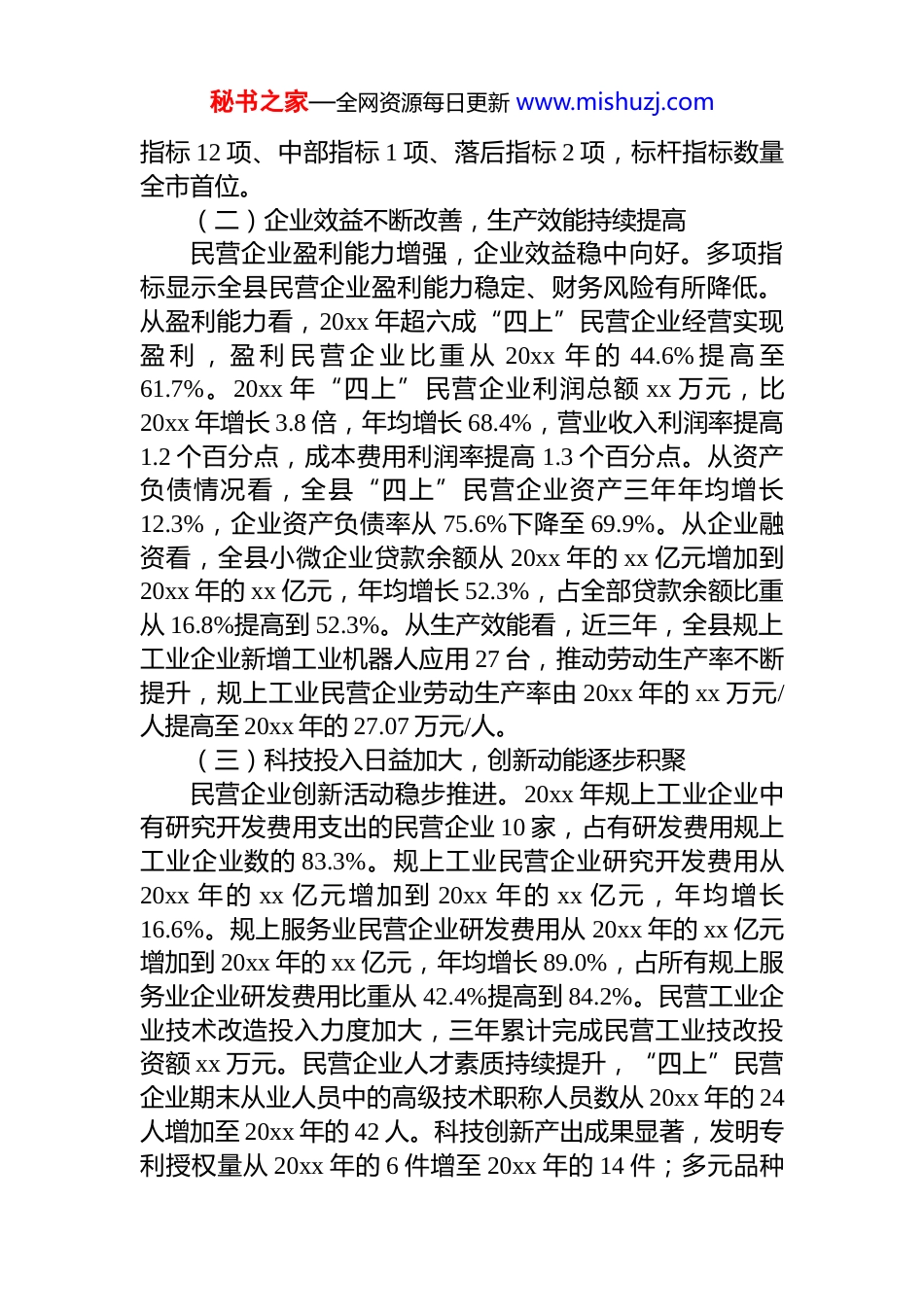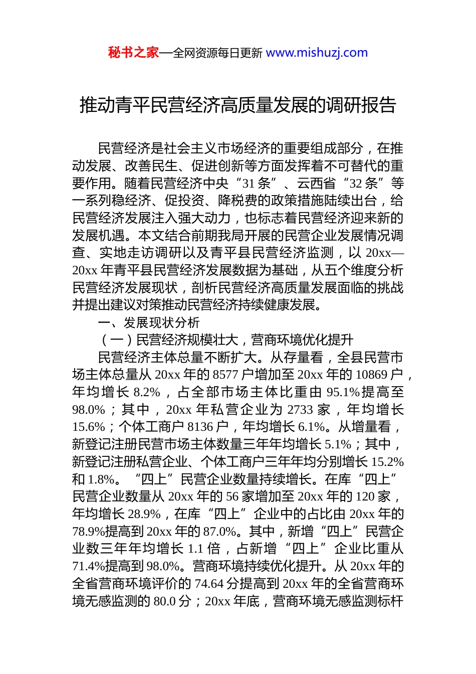 秘书之家—全网资源每日更新 www.mishuzj.com推动青平民营经济高质量发展的调研报告民营经济是社会主义市场经济的重要组成部分,在推动发展、改善民生、促进创新等方面发挥着不可替代的重要作用。随着民营经济中央“31 条”、云西省“32 条”等一系列稳经济、促投资、降税费的政策措施陆续出台,给民营经济发展注入强大动力,也标志着民营经济迎来新的发展机遇。本文结合前期我局开展的民营企业发展情况调查、实地走访调研以及青平县民营经济监测,以 20xx—20xx 年青平县民营经济发展数据为基础,从五个维度分析民营经济发展现状,剖析民营经济高质量发展面临的挑战并提出建议对策推动民营经济持续健康发展。一、发展现状分析(一)民营经济规模壮大,营商环境优化提升民营经济主体总量不断扩大。从存量看,全县民营市场主体总量从 20xx 年的 8577 户增加至 20xx 年的 10869 户,年均增长 8.2% ,占全部市场主体比重由 95.1% 提高至98.0% ; 其 中 , 20xx 年 私 营 企 业 为 2733 家 , 年 均 增 长15.6%;个体工商户 8136 户,年均增长 6.1%。从增量看,新登记注册民营市场主体数量三年年均增长 5.1%;其中,新登记注册私营企业、个体工商户三年年均分别增长 15.2%和 1.8%。“四上”民营企业数量持续增长。在库“四上”民营企业数量从 20xx 年的 56 家增加至 20xx 年的 120 家,年均增长 28.9%,在库“四上”企业中的占比由 20xx 年的78.9%提高到 20xx 年的 87.0%。其中,新增“四上”民营企业数三年年均增长 1.1 倍,占新增“四上”企业比重从71.4%提高到 98.0%。营商环境持续优化提升。从 20xx 年的全省营商环境评价的 74.64 分提高到 20xx 年的全省营商环境无感监测的 80.0 分;20xx 年底,营商环境无感监测标杆秘书之家—全网资源每日更新 www.mishuzj.com指标 12 项、中部指标 1 项、落后指标 2 项,标杆指标数量全市首位。(二)企业效益不断改善,生产效能持续提高民营企业盈利能力增强,企业效益稳中向好。多项指标显示全县民营企业盈利能力稳定、财务风险有所降低。从盈利能力看,20xx 年超六成“四上”民营企业经营实现盈 利 , 盈 利 民 营 企 业 比 重 从 20xx 年 的 44.6% 提 高 至61.7%。20xx 年“四上”民营企业利润总额 xx 万元,比20xx 年增长 3.8 倍,年均增长 68.4%,营业收入利润率提高1.2 个百分点,成本费用利润率提高 1.3 个百分点。从资产负债情况看,全县“四上”民营企业资产三年年均增长12.3%,企业资产负债率从 75.6%下降至 69.9%。从企业融资看,全县小微企业贷款余额从 20xx 年的 xx 亿元增加到20xx 年的 xx 亿元,年均增长 52.3%,占全部贷款余额比重从 16.8%提高到 52.3%。从生产效能看,近三年,全县规上工业企业新增工业机器人应用 27 台,推动劳动生产率不断提升,规上工业民营企业劳动生产率由 20xx 年的 xx 万元/人提高至 20xx 年的 27.07 万元/人。(三)科技投入日益加大,创新动能逐步积聚民营企业创新活动稳步推进。20xx 年规上工业企业中有研究开发费用支出的民营企业 10 家,占有研发费用规上工业企业数的 83.3%。规上工业民营企业研究开发费用从20xx 年的 xx 亿元增加到 20xx 年的 xx 亿元,年均增长16.6%。规上服务业民营企业研发费用从 20xx 年的 xx 亿元增加到 20xx 年的 xx 亿元,年均增长 89.0%,占所有规上服务业企业研发费用比重从 42.4%提高到 84.2%。民营工业企业技术改造投入力度加大,三年累计完成民营工业技改投资额 xx 万元。民营企业人才素质持续提升,“四上”民营企业期末从业人员中的高级技术职称人员数从 20xx 年的 24人增加至 20xx 年的 42 人。科技创新产出成果显著,发明专利授权量从 20xx 年的 6 件增至 20xx 年的 14 件;多元品种秘书之家—全网资源每日更新 www.mishuzj.com海水养殖、厚壳贻贝繁育关键技术的开发与应用,深度升级民营传统产业,助推民营经济创新发展。(四)产业结构升级优化,现代化产业加快培育新兴产业释放...