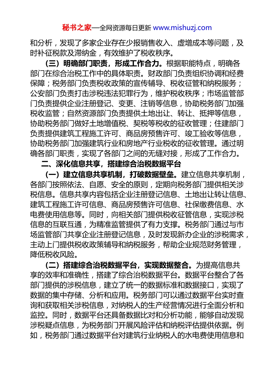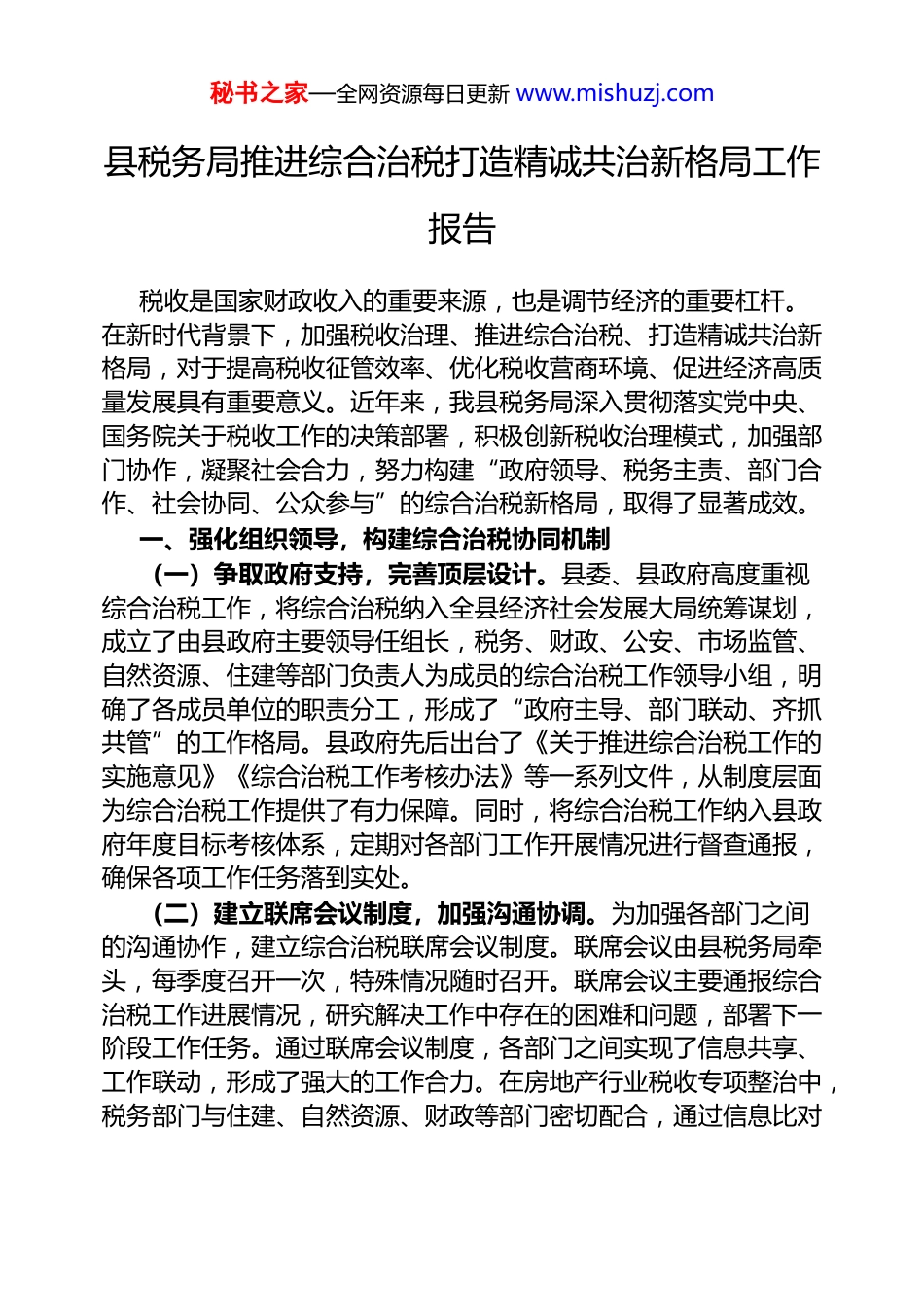 秘书之家—全网资源每日更新 www.mishuzj.com县税务局推进综合治税打造精诚共治新格局工作报告税收是国家财政收入的重要来源,也是调节经济的重要杠杆。在新时代背景下,加强税收治理、推进综合治税、打造精诚共治新格局,对于提高税收征管效率、优化税收营商环境、促进经济高质量发展具有重要意义。近年来,我县税务局深入贯彻落实党中央、国务院关于税收工作的决策部署,积极创新税收治理模式,加强部门协作,凝聚社会合力,努力构建“政府领导、税务主责、部门合作、社会协同、公众参与”的综合治税新格局,取得了显著成效。一、强化组织领导,构建综合治税协同机制(一)争取政府支持,完善顶层设计。县委、县政府高度重视综合治税工作,将综合治税纳入全县经济社会发展大局统筹谋划,成立了由县政府主要领导任组长,税务、财政、公安、市场监管、自然资源、住建等部门负责人为成员的综合治税工作领导小组,明确了各成员单位的职责分工,形成了“政府主导、部门联动、齐抓共管”的工作格局。县政府先后出台了《关于推进综合治税工作的实施意见》《综合治税工作考核办法》等一系列文件,从制度层面为综合治税工作提供了有力保障。同时,将综合治税工作纳入县政府年度目标考核体系,定期对各部门工作开展情况进行督查通报,确保各项工作任务落到实处。(二)建立联席会议制度,加强沟通协调。为加强各部门之间的沟通协作,建立综合治税联席会议制度。联席会议由县税务局牵头,每季度召开一次,特殊情况随时召开。联席会议主要通报综合治税工作进展情况,研究解决工作中存在的困难和问题,部署下一阶段工作任务。通过联席会议制度,各部门之间实现了信息共享、工作联动,形成了强大的工作合力。在房地产行业税收专项整治中,税务部门与住建、自然资源、财政等部门密切配合,通过信息比对秘书之家—全网资源每日更新 www.mishuzj.com和分析,发现了多家企业存在少报销售收入、虚增成本等问题,及时补征税款及滞纳金,有效维护了税收秩序。(三)明确部门职责,形成工作合力。根据职能特点,明确各部门在综合治税工作中的具体职责。财政部门负责组织协调和经费保障;税务部门负责税收政策的宣传辅导、税收征管和纳税服务;公安部门负责打击涉税违法犯罪行为,维护税收秩序;市场监管部门负责提供企业注册登记、变更、注销等信息,协助税务部门加强税收监管;自然资源部门负责提供土地出让、转让、抵押等信息,协助税务部门做好土地增值税、契税等税收的征收管理;住建部门负责提供建筑工程施工许可、商品房预售许可、竣工验收等信息,协助税务部门加强建筑行业和房地产行业税收的征收管理。通过明确各部门职责,实现了各部门之间的无缝对接,形成了工作合力。二、深化信息共享,搭建综合治税数据平台(一)建立信息共享机制,打破数据壁垒。建立信息共享机制,各部门按照依法、自愿、安全的原则,定期向税务部门提供相关涉税信息。信息共享内容包括企业注册登记信息、土地出让转让信息、建筑工程施工许可信息、商品房预售许可信息、社保缴费信息、水电费使用信息等。同时,向相关部门提供税收征管信息,实现涉税信息的互联互通,为精准监管提供了有力支撑。税务部门通过与市场监管部门共享企业注册登记信息,及时发现新办企业的涉税需求,主动上门提供税收政策辅导和纳税服务,帮助企业规范财务管理,降低税收风险。(二)搭建综合治税数据平台,实现数据整合。为提高信息共享的效率和准确性,搭建了综合治税数据平台。数据平台整合了各部门提供的涉税信息,建立了统一的数据标准和数据接口,实现了数据的集中存储、分析和应用。税务部门可以通过数据平台实时查询和获取相关涉税信息,对纳税人的生产经营情况进行全面分析和监控。同时,数据平台还具备数据比对和分析功能,能够自动发现涉税疑点信息,为税务部门开展风险评估和纳税评估提供依据。例如,税务部门通过数据平台对建筑行业纳税人的水电费使用信息和秘书之家—全网资源每日更新 www.mishuzj.com工程进度信息进行比对,发现了部分纳税人存在水电费使用量与工程进度不匹配的问题,进一步核实后,发现这些纳税人存在虚报...
