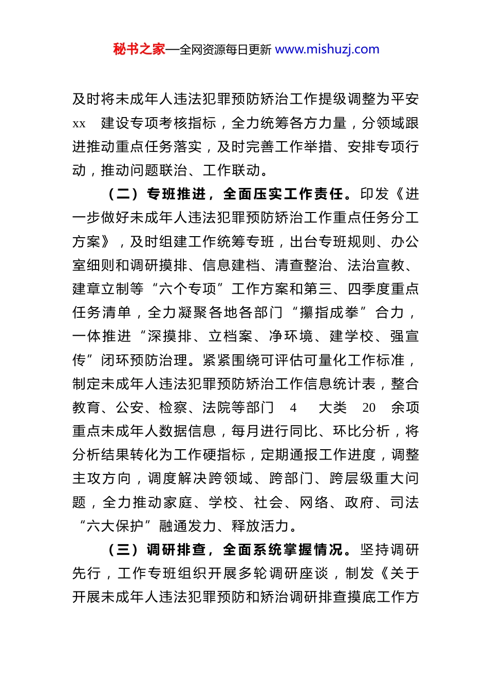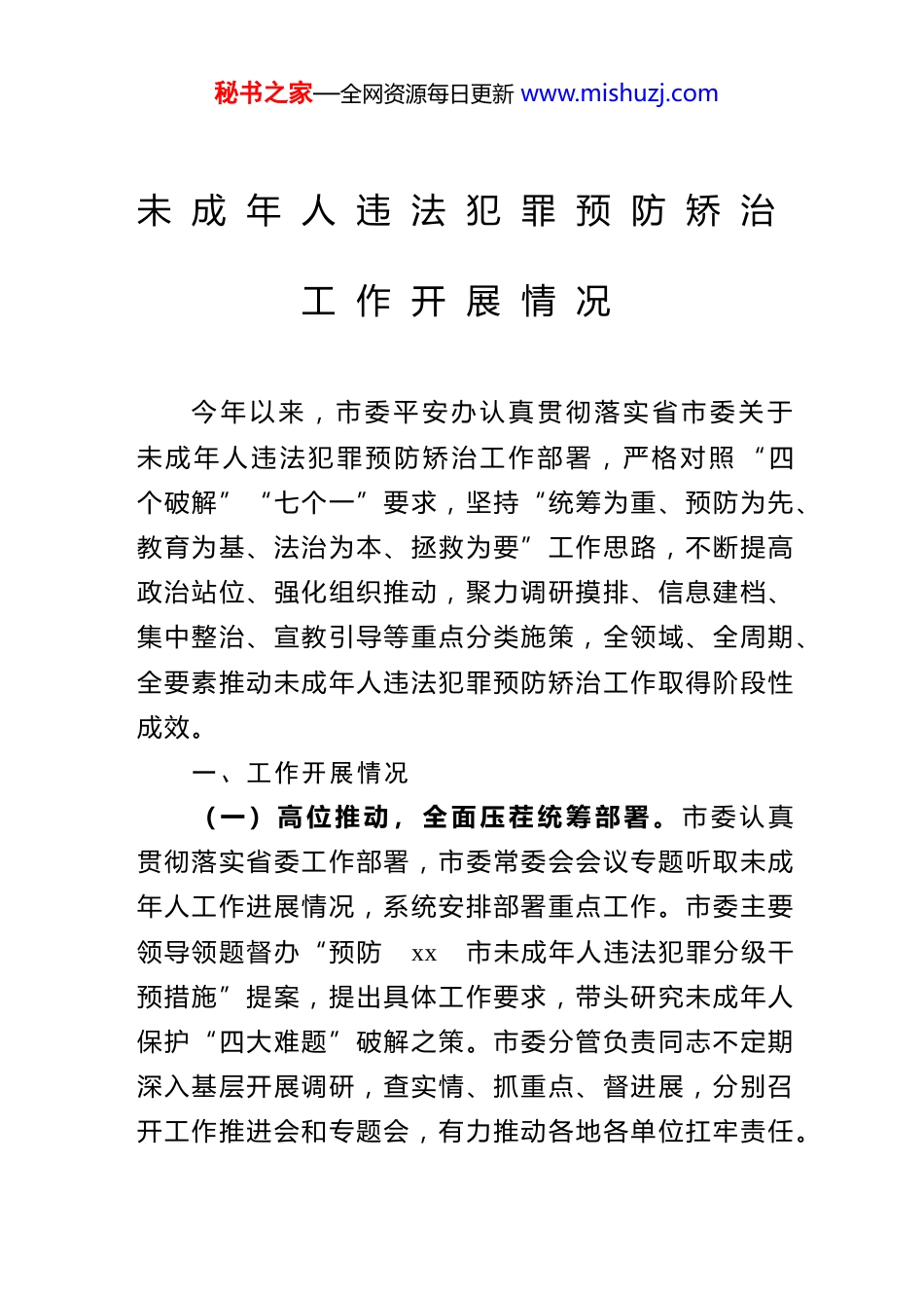 秘书之家—全网资源每日更新 www.mishuzj.com未 成 年 人 违 法 犯 罪 预 防 矫 治工 作 开 展 情 况今 年 以 来 , 市 委 平 安 办 认 真 贯 彻 落 实 省 市 委 关 于未 成 年 人 违 法 犯 罪 预 防 矫 治 工 作 部 署 , 严 格 对 照 “ 四个破解”“七个一”要求,坚持“统筹为重、预防为先、教育为基、法治为本、拯救为要”工作思路,不断提高政治站位、强化组织推动,聚力调研摸排、信息建档、集中整治、宣教引导等重点分类施策,全领域、全周期、全要素推动未成年人违法犯罪预防矫治工作取得阶段性成效。一、工作开展情况( 一 ) 高 位 推 动 , 全 面 压 茬 统 筹 部 署 。 市 委 认 真贯彻落实省委工作部署,市委常委会会议专题听取未成年人工作进展情况,系统安排部署重点工作。市委主要领导领题督办“预防xx市未成年人违法犯罪分级干预措施”提案,提出具体工作要求,带头研究未成年人保护“四大难题”破解之策。市委分管负责同志不定期深入基层开展调研,查实情、抓重点、督进展,分别召开工作推进会和专题会,有力推动各地各单位扛牢责任。秘书之家—全网资源每日更新 www.mishuzj.com及时将未成年人违法犯罪预防矫治工作提级调整为平安xx建设专项考核指标,全力统筹各方力量,分领域跟进推动重点任务落实,及时完善工作举措、安排专项行动,推动问题联治、工作联动。( 二 ) 专 班 推 进 , 全 面 压 实 工 作 责 任 。 印 发 《 进一步做好未成年人违法犯罪预防矫治工作重点任务分工方案》,及时组建工作统筹专班,出台专班规则、办公室细则和调研摸排、信息建档、清查整治、法治宣教、建章立制等“六个专项”工作方案和第三、四季度重点任 务 清 单 , 全 力 凝 聚 各 地 各 部 门 “ 攥 指 成 拳 ” 合 力 ,一 体 推 进 “ 深 摸 排 、 立 档 案 、 净 环 境 、 建 学 校 、 强 宣传”闭环预防治理。紧紧围绕可评估可量化工作标准,制定未成年人违法犯罪预防矫治工作信息统计表,整合教育、公安、检察、法院等部门4大类20余项重点未成年人数据信息,每月进行同比、环比分析,将分析结果转化为工作硬指标,定期通报工作进度,调整主 攻 方 向 , 调 度 解 决 跨 领 域 、 跨 部 门 、 跨 层 级 重 大 问题 , 全 力 推 动 家 庭 、 学 校 、 社 会 、 网 络 、 政 府 、 司 法“六大保护”融通发力、释放活力。( 三 ) 调 研 排 查 , 全 面 系 统 掌 握 情 况 。 坚 持 调 研先 行 , 工 作 专 班 组 织 开 展 多 轮 调 研 座 谈 , 制 发 《 关 于开展未成年人违法犯罪预防和矫治调研排查摸底工作方秘书之家—全网资源每日更新 www.mishuzj.com案》,以“综合调研+行业调研”形式,吸纳6名 市 政 协 委 员 组 建 综 合 调 研 小 组 , 分 赴 县 区 、 学 校 和看 守 所 等 有 关 单 位 开 展 “ 穿 透 式 ” 调 研47次 , 组织罪错未成年人及监护人开展“面对面”专题访谈会40余次340余人,着力摸现状、挖问题、找症结,为进一步深化工作奠定了基础。全力摸清重点未成年人底 数 , 统 筹 各 地 各 主 管 部 门 分 类 开 展 重 点 未 成 年 人 信息摸排,逐类建立信息档案“数据库”,为精细管理、精 准 施 策 、 压 降 发 案 率 提 供 信 息 支 撑 。 目 前 , 教 育 部门 共 摸 排 初 中 毕 业 不 再 接 受 教 育 和 高 中 ( 职 高 ) 阶 段退 学、高考落 榜未成年人 人, 公安部门 共摸排行政 、刑 事 前 科 未 成 年 人 人 , 民 政 部 门 共 摸 排 流 浪 乞 讨 未成 年 人 人 , 司 法 行 政 部 门 共 摸 排 未 成 年 人 社 区 矫 正对 象 人 , 各 县 区 共 摸 排 社 会 闲 散 未 成 年 人 人 , 推动 落 实 “ ...