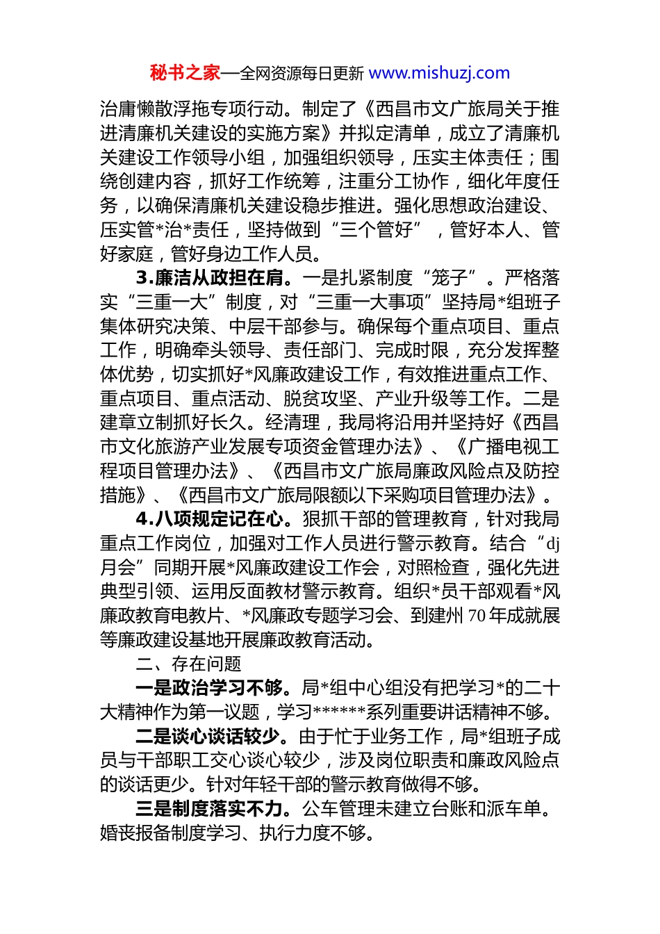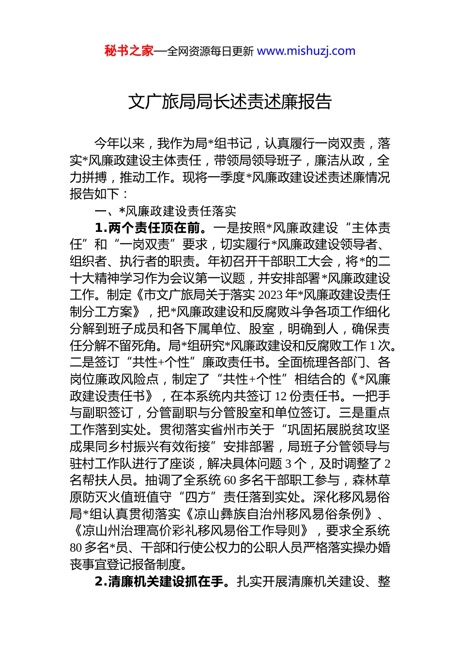 秘书之家—全网资源每日更新 www.mishuzj.com文广旅局局长述责述廉报告 今年以来,我作为局*组书记,认真履行一岗双责,落实*风廉政建设主体责任,带领局领导班子,廉洁从政,全力拼搏,推动工作。现将一季度*风廉政建设述责述廉情况报告如下:一、*风廉政建设责任落实1.两个责任顶在前。一是按照*风廉政建设“主体责任”和“一岗双责”要求,切实履行*风廉政建设领导者、组织者、执行者的职责。年初召开干部职工大会,将*的二十大精神学习作为会议第一议题,并安排部署*风廉政建设工作。制定《市文广旅局关于落实 2023 年*风廉政建设责任制分工方案》,把*风廉政建设和反腐败斗争各项工作细化分解到班子成员和各下属单位、股室,明确到人,确保责任分解不留死角。局*组研究*风廉政建设和反腐败工作 1 次。二是签订“共性+个性”廉政责任书。全面梳理各部门、各岗位廉政风险点,制定了“共性+个性”相结合的《*风廉政建设责任书》,在本系统内共签订 12 份责任书。一把手与副职签订,分管副职与分管股室和单位签订。三是重点工作落到实处。贯彻落实省州市关于“巩固拓展脱贫攻坚成果同乡村振兴有效衔接”安排部署,局班子分管领导与驻村工作队进行了座谈,解决具体问题 3 个,及时调整了 2名帮扶人员。抽调了全系统 60 多名干部职工参与,森林草原防灭火值班值守“四方”责任落到实处。深化移风易俗局*组认真贯彻落实《凉山彝族自治州移风易俗条例》、《凉山州治理高价彩礼移风易俗工作导则》,要求全系统80 多名*员、干部和行使公权力的公职人员严格落实操办婚丧事宜登记报备制度。2.清廉机关建设抓在手。扎实开展清廉机关建设、整秘书之家—全网资源每日更新 www.mishuzj.com治庸懒散浮拖专项行动。制定了《西昌市文广旅局关于推进清廉机关建设的实施方案》并拟定清单,成立了清廉机关建设工作领导小组,加强组织领导,压实主体责任;围绕创建内容,抓好工作统筹,注重分工协作,细化年度任务,以确保清廉机关建设稳步推进。强化思想政治建设、压实管*治*责任,坚持做到“三个管好”,管好本人、管好家庭,管好身边工作人员。3.廉洁从政担在肩。一是扎紧制度“笼子”。严格落实“三重一大”制度,对“三重一大事项”坚持局*组班子集体研究决策、中层干部参与。确保每个重点项目、重点工作,明确牵头领导、责任部门、完成时限,充分发挥整体优势,切实抓好*风廉政建设工作,有效推进重点工作、重点项目、重点活动、脱贫攻坚、产业升级等工作。二是建章立制抓好长久。经清理,我局将沿用并坚持好《西昌市文化旅游产业发展专项资金管理办法》、《广播电视工程项目管理办法》、《西昌市文广旅局廉政风险点及防控措施》、《西昌市文广旅局限额以下采购项目管理办法》。4.八项规定记在心。狠抓干部的管理教育,针对我局重点工作岗位,加强对工作人员进行警示教育。结合“dj月会”同期开展*风廉政建设工作会,对照检查,强化先进典型引领、运用反面教材警示教育。组织*员干部观看*风廉政教育电教片、*风廉政专题学习会、到建州 70 年成就展等廉政建设基地开展廉政教育活动。二、存在问题一是政治学习不够。局*组中心组没有把学习*的二十大精神作为第一议题,学习******系列重要讲话精神不够。二是谈心谈话较少。由于忙于业务工作,局*组班子成员与干部职工交心谈心较少,涉及岗位职责和廉政风险点的谈话更少。针对年轻干部的警示教育做得不够。三是制度落实不力。公车管理未建立台账和派车单。婚丧报备制度学习、执行力度不够。秘书之家—全网资源每日更新 www.mishuzj.com四是工作激情不高。随着对干部队伍要求越来越严,少数职工对作风建设新常态不太适应,工作缺乏主动性和奉献精神,不愿承担额外工作。三、今后打算一要认真履行政治领导责任。坚持*的领导,旗帜鲜明讲政治,始终坚持正确政治方向,重大事项及时向市委、市政府请示报告。严格按照市委要求,开展好清廉机关建设,推动全面从严治*向纵深发展,聚焦规矩意识、纪法观念淡薄问题,加大*章*规 dj 和宪法法律法规学习教育,将学习*的二十大精神作为*组中心组学习第一议题。进一步巩固市文旅行业风清气正...