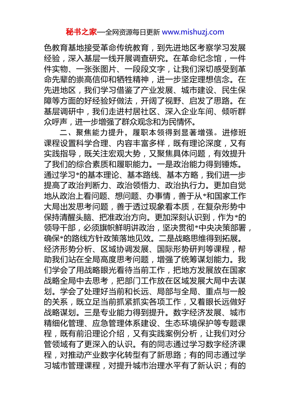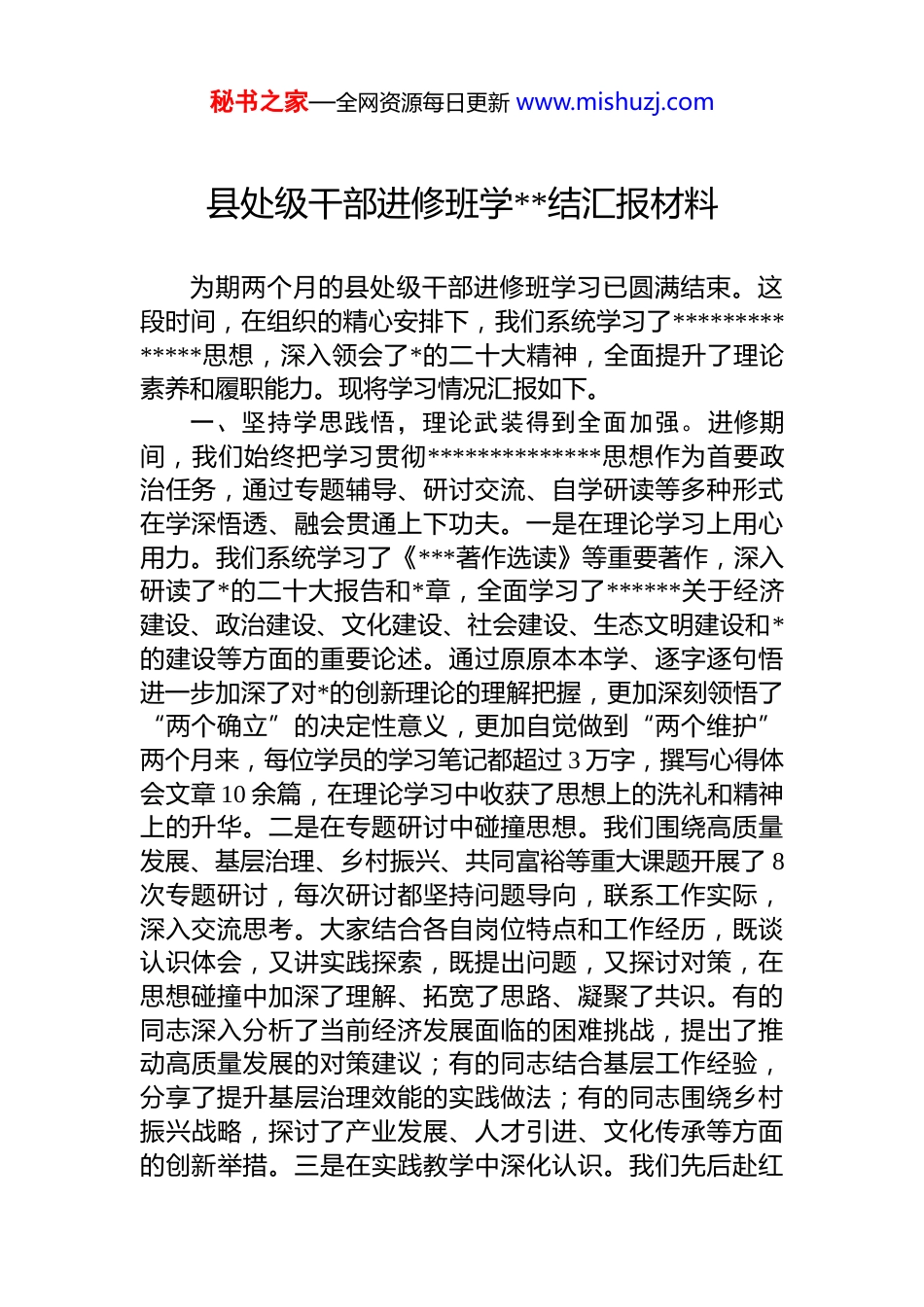 秘书之家—全网资源每日更新 www.mishuzj.com县处级干部进修班学**结汇报材料为期两个月的县处级干部进修班学习已圆满结束。这段时间,在组织的精心安排下,我们系统学习了**************思想,深入领会了*的二十大精神,全面提升了理论素养和履职能力。现将学习情况汇报如下。一、坚持学思践悟,理论武装得到全面加强。进修期间,我们始终把学习贯彻**************思想作为首要政治任务,通过专题辅导、研讨交流、自学研读等多种形式在学深悟透、融会贯通上下功夫。一是在理论学习上用心用力。我们系统学习了《***著作选读》等重要著作,深入研读了*的二十大报告和*章,全面学习了******关于经济建设、政治建设、文化建设、社会建设、生态文明建设和*的建设等方面的重要论述。通过原原本本学、逐字逐句悟进一步加深了对*的创新理论的理解把握,更加深刻领悟了“两个确立”的决定性意义,更加自觉做到“两个维护”两个月来,每位学员的学习笔记都超过 3 万字,撰写心得体会文章 10 余篇,在理论学习中收获了思想上的洗礼和精神上的升华。二是在专题研讨中碰撞思想。我们围绕高质量发展、基层治理、乡村振兴、共同富裕等重大课题开展了 8次专题研讨,每次研讨都坚持问题导向,联系工作实际,深入交流思考。大家结合各自岗位特点和工作经历,既谈认识体会,又讲实践探索,既提出问题,又探讨对策,在思想碰撞中加深了理解、拓宽了思路、凝聚了共识。有的同志深入分析了当前经济发展面临的困难挑战,提出了推动高质量发展的对策建议;有的同志结合基层工作经验,分享了提升基层治理效能的实践做法;有的同志围绕乡村振兴战略,探讨了产业发展、人才引进、文化传承等方面的创新举措。三是在实践教学中深化认识。我们先后赴红秘书之家—全网资源每日更新 www.mishuzj.com色教育基地接受革命传统教育,到先进地区考察学习发展经验,深入基层一线开展调查研究。在革命纪念馆,一件件实物、一张张图片、一段段文字,让我们深切感受到革命先辈的崇高信仰和牺牲精神,进一步坚定理想信念。在先进地区,我们学习借鉴了产业发展、城市建设、民生保障等方面的好经验好做法,开阔了视野、启发了思路。在基层调研中,我们走进村居社区、深入企业车间、倾听群众呼声,进一步增强了群众观念和为民情怀。二、聚焦能力提升,履职本领得到显著增强。进修班课程设置科学合理、内容丰富多样,既有理论深度,又有实践指导,既关注宏观大势,又聚焦具体问题,有效提升了我们的综合素质和履职能力。一是政治能力得到锤炼。通过学习*的基本理论、基本路线、基本方略,我们进一步提高了政治判断力、政治领悟力、政治执行力。更加自觉地从政治上看问题、想问题、办事情,善于从*和国家工作大局出发思考问题,善于透过现象看本质,在复杂形势中保持清醒头脑、把准政治方向。更加深刻认识到,作为*的领导干部,必须旗帜鲜明讲政治,坚决贯彻*中央决策部署,确保*的路线方针政策落地见效。二是战略思维得到拓展。经济形势分析、区域协调发展、国际形势研判等课程,帮助我们站在全局高度思考问题,增强了统筹谋划能力。我们学会了用战略眼光看待当前工作,把地方发展放在国家战略全局中去思考,把部门工作放在区域发展大局中去谋划。学会了处理好当前和长远、局部与全局、重点与一般的关系,既立足当前抓紧抓实各项工作,又着眼长远做好战略谋划。三是专业能力得到提升。数字经济发展、城市精细化管理、应急管理体系建设、生态环境保护等专题课程,既有前沿理论介绍,又有实践案例分析,让我们对分管领域有了更深入的认识。有的同志通过学习数字经济课程,对推动产业数字化转型有了新思路;有的同志通过学习城市管理课程,对提升城市治理水平有了新认识;有的秘书之家—全网资源每日更新 www.mishuzj.com同志通过学习应急管理课程,对完善应急处置机制有了新想法。这些专业知识的学习,为我们更好履行岗位职责打下了坚实基础。四是工作方法得到改进。领导科学与艺术公共危机管理、媒体沟通技巧等课程,帮助我们掌握了科学的工作方法。我们学会了运用系统思维处理复杂问题,学会了用法治思维和法治方式推动工...