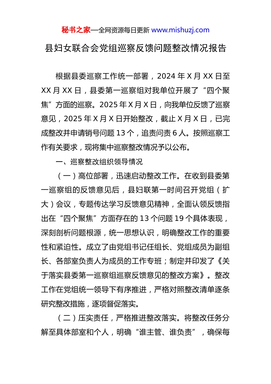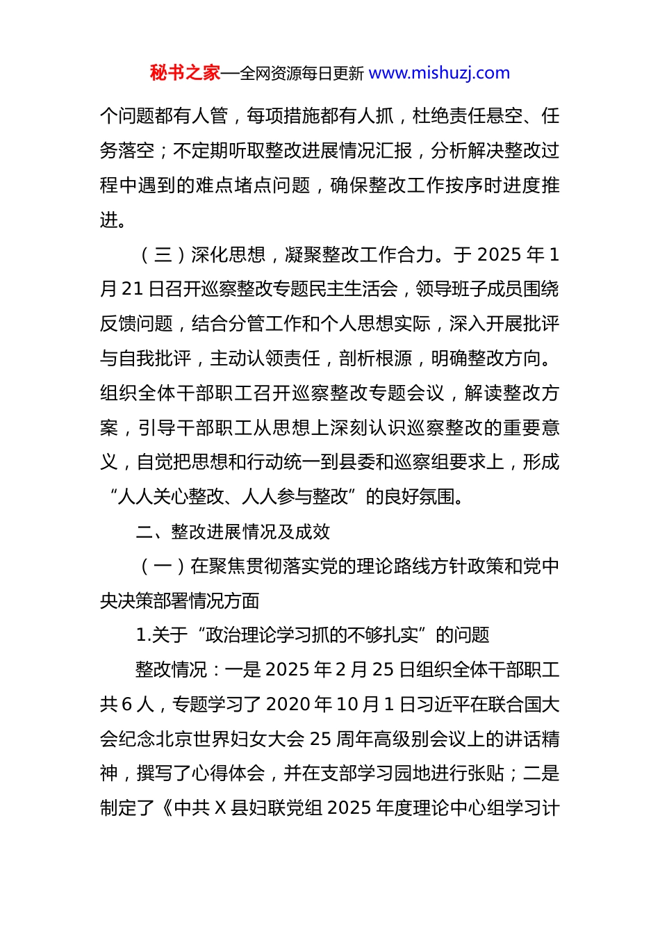 秘书之家—全网资源每日更新 www.mishuzj.com县妇女联合会党组巡察反馈问题整改情况报告 根据县委巡察工作统一部署,2024 年 X 月 XX 日至XX 月 XX 日,县委第一巡察组对我单位开展了“四个聚焦”方面的巡察。2025 年 X 月 X 日,向我单位反馈了巡察意见,2025 年 X 月 X 日开始整改,截止 X 月 X 日,已完成整改并申请销号问题 13 个,追责问责 6 人。按照巡察工作有关要求,现将集中巡察整改情况予以公布。一、巡察整改组织领导情况(一)高位部署,迅速启动整改工作。在收到县委第一巡察组的反馈意见后,县妇联第一时间召开党组(扩大)会议,专题传达学习反馈意见精神,全面认领反馈指出在“四个聚焦”方面存在的 13 个问题 19 个具体表现,深刻剖析问题根源,统一思想认识,明确整改工作的重要性和紧迫性。成立了由党组书记任组长、党组成员为副组长、各部室负责人为成员的工作专班;制定并印发了《关于落实县委第一巡察组巡察反馈意见的整改方案》。整改工作在党组统一领导下有序推进,严格对照整改清单逐条研究整改措施,逐项督促落实。(二)压实责任,严格推进整改落实。将整改任务分解至具体部室和个人,明确“谁主管、谁负责”,确保每秘书之家—全网资源每日更新 www.mishuzj.com个问题都有人管,每项措施都有人抓,杜绝责任悬空、任务落空;不定期听取整改进展情况汇报,分析解决整改过程中遇到的难点堵点问题,确保整改工作按序时进度推进。(三)深化思想,凝聚整改工作合力。于 2025 年 1月 21 日召开巡察整改专题民主生活会,领导班子成员围绕反馈问题,结合分管工作和个人思想实际,深入开展批评与自我批评,主动认领责任,剖析根源,明确整改方向。组织全体干部职工召开巡察整改专题会议,解读整改方案,引导干部职工从思想上深刻认识巡察整改的重要意义,自觉把思想和行动统一到县委和巡察组要求上,形成“人人关心整改、人人参与整改”的良好氛围。二、整改进展情况及成效(一)在聚焦贯彻落实党的理论路线方针政策和党中央决策部署情况方面1.关于“政治理论学习抓的不够扎实”的问题整改情况:一是 2025 年 2 月 25 日组织全体干部职工共 6 人,专题学习了 2020 年 10 月 1 日习近平在联合国大会纪念北京世界妇女大会 25 周年高级别会议上的讲话精神,撰写了心得体会,并在支部学习园地进行张贴;二是制定了《中共 X 县妇联党组 2025 年度理论中心组学习计秘书之家—全网资源每日更新 www.mishuzj.com划》,严格落实理论中心组学习研讨制度。2025 年元月至4 月份根据中心组学习计划学习并开展研讨;三是具体负责人同志就“落实理论学习中心组集体研讨制度不够到位”问题作了深刻书面检讨。2.关于“推动‘三新’领域妇联组织建设不够有力”的问题整改情况:一是 2025 年 3 月 17 日,组织全体机关干部召开党组(扩大)会议,认真学习了省、市妇联关于三新领域建立妇联组织的相关文件精神并做了好学习笔记;二是自 2024 年 11 月至 2025 年 4 月,在快递行业、外卖行业等新兴就业群体建立妇联组织。3.关于“落实家庭教育工作有欠缺”的问题整改情况:一是制定了《X 县家庭教育研究会 2025 年度工作计划》、《X 县妇联开展家庭教育指导服务下基层活动方案》,并按月列出了活动清单。二是根据年度工作计划和活动方案开展系列家庭家教家风活动;三是分管家儿部工作的同志就关于“利用基地开展家庭教育活动不够”的问题对具体负责同志进行了提醒谈话。4.关于“发动妇女参加职业技能培训不够有力”的问题整改情况:一是在“二乔女性”微信公众号发布嘉年华手工编织培训活动宣传报道;二是联合相关单位、社会秘书之家—全网资源每日更新 www.mishuzj.com组织开展各类职业技能培训。5.关于“未按规定要求报告机构编制运行情况”的问题整改情况:一是相关责任人集中学习了《X 省机构编制报告制度实施细则(试行)》,并认真做好了学习笔记。二是及时向县机构编制委员会报告了 2024 年度机构编制运行情况。并做好县妇联及妇女儿童服务中心的分工调整,将分工职责明确到人到岗。三...