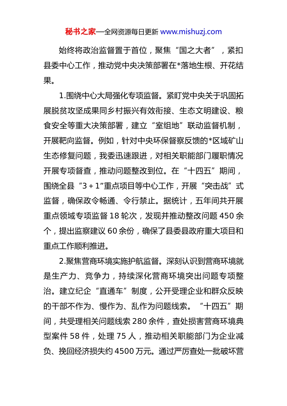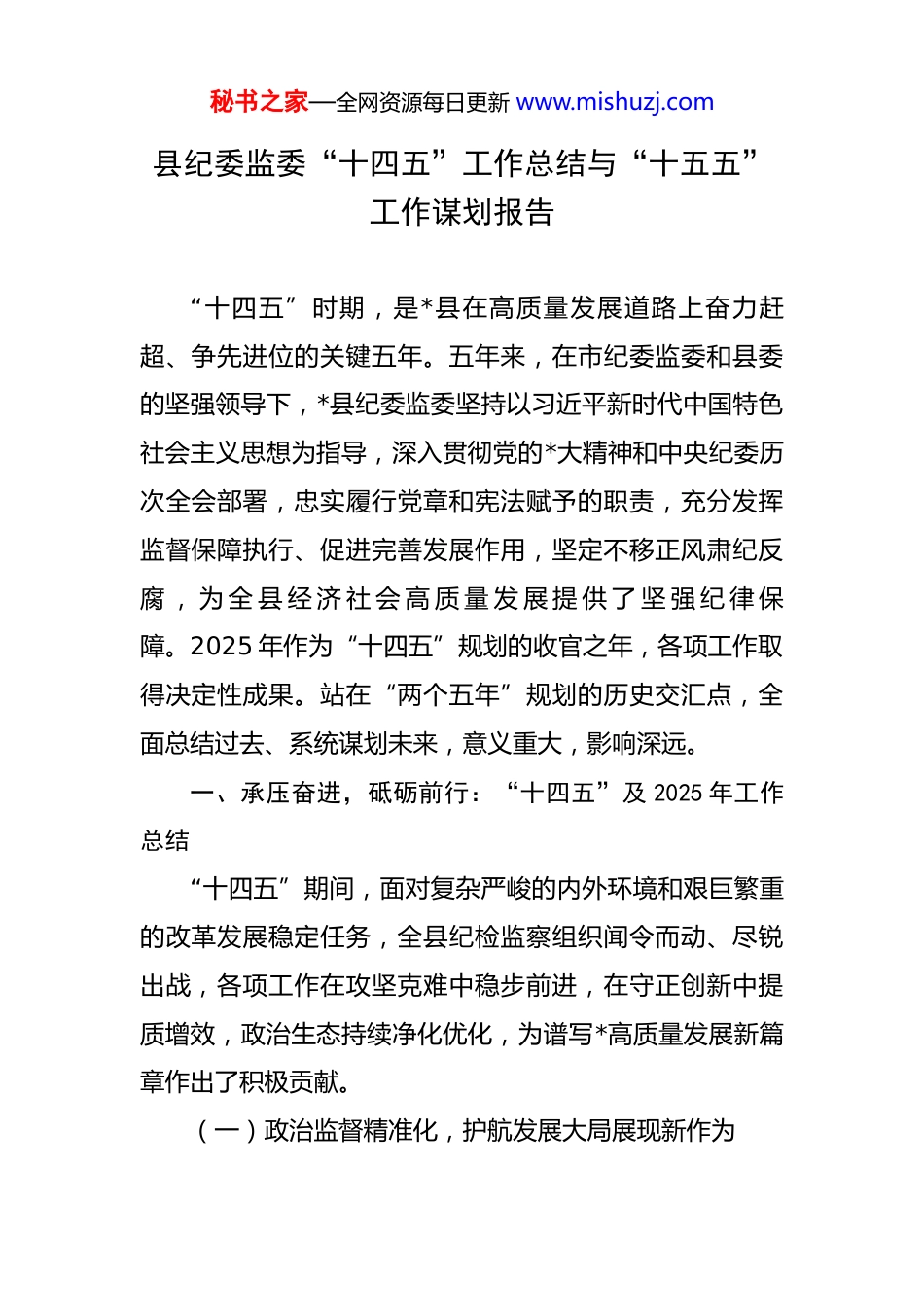 秘书之家—全网资源每日更新 www.mishuzj.com县纪委监委“十四五”工作总结与“十五五”工作谋划报告 “十四五”时期,是*县在高质量发展道路上奋力赶超、争先进位的关键五年。五年来,在市纪委监委和县委的坚强领导下,*县纪委监委坚持以习近平新时代中国特色社会主义思想为指导,深入贯彻党的*大精神和中央纪委历次全会部署,忠实履行党章和宪法赋予的职责,充分发挥监督保障执行、促进完善发展作用,坚定不移正风肃纪反腐 , 为 全 县 经 济 社 会 高 质 量 发 展 提 供 了 坚 强 纪 律 保障。2025 年作为“十四五”规划的收官之年,各项工作取得决定性成果。站在“两个五年”规划的历史交汇点,全面总结过去、系统谋划未来,意义重大,影响深远。一、承压奋进,砥砺前行:“十四五”及 2025 年工作总结“十四五”期间,面对复杂严峻的内外环境和艰巨繁重的改革发展稳定任务,全县纪检监察组织闻令而动、尽锐出战,各项工作在攻坚克难中稳步前进,在守正创新中提质增效,政治生态持续净化优化,为谱写*高质量发展新篇章作出了积极贡献。(一)政治监督精准化,护航发展大局展现新作为秘书之家—全网资源每日更新 www.mishuzj.com始终将政治监督置于首位,聚焦“国之大者”,紧扣县委中心工作,推动党中央决策部署在*落地生根、开花结果。1.围绕中心大局强化专项监督。紧盯党中央关于巩固拓展脱贫攻坚成果同乡村振兴有效衔接、生态文明建设、粮食安全等重大决策部署,建立“室组地”联动监督机制,开展靶向监督。例如,针对中央环保督察反馈的*区域矿山生态修复问题,我委迅速跟进,对相关职能部门履职情况开展专项督查,推动问题整改到位。在“十四五”期间,围绕全县“3+1”重点项目等中心工作,开展“突击战”式监督,确保政令畅通、令行禁止。据统计,五年间共开展重点领域专项监督 18 轮次,发现并推动整改问题 450 余个,提出监察建议 60 余份,确保了县委县政府重大项目和重点工作顺利推进。2.聚焦营商环境实施护航监督。深刻认识到营商环境就是生产力、竞争力,持续深化营商环境突出问题专项整治。建立纪企“直通车”制度,公开受理企业和群众反映的干部不作为、慢作为、乱作为问题线索。“十四五”期间,共受理相关问题线索 280 余件,查处损害营商环境典型案件 58 件,处理 75 人,推动相关职能部门为企业减负、挽回经济损失约 4500 万元。通过严厉查处一批破坏营秘书之家—全网资源每日更新 www.mishuzj.com商环境的典型案例,释放了为担当者担当、为干事者撑腰的强烈信号,有效提振了市场主体信心。3.立足职能职责做实日常监督。将监督融入日常、抓在经常,通过参加或列席党委(党组)会议、开展谈心谈话、实地走访调研等方式,做实做细对“一把手”和领导班子的近距离监督。特别是在“十四五”前期的疫情防控大战大考中,全县纪检监察干部下沉一线,监督推动疫情防控政策落实落细,为打赢疫情防控阻击战提供了坚强保障。进入后疫情时代,监督重点迅速转向保障经济社会秩序全面恢复。五年来,全县纪检监察组织累计开展日常监督检查 3000 余次,运用“第一种形态”批评教育帮助1600 余人次,抓早抓小、防微杜渐的效果日益彰显。(二)惩贪治腐高压化,一体推进“三不腐”取得新成效坚持无禁区、全覆盖、零容忍,坚持重遏制、强高压、长震慑,一体推进不敢腐、不能腐、不想腐,反腐败斗争压倒性胜利全面巩固并不断深化。1.保持惩治力度始终不减。坚持有案必查、有腐必惩,案件查办数量和质量稳步提升。基于现有数据的合理推演,“十四五”期间全县纪检监察机关共接收信访举报约2100 件次,处置问题线索约 2800 件,累计立案审查调查秘书之家—全网资源每日更新 www.mishuzj.com650 余件,给予党纪政务处分 670 余人,移送司法机关 35人。其中,2024 年立案 140 人,给予党纪政务处分 149人,预计 2025 年全年立案数将突破 150 件,持续形成强大震慑。通过严肃查处一批在工程建设、国资国企、公共资源交易等重点领域的腐败案件,累计为国家挽回经济损失超过 1.2 亿元,惩的震慑与治的效能得到充分发挥...