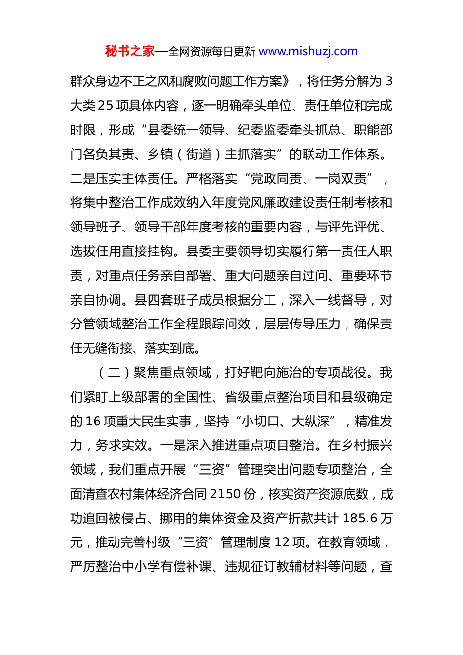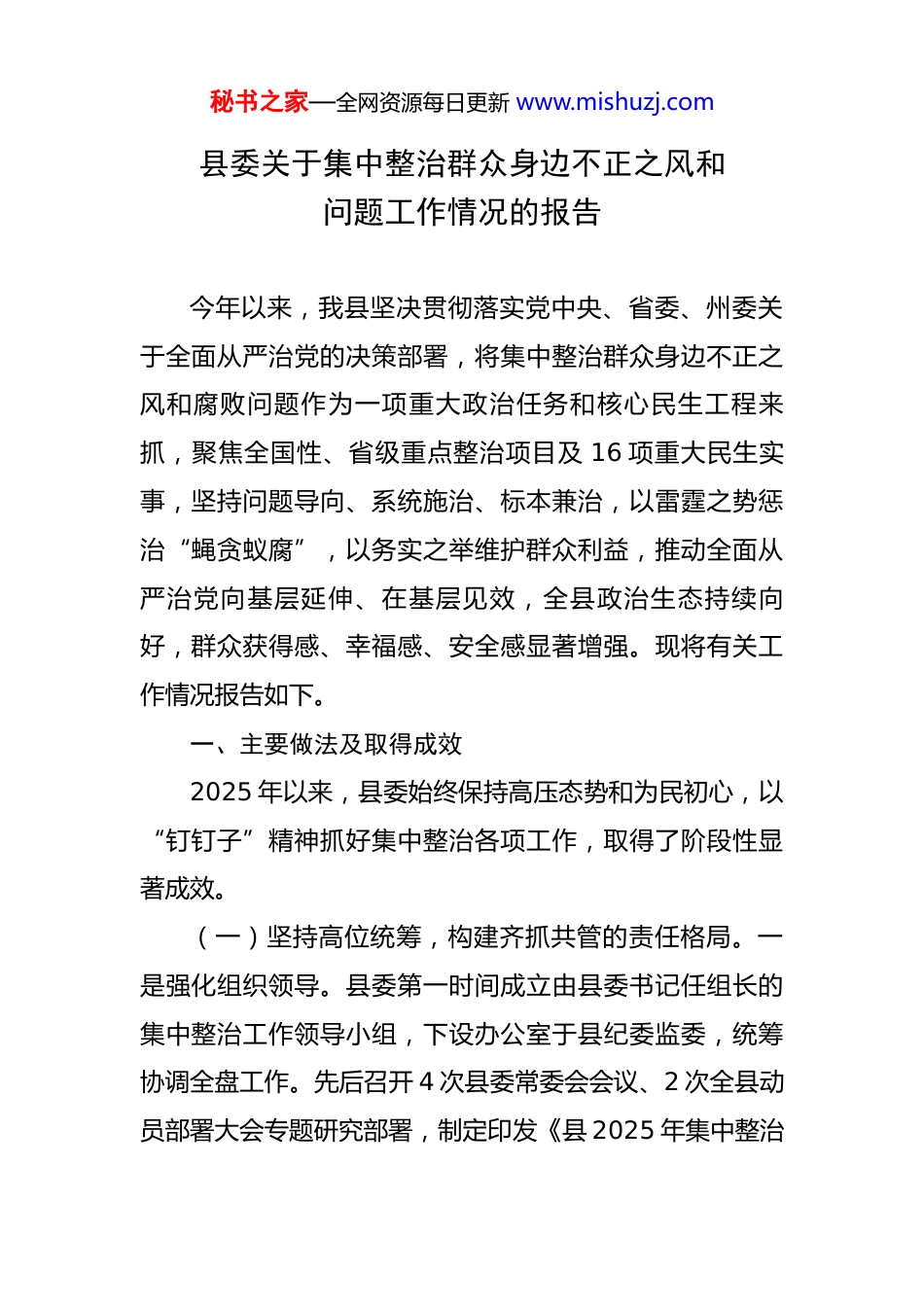 秘书之家—全网资源每日更新 www.mishuzj.com县委关于集中整治群众身边不正之风和问题工作情况的报告 今年以来,我县坚决贯彻落实党中央、省委、州委关于全面从严治党的决策部署,将集中整治群众身边不正之风和腐败问题作为一项重大政治任务和核心民生工程来抓,聚焦全国性、省级重点整治项目及 16 项重大民生实事,坚持问题导向、系统施治、标本兼治,以雷霆之势惩治“蝇贪蚁腐”,以务实之举维护群众利益,推动全面从严治党向基层延伸、在基层见效,全县政治生态持续向好,群众获得感、幸福感、安全感显著增强。现将有关工作情况报告如下。一、主要做法及取得成效2025 年以来,县委始终保持高压态势和为民初心,以“钉钉子”精神抓好集中整治各项工作,取得了阶段性显著成效。(一)坚持高位统筹,构建齐抓共管的责任格局。一是强化组织领导。县委第一时间成立由县委书记任组长的集中整治工作领导小组,下设办公室于县纪委监委,统筹协调全盘工作。先后召开 4 次县委常委会会议、2 次全县动员部署大会专题研究部署,制定印发《县 2025 年集中整治秘书之家—全网资源每日更新 www.mishuzj.com群众身边不正之风和腐败问题工作方案》,将任务分解为 3大类 25 项具体内容,逐一明确牵头单位、责任单位和完成时限,形成“县委统一领导、纪委监委牵头抓总、职能部门各负其责、乡镇(街道)主抓落实”的联动工作体系。二是压实主体责任。严格落实“党政同责、一岗双责”,将集中整治工作成效纳入年度党风廉政建设责任制考核和领导班子、领导干部年度考核的重要内容,与评先评优、选拔任用直接挂钩。县委主要领导切实履行第一责任人职责,对重点任务亲自部署、重大问题亲自过问、重要环节亲自协调。县四套班子成员根据分工,深入一线督导,对分管领域整治工作全程跟踪问效,层层传导压力,确保责任无缝衔接、落实到底。(二)聚焦重点领域,打好靶向施治的专项战役。我们紧盯上级部署的全国性、省级重点整治项目和县级确定的 16 项重大民生实事,坚持“小切口、大纵深”,精准发力,务求实效。一是深入推进重点项目整治。在乡村振兴领域,我们重点开展“三资”管理突出问题专项整治,全面清查农村集体经济合同 2150 份,核实资产资源底数,成功追回被侵占、挪用的集体资金及资产折款共计 185.6 万元,推动完善村级“三资”管理制度 12 项。在教育领域,严厉整治中小学有偿补课、违规征订教辅材料等问题,查秘书之家—全网资源每日更新 www.mishuzj.com处相关问题 3 起,清退违规收费 7.8 万元。在医疗卫生领域,聚焦药品耗材采购、过度诊疗等问题,对全县 15 家公立医疗机构开展专项检查,发现并整改问题 21 个,处理相关责任人 8 名。二是全力保障民生实事落地。我们将集中整治与推动 16 项重大民生实事深度融合,以强有力监督保障项目顺利推进、资金安全高效。截至目前,全县 16 项重大民生实事已完成年度计划的 85%以上,累计投入资金12.6 亿元。其中,“城镇老旧小区改造”项目已完成 28个小区的改造任务,惠及居民 3500 余户;“农村公路提质改造”项目已新建和改扩建农村公路 110 公里,极大改善了边远山区群众的出行条件;“病险水库除险加固”工程已完成全部 5 座小型水库的加固任务,有效保障了下游近 2万名群众的生命财产安全。通过跟进监督,及时发现并纠正了项目实施过程中存在的进度滞后、程序不规范等问题15 个,确保民生工程真正成为民心工程。(三)保持高压震慑,亮出严查快办的惩腐利剑。我们坚持有案必查、有腐必惩,以“零容忍”态度坚决清除群众身边的“害群之马”。一是拓宽线索来源渠道。构建“信、访、网、电、微”五位一体的信访举报平台,在全县 180 个村(社区)设立“码上举报”二维码,实现群众监督“一键通”。同时,强化与审计、财政、公安、巡察秘书之家—全网资源每日更新 www.mishuzj.com等部门的协作配合,建立问题线索移送和信息共享机制,变“被动受理”为“主动出击”。今年以来,共收到群众信访举报 240 件次,部门移送问题线索 58 条。二是提升案件查办质效。对群众反映强烈、社会影响...