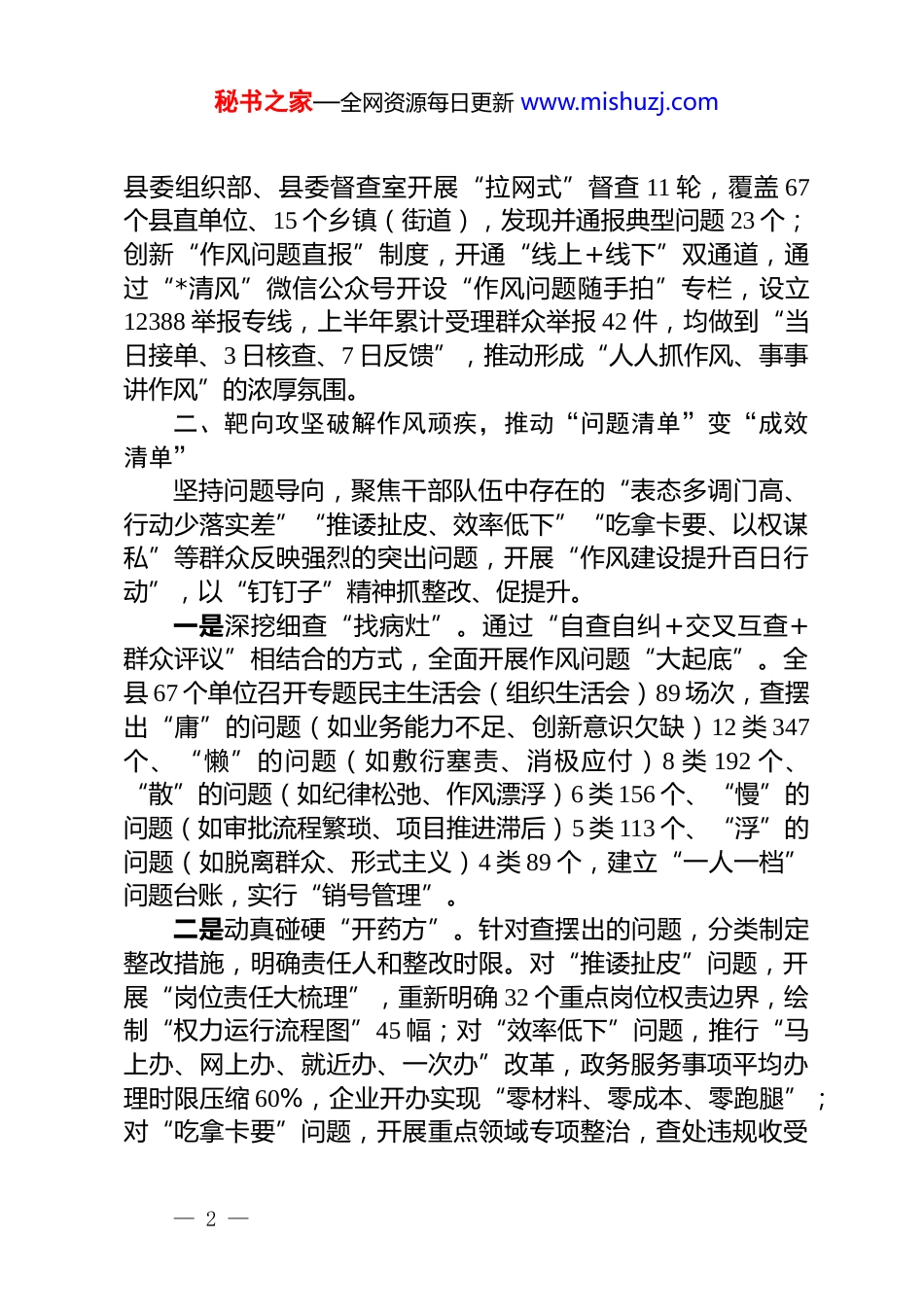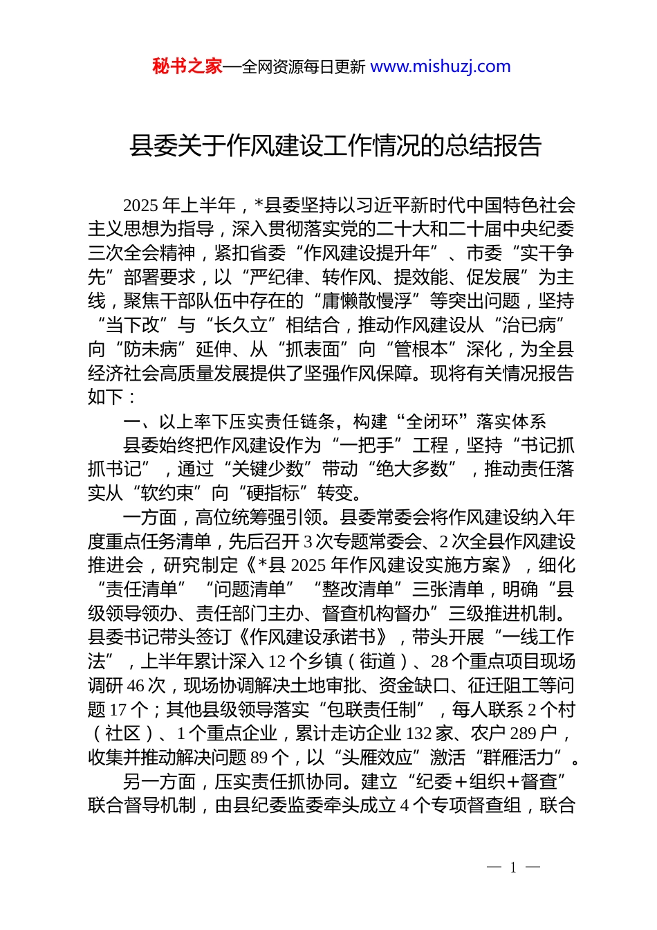 秘书之家—全网资源每日更新 www.mishuzj.com 县委关于作风建设工作情况的总结报告2025 年上半年,*县委坚持以习近平新时代中国特色社会主义思想为指导,深入贯彻落实党的二十大和二十届中央纪委三次全会精神,紧扣省委“作风建设提升年”、市委“实干争先”部署要求,以“严纪律、转作风、提效能、促发展”为主线,聚焦干部队伍中存在的“庸懒散慢浮”等突出问题,坚持“当下改”与“长久立”相结合,推动作风建设从“治已病”向“防未病”延伸、从“抓表面”向“管根本”深化,为全县经济社会高质量发展提供了坚强作风保障。现将有关情况报告如下:一、以上率下压实责任链条,构建“全闭环”落实体系县委始终把作风建设作为“一把手”工程,坚持“书记抓抓书记”,通过“关键少数”带动“绝大多数”,推动责任落实从“软约束”向“硬指标”转变。一方面,高位统筹强引领。县委常委会将作风建设纳入年度重点任务清单,先后召开 3 次专题常委会、2 次全县作风建设推进会,研究制定《*县 2025 年作风建设实施方案》,细化“责任清单”“问题清单”“整改清单”三张清单,明确“县级领导领办、责任部门主办、督查机构督办”三级推进机制。县委书记带头签订《作风建设承诺书》,带头开展“一线工作法”,上半年累计深入 12 个乡镇(街道)、28 个重点项目现场调研 46 次,现场协调解决土地审批、资金缺口、征迁阻工等问题 17 个;其他县级领导落实“包联责任制”,每人联系 2 个村(社区)、1 个重点企业,累计走访企业 132 家、农户 289 户,收集并推动解决问题 89 个,以“头雁效应”激活“群雁活力”。另一方面,压实责任抓协同。建立“纪委+组织+督查”联合督导机制,由县纪委监委牵头成立 4 个专项督查组,联合— 1 —秘书之家—全网资源每日更新 www.mishuzj.com县委组织部、县委督查室开展“拉网式”督查 11 轮,覆盖 67个县直单位、15 个乡镇(街道),发现并通报典型问题 23 个;创新“作风问题直报”制度,开通“线上+线下”双通道,通过“*清风”微信公众号开设“作风问题随手拍”专栏,设立12388 举报专线,上半年累计受理群众举报 42 件,均做到“当日接单、3 日核查、7 日反馈”,推动形成“人人抓作风、事事讲作风”的浓厚氛围。二、靶向攻坚破解作风顽疾,推动“问题清单”变“成效清单”坚持问题导向,聚焦干部队伍中存在的“表态多调门高、行动少落实差”“推诿扯皮、效率低下”“吃拿卡要、以权谋私”等群众反映强烈的突出问题,开展“作风建设提升百日行动”,以“钉钉子”精神抓整改、促提升。一是深挖细查“找病灶”。通过“自查自纠+交叉互查+群众评议”相结合的方式,全面开展作风问题“大起底”。全县 67 个单位召开专题民主生活会(组织生活会)89 场次,查摆出“庸”的问题(如业务能力不足、创新意识欠缺)12 类 347个、“懒”的问题(如敷衍塞责、消极应付)8 类 192 个、“散”的问题(如纪律松弛、作风漂浮)6 类 156 个、“慢”的问题(如审批流程繁琐、项目推进滞后)5 类 113 个、“浮”的问题(如脱离群众、形式主义)4 类 89 个,建立“一人一档”问题台账,实行“销号管理”。二是动真碰硬“开药方”。针对查摆出的问题,分类制定整改措施,明确责任人和整改时限。对“推诿扯皮”问题,开展“岗位责任大梳理”,重新明确 32 个重点岗位权责边界,绘制“权力运行流程图”45 幅;对“效率低下”问题,推行“马上办、网上办、就近办、一次办”改革,政务服务事项平均办理时限压缩 60%,企业开办实现“零材料、零成本、零跑腿”;对“吃拿卡要”问题,开展重点领域专项整治,查处违规收受— 2 —秘书之家—全网资源每日更新 www.mishuzj.com礼品礼金、违规接受宴请等问题 12 起,党纪政务处分 15 人,通报典型案例 6 起,形成有力震慑。三是举一反三“防复发”。坚持“整改一个问题、规范一类行为、完善一套制度”,针对督查中发现的“文风会风不实”问题,出台《*县党政机关公文处理规范》《全县性会议管理办法》,上半年文件、会议数量同比分别减少 18%、22%;针对“调研...