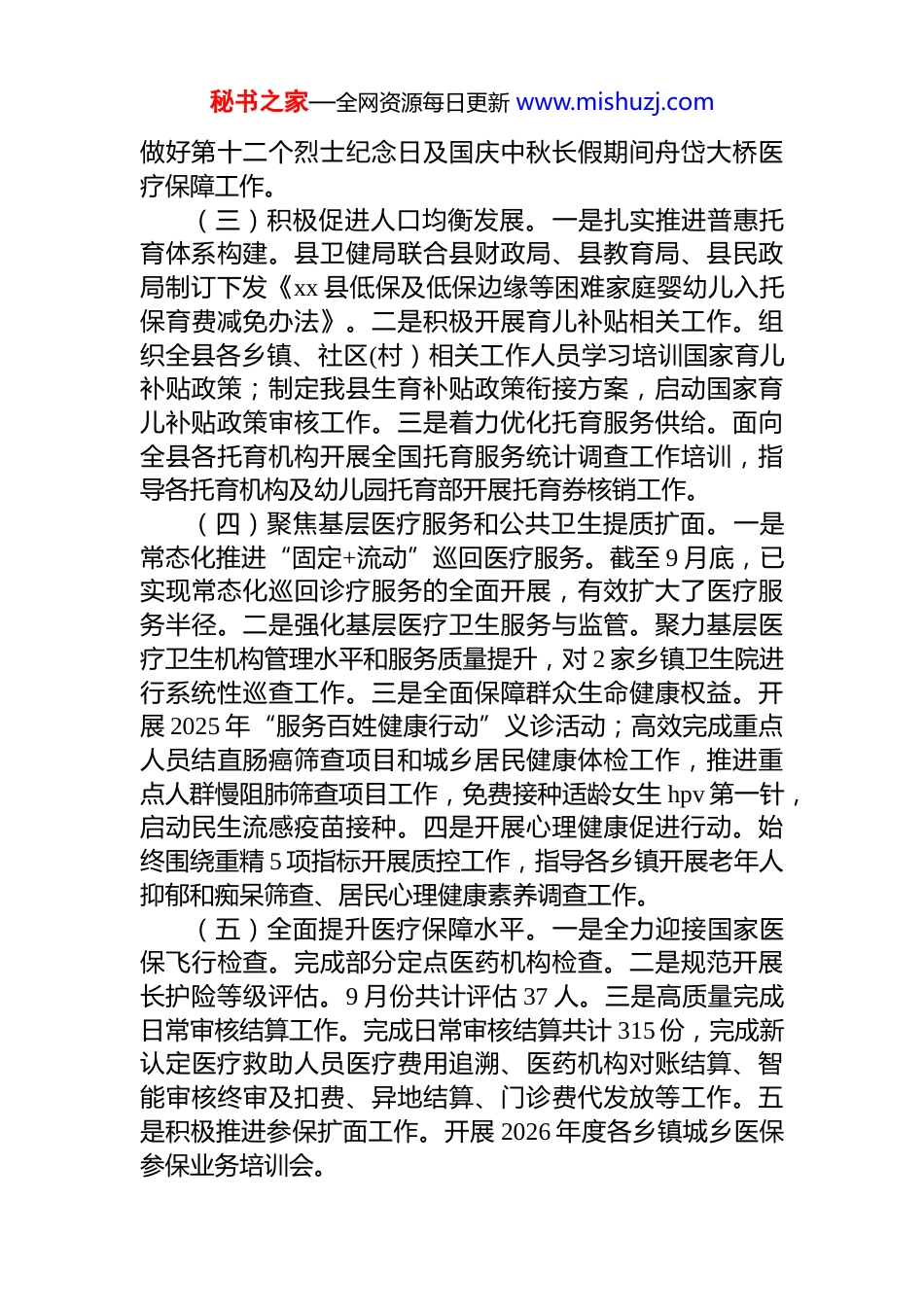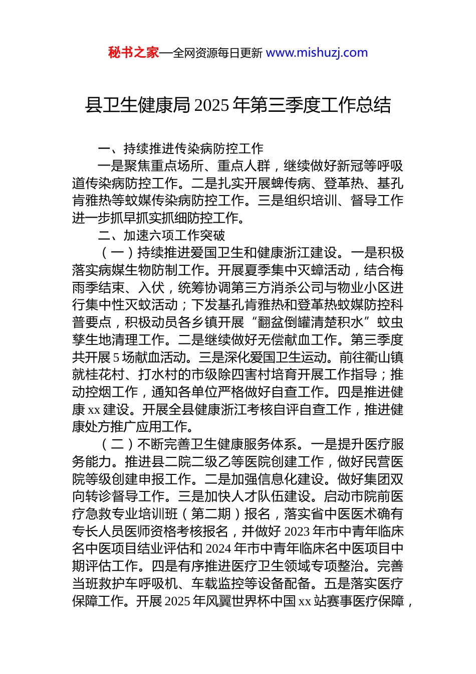 秘书之家—全网资源每日更新 www.mishuzj.com县卫生健康局 2025 年第三季度工作总结一、持续推进传染病防控工作一是聚焦重点场所、重点人群,继续做好新冠等呼吸道传染病防控工作。二是扎实开展蜱传病、登革热、基孔肯雅热等蚊媒传染病防控工作。三是组织培训、督导工作进一步抓早抓实抓细防控工作。二、加速六项工作突破(一)持续推进爱国卫生和健康浙江建设。一是积极落实病媒生物防制工作。开展夏季集中灭蟑活动,结合梅雨季结束、入伏,统筹协调第三方消杀公司与物业小区进行集中性灭蚊活动;下发基孔肯雅热和登革热蚊媒防控科普要点,积极动员各乡镇开展“翻盆倒罐清楚积水”蚊虫孳生地清理工作。二是继续做好无偿献血工作。第三季度共开展 5 场献血活动。三是深化爱国卫生运动。前往衢山镇就桂花村、打水村的市级除四害村培育开展工作指导;推动控烟工作,通知各单位严格做好自查工作。四是推进健康 xx 建设。开展全县健康浙江考核自评自查工作,推进健康处方推广应用工作。(二)不断完善卫生健康服务体系。一是提升医疗服务能力。推进县二院二级乙等医院创建工作,做好民营医院等级创建申报工作。二是加强信息化建设。做好集团双向转诊督导工作。三是加快人才队伍建设。启动市院前医疗急救专业培训班(第二期)报名,落实省中医医术确有专长人员医师资格考核报名,并做好 2023 年市中青年临床名中医项目结业评估和 2024 年市中青年临床名中医项目中期评估工作。四是有序推进医疗卫生领域专项整治。完善当班救护车呼吸机、车载监控等设备配备。五是落实医疗保障工作。开展 2025 年风翼世界杯中国 xx 站赛事医疗保障,秘书之家—全网资源每日更新 www.mishuzj.com做好第十二个烈士纪念日及国庆中秋长假期间舟岱大桥医疗保障工作。(三)积极促进人口均衡发展。一是扎实推进普惠托育体系构建。县卫健局联合县财政局、县教育局、县民政局制订下发《xx 县低保及低保边缘等困难家庭婴幼儿入托保育费减免办法》。二是积极开展育儿补贴相关工作。组织全县各乡镇、社区(村)相关工作人员学习培训国家育儿补贴政策;制定我县生育补贴政策衔接方案,启动国家育儿补贴政策审核工作。三是着力优化托育服务供给。面向全县各托育机构开展全国托育服务统计调查工作培训,指导各托育机构及幼儿园托育部开展托育券核销工作。(四)聚焦基层医疗服务和公共卫生提质扩面。一是常态化推进“固定+流动”巡回医疗服务。截至 9 月底,已实现常态化巡回诊疗服务的全面开展,有效扩大了医疗服务半径。二是强化基层医疗卫生服务与监管。聚力基层医疗卫生机构管理水平和服务质量提升,对 2 家乡镇卫生院进行系统性巡查工作。三是全面保障群众生命健康权益。开展 2025 年“服务百姓健康行动”义诊活动;高效完成重点人员结直肠癌筛查项目和城乡居民健康体检工作,推进重点人群慢阻肺筛查项目工作,免费接种适龄女生 hpv 第一针,启动民生流感疫苗接种。四是开展心理健康促进行动。始终围绕重精 5 项指标开展质控工作,指导各乡镇开展老年人抑郁和痴呆筛查、居民心理健康素养调查工作。(五)全面提升医疗保障水平。一是全力迎接国家医保飞行检查。完成部分定点医药机构检查。二是规范开展长护险等级评估。9 月份共计评估 37 人。三是高质量完成日常审核结算工作。完成日常审核结算共计 315 份,完成新认定医疗救助人员医疗费用追溯、医药机构对账结算、智能审核终审及扣费、异地结算、门诊费代发放等工作。五是积极推进参保扩面工作。开展 2026 年度各乡镇城乡医保参保业务培训会。秘书之家—全网资源每日更新 www.mishuzj.com(六)做深做实其他重点工作。一是按时完成提案建议主办件办理和答复工作。二是继续推进医疗卫生人才“县乡村一体”管理改革。三是做好公立医院医改控费关键指标和年度考核指标审核。