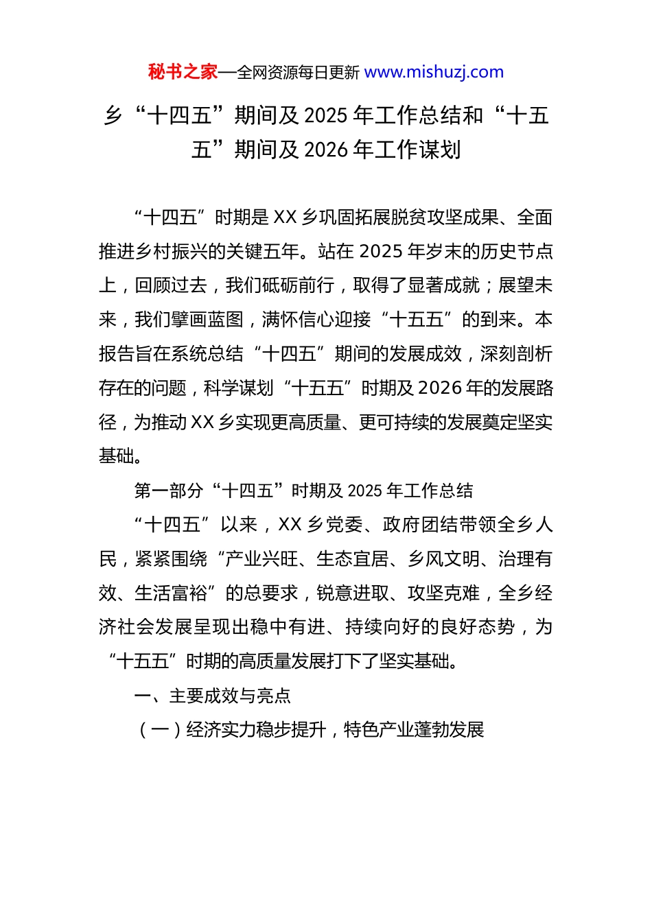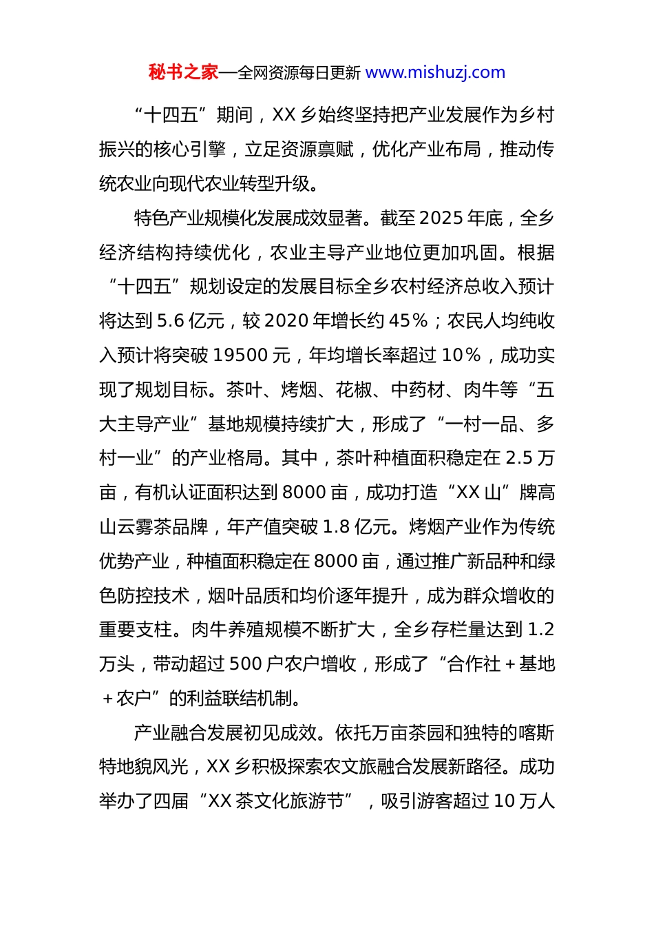 秘书之家—全网资源每日更新 www.mishuzj.com乡“十四五”期间及 2025 年工作总结和“十五五”期间及 2026 年工作谋划 “十四五”时期是 XX 乡巩固拓展脱贫攻坚成果、全面推进乡村振兴的关键五年。站在 2025 年岁末的历史节点上,回顾过去,我们砥砺前行,取得了显著成就;展望未来,我们擘画蓝图,满怀信心迎接“十五五”的到来。本报告旨在系统总结“十四五”期间的发展成效,深刻剖析存在的问题,科学谋划“十五五”时期及 2026 年的发展路径,为推动 XX 乡实现更高质量、更可持续的发展奠定坚实基础。第一部分“十四五”时期及 2025 年工作总结“十四五”以来,XX 乡党委、政府团结带领全乡人民,紧紧围绕“产业兴旺、生态宜居、乡风文明、治理有效、生活富裕”的总要求,锐意进取、攻坚克难,全乡经济社会发展呈现出稳中有进、持续向好的良好态势,为“十五五”时期的高质量发展打下了坚实基础。一、主要成效与亮点(一)经济实力稳步提升,特色产业蓬勃发展秘书之家—全网资源每日更新 www.mishuzj.com“十四五”期间,XX 乡始终坚持把产业发展作为乡村振兴的核心引擎,立足资源禀赋,优化产业布局,推动传统农业向现代农业转型升级。特色产业规模化发展成效显著。截至 2025 年底,全乡经济结构持续优化,农业主导产业地位更加巩固。根据“十四五”规划设定的发展目标全乡农村经济总收入预计将达到 5.6 亿元,较 2020 年增长约 45%;农民人均纯收入预计将突破 19500 元,年均增长率超过 10%,成功实现了规划目标。茶叶、烤烟、花椒、中药材、肉牛等“五大主导产业”基地规模持续扩大,形成了“一村一品、多村一业”的产业格局。其中,茶叶种植面积稳定在 2.5 万亩,有机认证面积达到 8000 亩,成功打造“XX 山”牌高山云雾茶品牌,年产值突破 1.8 亿元。烤烟产业作为传统优势产业,种植面积稳定在 8000 亩,通过推广新品种和绿色防控技术,烟叶品质和均价逐年提升,成为群众增收的重要支柱。肉牛养殖规模不断扩大,全乡存栏量达到 1.2万头,带动超过 500 户农户增收,形成了“合作社+基地+农户”的利益联结机制。产业融合发展初见成效。依托万亩茶园和独特的喀斯特地貌风光,XX 乡积极探索农文旅融合发展新路径。成功举办了四届“XX 茶文化旅游节”,吸引游客超过 10 万人秘书之家—全网资源每日更新 www.mishuzj.com次。“XX 茶旅一体化示范园”项目一期工程于 2024 年建成并投入运营,集茶叶采摘体验、茶文化展示、康养民宿于一体,年接待游客能力达 3 万人次,有效带动了当地餐饮、住宿及农产品销售,实现了“一片叶子”到“一个产业链”的延伸。同时,通过电商平台和直播带货等新模式,拓宽了花椒、蜂蜜等特色农产品的销售渠道,2025 年线上销售额预计突破 1500 万元。市场主体培育取得新进展。“十四五”期间,全乡累计培育新型农业经营主体 52 家,其中省级示范合作社 2家,市级龙头企业 3 家。这些市场主体在标准化生产、品牌化营销和农户带动方面发挥了重要作用,提升了全乡农业的组织化程度和市场竞争力。通过积极的就业帮扶政策和技能培训,累计实现农村劳动力转移就业 8000 余人次,务工收入成为农民增收的重要补充。(二)基础设施日臻完善,乡容村貌持续改善XX 乡坚持把基础设施建设作为改善民生、优化发展环境的先手棋,累计投入资金约 2.8 亿元,城乡面貌发生了深刻变化。交通网络不断优化。“十四五”期间,完成了乡域内主干道 XX 路的升级改造工程,实现了全乡 12 个行政村通硬化路率 100%。累计实施“组组通”硬化路项目 110 公秘书之家—全网资源每日更新 www.mishuzj.com里,极大改善了群众出行条件和农产品运输效率。乡镇客运站于 2023 年完成标准化改造,新增农村客运班线 3条,实现了村村通客车,打通了服务群众的“最后一公里”。水利和能源保障能力显著增强。完成了 5 个村的农村饮水安全巩固提升工程,受益人口达 1.1 万人,农村自来水普及率提升至 95%。实施了 3 座小型水库的除险加固工程,有效提升了农业灌溉和防汛抗旱能力。完成了农村电网升级改造...