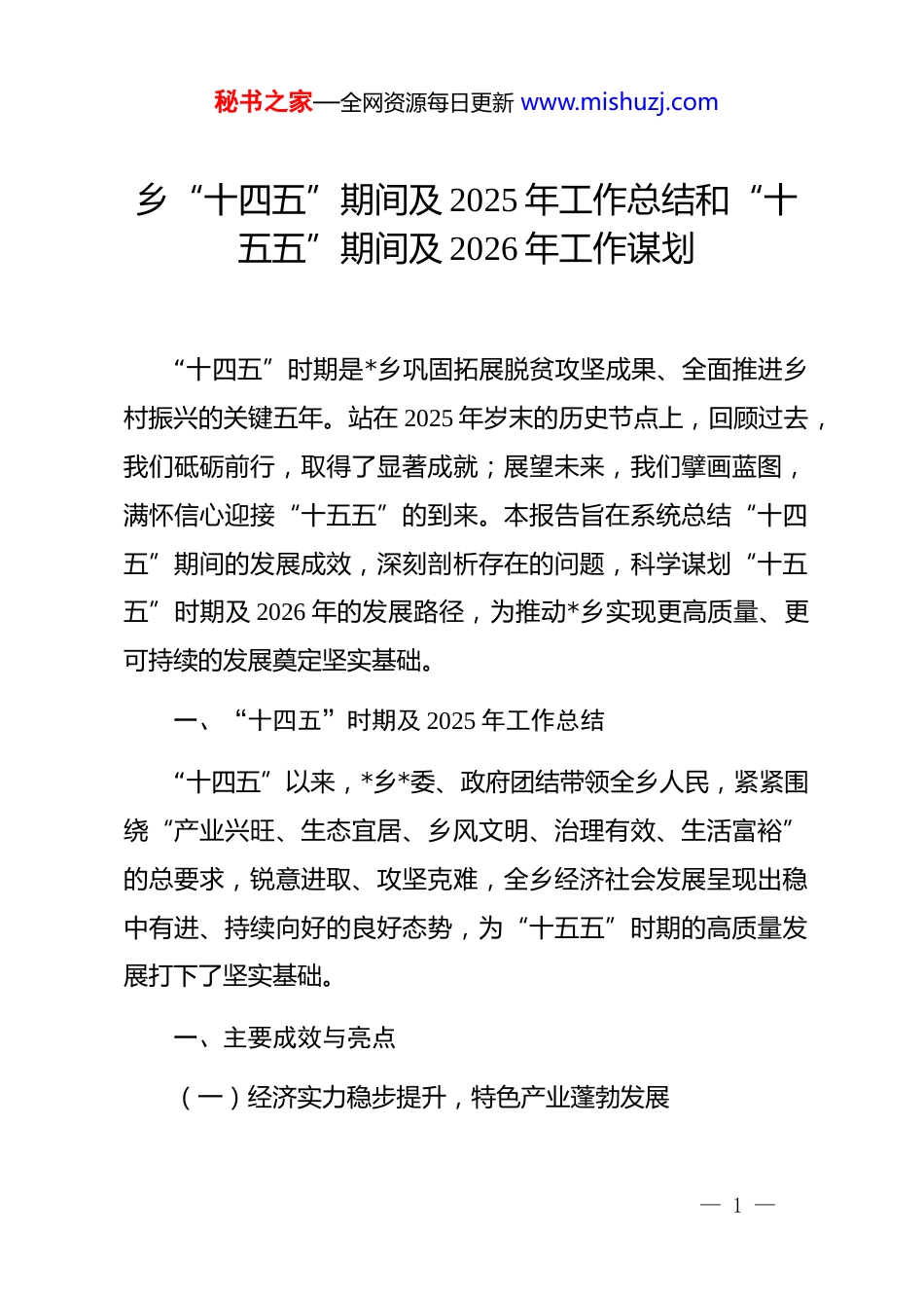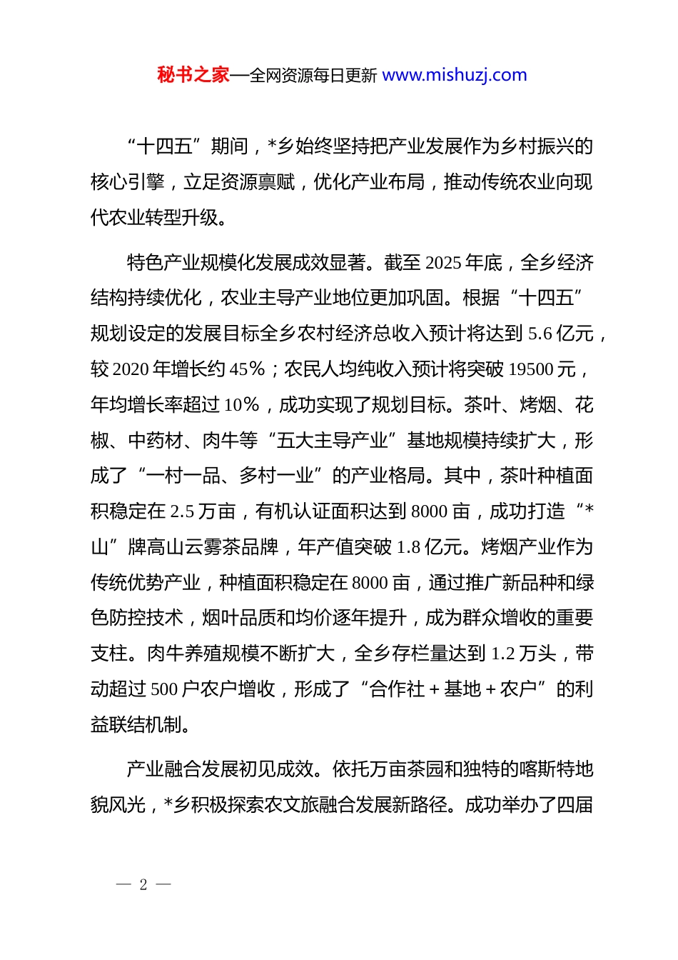 秘书之家—全网资源每日更新 www.mishuzj.com乡“十四五”期间及 2025 年工作总结和“十五五”期间及 2026 年工作谋划“十四五”时期是*乡巩固拓展脱贫攻坚成果、全面推进乡村振兴的关键五年。站在 2025 年岁末的历史节点上,回顾过去,我们砥砺前行,取得了显著成就;展望未来,我们擘画蓝图,满怀信心迎接“十五五”的到来。本报告旨在系统总结“十四五”期间的发展成效,深刻剖析存在的问题,科学谋划“十五五”时期及 2026 年的发展路径,为推动*乡实现更高质量、更可持续的发展奠定坚实基础。一、“十四五”时期及 2025 年工作总结“十四五”以来,*乡*委、政府团结带领全乡人民,紧紧围绕“产业兴旺、生态宜居、乡风文明、治理有效、生活富裕”的总要求,锐意进取、攻坚克难,全乡经济社会发展呈现出稳中有进、持续向好的良好态势,为“十五五”时期的高质量发展打下了坚实基础。一、主要成效与亮点(一)经济实力稳步提升,特色产业蓬勃发展— 1 —秘书之家—全网资源每日更新 www.mishuzj.com“十四五”期间,*乡始终坚持把产业发展作为乡村振兴的核心引擎,立足资源禀赋,优化产业布局,推动传统农业向现代农业转型升级。特色产业规模化发展成效显著。截至 2025 年底,全乡经济结构持续优化,农业主导产业地位更加巩固。根据“十四五”规划设定的发展目标全乡农村经济总收入预计将达到 5.6 亿元,较 2020 年增长约 45%;农民人均纯收入预计将突破 19500 元,年均增长率超过 10%,成功实现了规划目标。茶叶、烤烟、花椒、中药材、肉牛等“五大主导产业”基地规模持续扩大,形成了“一村一品、多村一业”的产业格局。其中,茶叶种植面积稳定在 2.5 万亩,有机认证面积达到 8000 亩,成功打造“*山”牌高山云雾茶品牌,年产值突破 1.8 亿元。烤烟产业作为传统优势产业,种植面积稳定在 8000 亩,通过推广新品种和绿色防控技术,烟叶品质和均价逐年提升,成为群众增收的重要支柱。肉牛养殖规模不断扩大,全乡存栏量达到 1.2 万头,带动超过 500 户农户增收,形成了“合作社+基地+农户”的利益联结机制。产业融合发展初见成效。依托万亩茶园和独特的喀斯特地貌风光,*乡积极探索农文旅融合发展新路径。成功举办了四届— 2 —秘书之家—全网资源每日更新 www.mishuzj.com“*茶文化旅游节”,吸引游客超过 10 万人次。“*茶旅一体化示范园”项目一期工程于 2024 年建成并投入运营,集茶叶采摘体验、茶文化展示、康养民宿于一体,年接待游客能力达 3 万人次,有效带动了当地餐饮、住宿及农产品销售,实现了“一片叶子”到“一个产业链”的延伸。同时,通过电商平台和直播带货等新模式,拓宽了花椒、蜂蜜等特色农产品的销售渠道,2025 年线上销售额预计突破 1500 万元。市场主体培育取得新进展。“十四五”期间,全乡累计培育新型农业经营主体 52 家,其中省级示范合作社 2 家,市级龙头企业 3 家。这些市场主体在标准化生产、品牌化营销和农户带动方面发挥了重要作用,提升了全乡农业的组织化程度和市场竞争力。通过积极的就业帮扶政策和技能培训,累计实现农村劳动力转移就业 8000 余人次,务工收入成为农民增收的重要补充。(二)基础设施日臻完善,乡容村貌持续改善*乡坚持把基础设施建设作为改善民生、优化发展环境的先手棋,累计投入资金约 2.8 亿元,城乡面貌发生了深刻变化。交通网络不断优化。“十四五”期间,完成了乡域内主干— 3 —秘书之家—全网资源每日更新 www.mishuzj.com道*路的升级改造工程,实现了全乡 12 个行政村通硬化路率100%。累计实施“组组通”硬化路项目 110 公里,极大改善了群众出行条件和农产品运输效率。乡镇客运站于 2023 年完成标准化改造,新增农村客运班线 3 条,实现了村村通客车,打通了服务群众的“最后一公里”。水利和能源保障能力显著增强。完成了 5 个村的农村饮水安全巩固提升工程,受益人口达 1.1 万人,农村自来水普及率提升至 95%。实施了 3 座小型水库的除险加固工程,有效提升了农业灌溉和防汛抗旱能力。完成了农村电网升级改造项目,解决了...