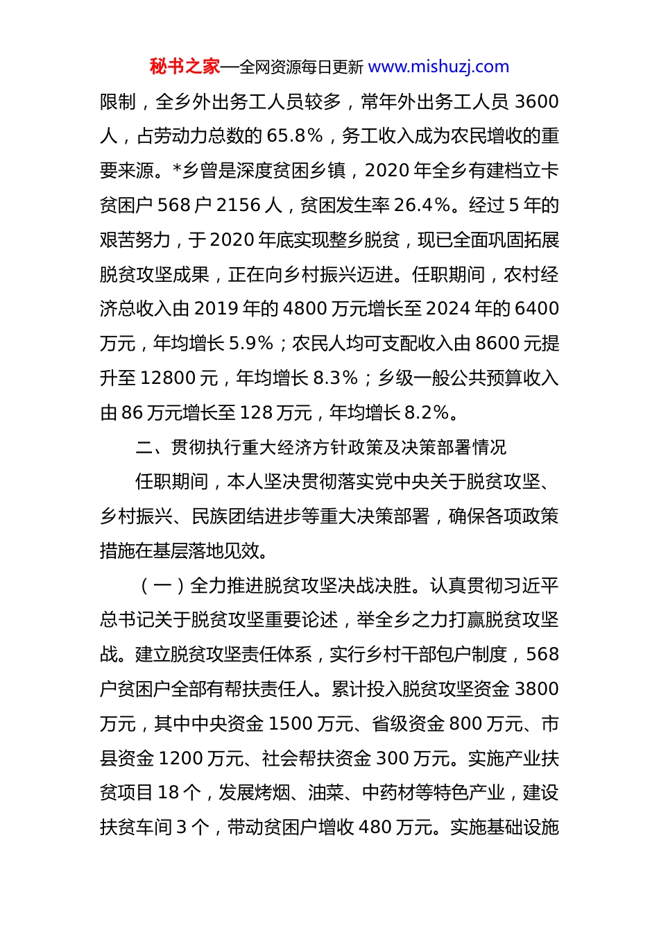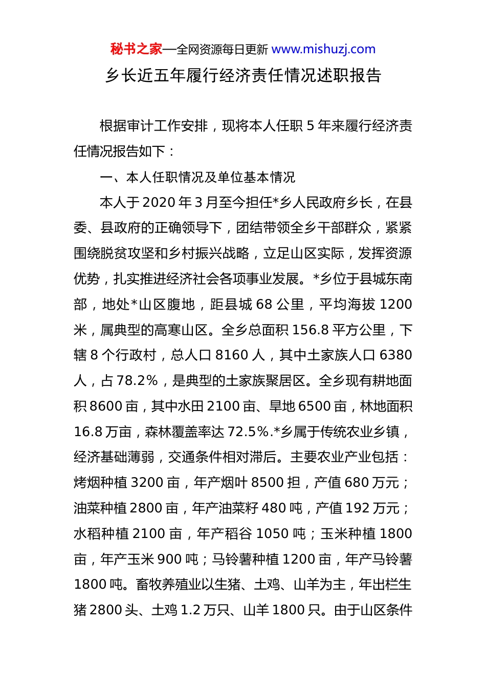 秘书之家—全网资源每日更新 www.mishuzj.com乡长近五年履行经济责任情况述职报告 根据审计工作安排,现将本人任职 5 年来履行经济责任情况报告如下:一、本人任职情况及单位基本情况本人于 2020 年 3 月至今担任*乡人民政府乡长,在县委、县政府的正确领导下,团结带领全乡干部群众,紧紧围绕脱贫攻坚和乡村振兴战略,立足山区实际,发挥资源优势,扎实推进经济社会各项事业发展。*乡位于县城东南部,地处*山区腹地,距县城 68 公里,平均海拔 1200米,属典型的高寒山区。全乡总面积 156.8 平方公里,下辖 8 个行政村,总人口 8160 人,其中土家族人口 6380人,占 78.2%,是典型的土家族聚居区。全乡现有耕地面积 8600 亩,其中水田 2100 亩、旱地 6500 亩,林地面积16.8 万亩,森林覆盖率达 72.5%.*乡属于传统农业乡镇,经济基础薄弱,交通条件相对滞后。主要农业产业包括:烤烟种植 3200 亩,年产烟叶 8500 担,产值 680 万元;油菜种植 2800 亩,年产油菜籽 480 吨,产值 192 万元;水稻种植 2100 亩,年产稻谷 1050 吨;玉米种植 1800亩,年产玉米 900 吨;马铃薯种植 1200 亩,年产马铃薯1800 吨。畜牧养殖业以生猪、土鸡、山羊为主,年出栏生猪 2800 头、土鸡 1.2 万只、山羊 1800 只。由于山区条件秘书之家—全网资源每日更新 www.mishuzj.com限制,全乡外出务工人员较多,常年外出务工人员 3600人,占劳动力总数的 65.8%,务工收入成为农民增收的重要来源。*乡曾是深度贫困乡镇,2020 年全乡有建档立卡贫困户 568 户 2156 人,贫困发生率 26.4%。经过 5 年的艰苦努力,于 2020 年底实现整乡脱贫,现已全面巩固拓展脱贫攻坚成果,正在向乡村振兴迈进。任职期间,农村经济总收入由 2019 年的 4800 万元增长至 2024 年的 6400万元,年均增长 5.9%;农民人均可支配收入由 8600 元提升至 12800 元,年均增长 8.3%;乡级一般公共预算收入由 86 万元增长至 128 万元,年均增长 8.2%。二、贯彻执行重大经济方针政策及决策部署情况任职期间,本人坚决贯彻落实党中央关于脱贫攻坚、乡村振兴、民族团结进步等重大决策部署,确保各项政策措施在基层落地见效。(一)全力推进脱贫攻坚决战决胜。认真贯彻习近平总书记关于脱贫攻坚重要论述,举全乡之力打赢脱贫攻坚战。建立脱贫攻坚责任体系,实行乡村干部包户制度,568户贫困户全部有帮扶责任人。累计投入脱贫攻坚资金 3800万元,其中中央资金 1500 万元、省级资金 800 万元、市县资金 1200 万元、社会帮扶资金 300 万元。实施产业扶贫项目 18 个,发展烤烟、油菜、中药材等特色产业,建设扶贫车间 3 个,带动贫困户增收 480 万元。实施基础设施秘书之家—全网资源每日更新 www.mishuzj.com扶贫,硬化通村公路 28 公里、通组公路 45 公里,改造农村危房 386 户,实施饮水安全工程惠及 1200 户,改造农村电网 68 公里。实施教育扶贫,资助贫困学生 680 人次,资助金额 186 万元,无一名学生因贫失学。实施健康扶贫,建立健康档案,签约服务率 100%,医疗费用报销比例达到 90%以上。实施兜底保障,纳入农村低保 286 户568 人 , 发 放 低 保 金 280 万 元 。 2020 年 底 , 568 户2156 人全部实现脱贫,贫困发生率降至零。(二)扎实推进巩固拓展脱贫攻坚成果同乡村振兴有效衔接。严格落实“四个不摘”要求,建立健全防止返贫动态监测和帮扶机制。设立防返贫监测户 86 户,其中脱贫不稳定户 48 户、边缘易致贫户 38 户,全部落实针对性帮扶措施,无一户返贫。持续发展扶贫产业,产业帮扶覆盖率保持 100%,脱贫户户均发展产业 1.8 个,年均增收4200 元。加强扶贫资产管理,建立扶贫资产台账,资产总价值 2800 万元,其中经营性资产 1200 万元、公益性资产1600 万元,资产收益 680 万元,全部用于巩固脱贫成果和推进乡村振兴。实施乡村振兴示范村建设,打造乡村振兴示范点 3 个,农村人居环境显著改善,8 个村全部达到美丽乡村标准。(三)大力发展特色优势产...