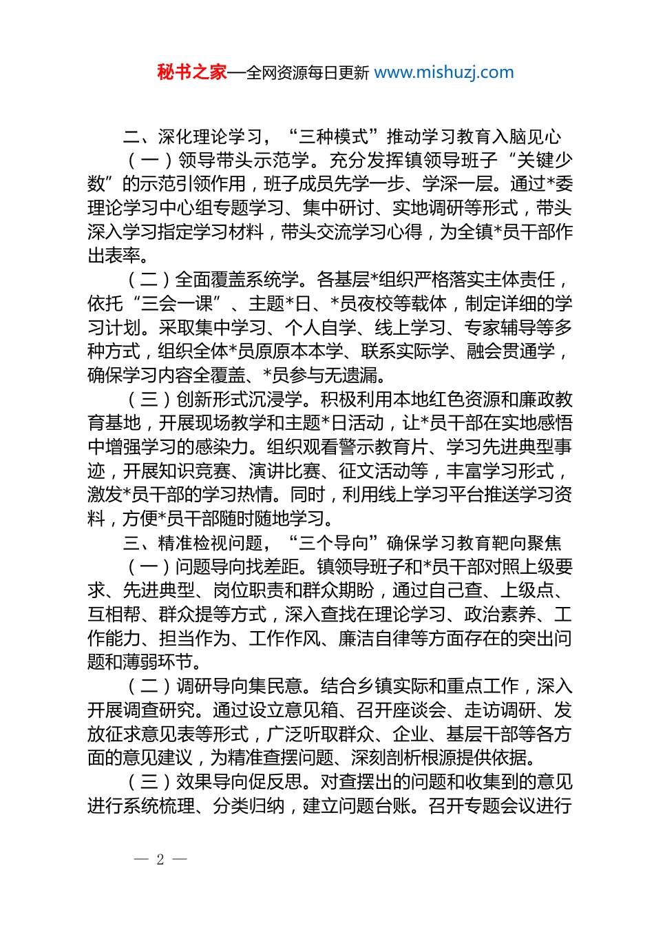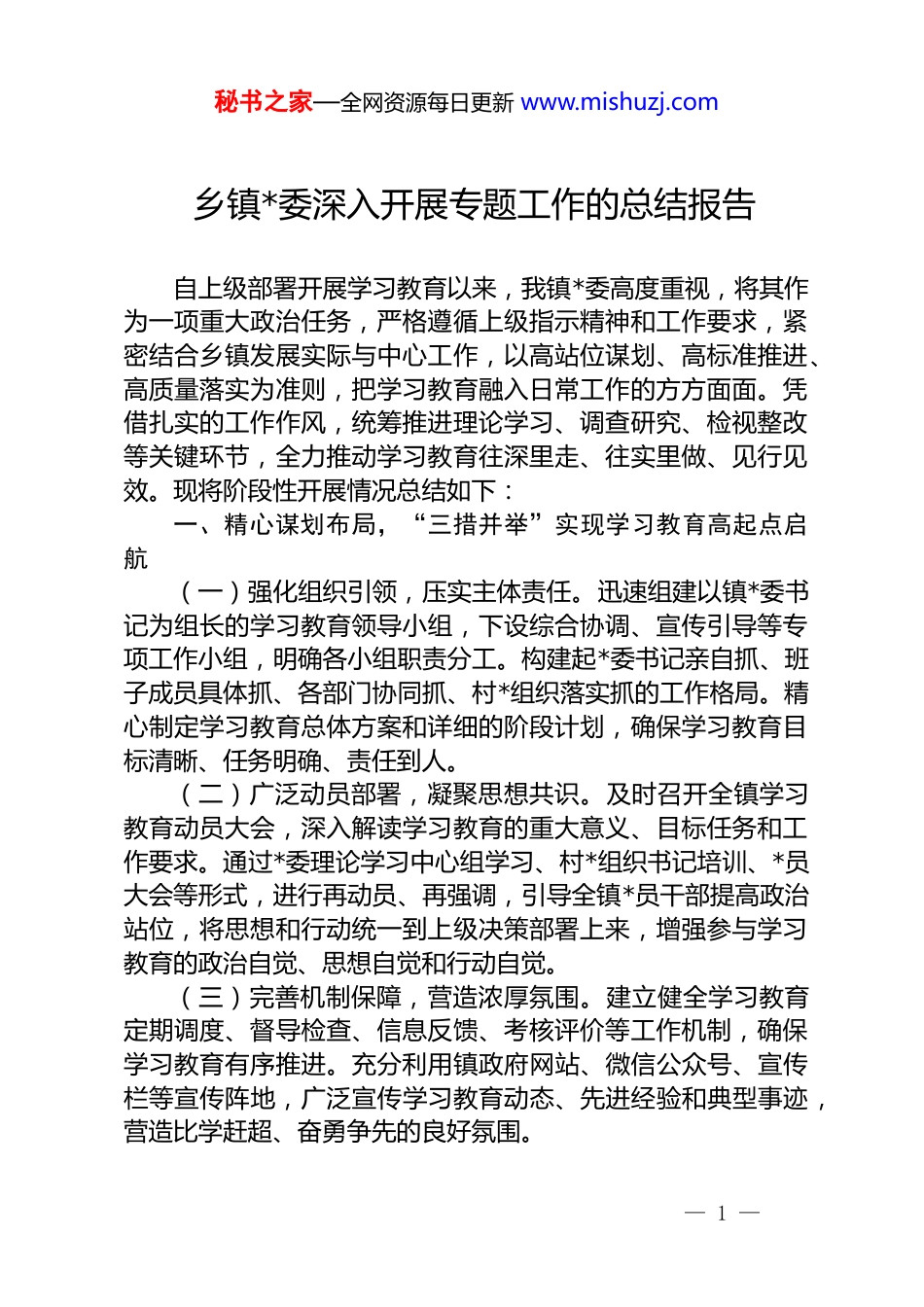 秘书之家—全网资源每日更新 www.mishuzj.com乡镇*委深入开展专题工作的总结报告自上级部署开展学习教育以来,我镇*委高度重视,将其作为一项重大政治任务,严格遵循上级指示精神和工作要求,紧密结合乡镇发展实际与中心工作,以高站位谋划、高标准推进、高质量落实为准则,把学习教育融入日常工作的方方面面。凭借扎实的工作作风,统筹推进理论学习、调查研究、检视整改等关键环节,全力推动学习教育往深里走、往实里做、见行见效。现将阶段性开展情况总结如下:一、精心谋划布局,“三措并举”实现学习教育高起点启航(一)强化组织引领,压实主体责任。迅速组建以镇*委书记为组长的学习教育领导小组,下设综合协调、宣传引导等专项工作小组,明确各小组职责分工。构建起*委书记亲自抓、班子成员具体抓、各部门协同抓、村*组织落实抓的工作格局。精心制定学习教育总体方案和详细的阶段计划,确保学习教育目标清晰、任务明确、责任到人。(二)广泛动员部署,凝聚思想共识。及时召开全镇学习教育动员大会,深入解读学习教育的重大意义、目标任务和工作要求。通过*委理论学习中心组学习、村*组织书记培训、*员大会等形式,进行再动员、再强调,引导全镇*员干部提高政治站位,将思想和行动统一到上级决策部署上来,增强参与学习教育的政治自觉、思想自觉和行动自觉。(三)完善机制保障,营造浓厚氛围。建立健全学习教育定期调度、督导检查、信息反馈、考核评价等工作机制,确保学习教育有序推进。充分利用镇政府网站、微信公众号、宣传栏等宣传阵地,广泛宣传学习教育动态、先进经验和典型事迹,营造比学赶超、奋勇争先的良好氛围。— 1 —秘书之家—全网资源每日更新 www.mishuzj.com二、深化理论学习,“三种模式”推动学习教育入脑见心(一)领导带头示范学。充分发挥镇领导班子“关键少数”的示范引领作用,班子成员先学一步、学深一层。通过*委理论学习中心组专题学习、集中研讨、实地调研等形式,带头深入学习指定学习材料,带头交流学习心得,为全镇*员干部作出表率。(二)全面覆盖系统学。各基层*组织严格落实主体责任,依托“三会一课”、主题*日、*员夜校等载体,制定详细的学习计划。采取集中学习、个人自学、线上学习、专家辅导等多种方式,组织全体*员原原本本学、联系实际学、融会贯通学,确保学习内容全覆盖、*员参与无遗漏。(三)创新形式沉浸学。积极利用本地红色资源和廉政教育基地,开展现场教学和主题*日活动,让*员干部在实地感悟中增强学习的感染力。组织观看警示教育片、学习先进典型事迹,开展知识竞赛、演讲比赛、征文活动等,丰富学习形式,激发*员干部的学习热情。同时,利用线上学习平台推送学习资料,方便*员干部随时随地学习。三、精准检视问题,“三个导向”确保学习教育靶向聚焦(一)问题导向找差距。镇领导班子和*员干部对照上级要求、先进典型、岗位职责和群众期盼,通过自己查、上级点、互相帮、群众提等方式,深入查找在理论学习、政治素养、工作能力、担当作为、工作作风、廉洁自律等方面存在的突出问题和薄弱环节。(二)调研导向集民意。结合乡镇实际和重点工作,深入开展调查研究。通过设立意见箱、召开座谈会、走访调研、发放征求意见表等形式,广泛听取群众、企业、基层干部等各方面的意见建议,为精准查摆问题、深刻剖析根源提供依据。(三)效果导向促反思。对查摆出的问题和收集到的意见进行系统梳理、分类归纳,建立问题台账。召开专题会议进行— 2 —秘书之家—全网资源每日更新 www.mishuzj.com集体分析“会诊”,深刻剖析问题产生的根源,特别是从思想认识、工作方法、制度机制等方面进行深入反思,明确整改方向和初步措施。四、狠抓整改落实,“三项机制”推动学习教育成果转化(一)台账管理促整改。针对查摆出的问题,逐一制定整改措施,明确责任领导、责任部门和整改期限,形成问题清单、任务清单、责任清单。实行台账式管理、动态化跟踪,完成一项销号一项,确保整改工作事事有回音、件件有着落。(二)分类施策抓整改。对能够立即解决的问题,立行立改、即知即改;对需要一定时间解决的问题,制定阶段性目标,持...
