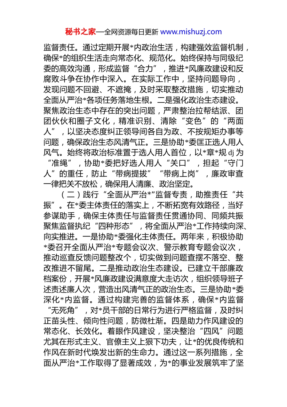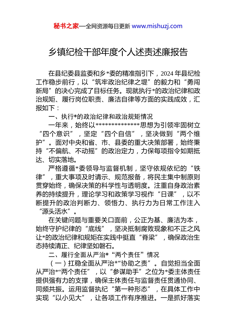 秘书之家—全网资源每日更新 www.mishuzj.com乡镇纪检干部年度个人述责述廉报告在县纪委县监委和乡*委的精准指引下,2024 年县纪检工作稳步前行,以“筑牢政治纪律之堤”的毅力和“勇闯新局”的决心完成了目标任务。现就执行*的政治纪律和政治规矩、履行岗位职责、廉洁自律等方面的实践成效,汇报如下:一、执行*的政治纪律和政治规矩情况一年来,始终以**************思想为引领牢固树立“四个意识”,坚定“四个自信”,坚决做到“两个维护”。面对中央和省、市、县委的重大决策部署,始终秉持“不偏航、不动摇”的政治定力,力保每项指令如期抵达、切实落地。严格遵循*委领导与监督机制,坚守依规依纪的“铁律”,重大事项及时请示、规范报备,将民主集中制原则贯穿始终,确保决策的科学性与透明度。注重自身政治素养的持续提升,理论学习和政策学习视作“日课”,以不断提升的政治判断力、领悟力、执行力为日常工作注入“源头活水”。在关键问题与重要关口面前,公正为基、廉洁为本,始终守护纪律的“底线”,坚决抵制腐败现象和不正之风让*的政治纪律和规矩在实践中挺直“脊梁”,确保政治生态持续清正、纪律坚如磐石。二、履行全面从严治*“两个责任”情况(一)扛稳全面从严治*“协助之责”。自觉担当全面从严治*“两个责任”,以“参谋助手”之位为*委主体责任提供强有力的支撑,确保主体责任与监督责任贯通协同、同频共振。运用监督执纪“第一种形态”,在具体工作中实现“以小见大”,让各项工作有序推进。一是抓好落实秘书之家—全网资源每日更新 www.mishuzj.com监督责任。通过定期开展*内政治生活,构建强效监督机制,确保*的组织生活走向常态化、规范化。始终保持与同级纪委的高效沟通,形成监督“合力”,推进*风廉政建设和反腐败斗争在协作中深入。在实际工作中,坚持问题导向,发现问题不回避、不遮掩,及时采取整改措施,切实推动全面从严治*各项任务落地生根。二是强化政治生态建设。聚焦政治生态中存在的突出问题,严肃整治拉帮结派、团团伙伙和圈子文化,精准识别、清除“变色”的“两面人”,以坚决态度纠正领导间各自为政、不按规矩办事等问题,确保政治生态风清气正。三是协助*委匡正选人用人风气。始终将政治标准置于选人用人首位,以*章*规 dj 为“准绳”,协助*委把好选人用人“关口”,担起“守门人”的重任,防止“带病提拔”“带病上岗”,廉政审查一律把关不放松,确保用人清廉、政治坚定。(二)践行“全面从严治*”监督专责,助推责任“共振”。在*委主体责任的落实上,不断拓宽有效路径,当好参谋助手,确保主体责任与监督责任贯通协同、同频共振聚焦监督执纪“四种形态”,将全面从严治*工作持续向深、向实推进。一是协助*委强化主体责任。两年来,积极协助*委召开全面从严治*专题会议次、警示教育专题会议次,推动巡查反馈问题整改个,切实做到问题查摆不落空、整改推进不留尾。二是推动政治生态建设。已建立干部廉政档案份,开展*风廉政建设满意度大走访次,组织领导班子述责述廉人次,营造出风清气正的政治生态。三是协助*委深化*内监督。通过构建完善的监督体系,确保*内监督“无死角”,对*员干部的日常行为进行严格监督,及时纠正苗头性、倾向性问题,防微杜渐。四是助力作风建设的常态化、长效化。着眼作风建设,坚决整治“四风”问题尤其在形式主义、官僚主义上狠下功夫,让*的优良传统和作风在新时代焕发出新的生命力。通过这一系列措施,全面从严治*工作取得了显著成效,为*的事业发展筑牢了坚秘书之家—全网资源每日更新 www.mishuzj.com实的政治根基。三、严守纪律规矩执行廉洁自律情况严守 dj 法规,自觉践行《中国共产*廉洁自律准则》,如实向组织报告个人有关事项,以依规依纪、依法办事为基本准则,始终保持清正廉洁的作风,持续筑牢拒腐防变的“底线屏障”。一是守住“思想关”。时刻保持清醒头脑,倍加珍惜组织信任、珍视干事机会,珍爱家庭和前程确保干事“有心”、干净“有形”,筑牢拒腐防变的思想“防护墙”。二是守住“言行关”。不吃请、不请吃,始终保持“自律本色”,在社交和生活中时刻自省,廉洁自律贯穿...