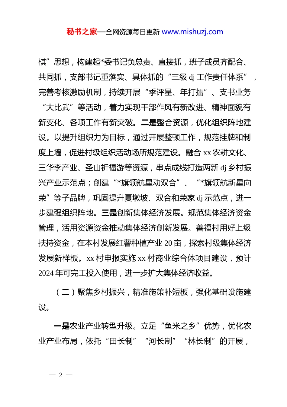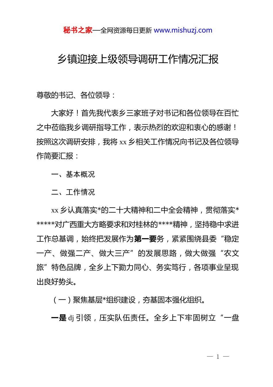 秘书之家—全网资源每日更新 www.mishuzj.com乡镇迎接上级领导调研工作情况汇报尊敬的书记、各位领导:大家好!首先我代表乡三家班子对书记和各位领导在百忙之中莅临我乡调研指导工作,表示热烈的欢迎和衷心的感谢!按照这次调研安排,我将 xx 乡相关工作情况向书记及各位领导作简要汇报:一、基本概况二、工作情况xx 乡认真落实*的二十大精神和二中全会精神,贯彻落实******对广西重大方略要求和对桂林的****精神,坚持稳中求进工作总基调,始终把发展作为第一要务,紧紧围绕县委“稳定一产、做强二产、做大三产”的发展思路,做大做强“农文旅”特色品牌,全乡上下勠力同心、务实笃行,各项事业呈现出良好势头。(一)聚焦基层*组织建设,夯基固本强化组织。一是 dj 引领,压实队伍责任。全乡上下牢固树立“一盘— 1 —秘书之家—全网资源每日更新 www.mishuzj.com棋”思想,构建起*委书记负总责、直接抓,班子成员齐配合、共同抓,支部书记重落实、具体抓的“三级 dj 工作责任体系”,完善考核激励机制,持续开展“季评星、年打擂”、支书业务“大比武”等活动,着力实现干部作风有新改进、精神面貌有新变化、各项工作有新突破。二是整合资源,优化组织阵地建设。以提升组织力为目标,通过开展整顿工作,规范挂牌和制度上墙,促进村级组织活动场所规范建设。融合 xx 农耕文化、三华李产业、圣山祈福游等资源,串点成线打造两新 dj 乡村振兴产业示范点;创建“*旗领航星动双合”、“*旗领航新星向荣”等子品牌,巩固提升夏墩坡、双合和荣家 dj 示范点,进一步建强组织阵地。三是创新集体经济发展。规范集体经济资金管理,活用资源资金推动集体经济创新发展。善福村用好上级扶持资金,在本村发展红薯种植产业 20 亩,探索村级集体经济发展新样板。xx 村申报实施 xx 村商业综合体项目建设,预计2024 年可完工投入使用,进一步扩大集体经济收益。(二)聚焦乡村振兴,精准施策补短板,强化基础设施建设。一是农业产业转型升级。立足“鱼米之乡”优势,优化农业产业布局,依托“田长制”“河长制”“林长制”的开展,— 2 —秘书之家—全网资源每日更新 www.mishuzj.com做实大农业工作。高质量完成平口村粮食高效示范点建设,完成经济作物播种任务。发挥地域优势,重点发展特色产业。二是招商投资持续向好。坚持“走出去,引进来”工作方针,*政主要领导带队招商,不断优化营商环境,成功引进广州维德益皮具有限公司落户 xx,240 名留守妇女实现就近就业,既增加家庭收入又照顾了家庭,努力为 xx 的经济发展注入新血液,带动农民就近就业。三是项目建设提质增速。平口水库水源地保护区规范化建设项目已完成主体建设,全乡 8 个污水处理站进入试运行阶段。协助完成库区移民村整村提升项目。重点策划包装“魅力圣山”五星级乡村旅游区项目,进一步助推我乡农文旅融合发展。(三)聚焦亮点打造,dj 引领农文旅融合发展赋能乡村振兴。一是依托圣山、圣山湖、石面山三华李连片种植区等资源,打造“三华李+祈福文化+旅游”农文旅相结合的模式,形成了“春赏李花、夏尝李果、冬登圣山”的乡村产业旅游“新业态”。二是依托石面山龙源紫荆花带,打造最美“一公里”网红打卡点,集中资源打造三华李产业示范点。三是充分发挥我乡区位、产业、人文等资源优势,举办三华李采摘节,进一步— 3 —秘书之家—全网资源每日更新 www.mishuzj.com提升特色产业知名度,打造三华李产业靓丽名片,吸引旅游项目落户 xx,助推农文旅融合发展。依靠三华李产业,村民人均增收 2000 余元,三华李成为农民增收的“致富果”,为扮靓农文旅融合发展“新图景”注入新活力。三、存在问题(一)维护社会稳定形势依然艰巨。(二)人居环境还需进一步改善。(三)招商引资困难。(四)村级集体经济普遍薄弱。四、下一步工作思路xx 乡将坚持以**************思想为指导,全面贯彻落实*的二十大和二十届二中全会精神,深入贯彻落实******对广西重大方略要求和对 xx****精神,深入贯彻落实县委的重大决策部署,坚持稳中求进,以进促稳、先立后破,推动“生态立乡、产业富乡、旅游...