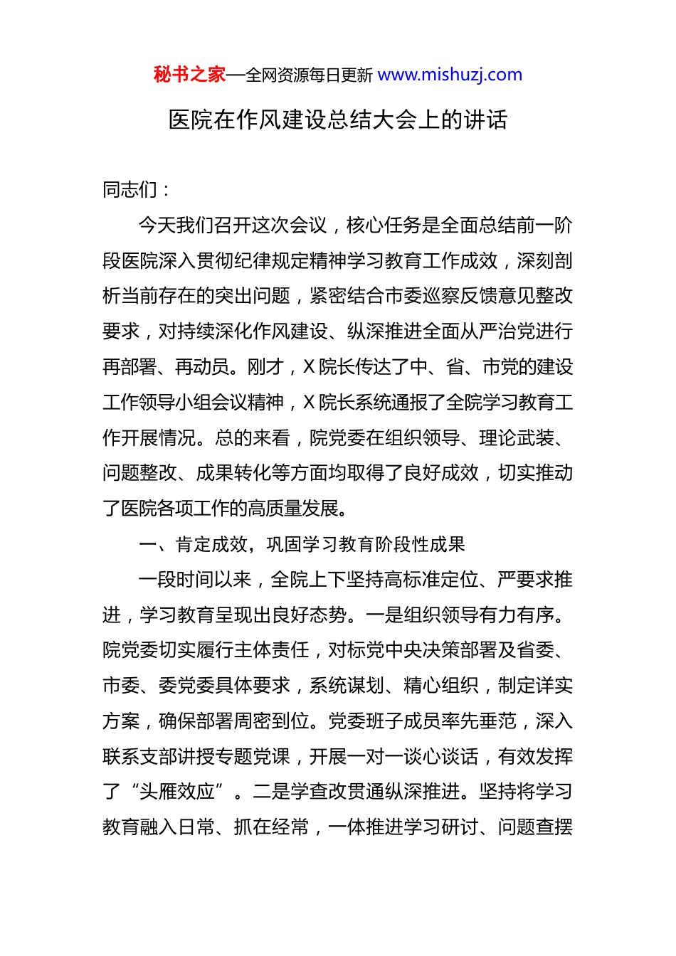 秘书之家—全网资源每日更新 www.mishuzj.com医院在作风建设总结大会上的讲话 同志们:今天我们召开这次会议,核心任务是全面总结前一阶段医院深入贯彻纪律规定精神学习教育工作成效,深刻剖析当前存在的突出问题,紧密结合市委巡察反馈意见整改要求,对持续深化作风建设、纵深推进全面从严治党进行再部署、再动员。刚才,X 院长传达了中、省、市党的建设工作领导小组会议精神,X 院长系统通报了全院学习教育工作开展情况。总的来看,院党委在组织领导、理论武装、问题整改、成果转化等方面均取得了良好成效,切实推动了医院各项工作的高质量发展。一、肯定成效,巩固学习教育阶段性成果一段时间以来,全院上下坚持高标准定位、严要求推进,学习教育呈现出良好态势。一是组织领导有力有序。院党委切实履行主体责任,对标党中央决策部署及省委、市委、委党委具体要求,系统谋划、精心组织,制定详实方案,确保部署周密到位。党委班子成员率先垂范,深入联系支部讲授专题党课,开展一对一谈心谈话,有效发挥了“头雁效应”。二是学查改贯通纵深推进。坚持将学习教育融入日常、抓在经常,一体推进学习研讨、问题查摆秘书之家—全网资源每日更新 www.mishuzj.com与整改落实。全院党员干部,特别是青年干部、关键岗位负责人以及新提拔干部,通过学习纪律规定精神及其实施细则,规矩意识普遍增强,纪律防线进一步筑牢。三是作风建设得到加强。思想认识实现新提升,对纪律规矩的敬畏之心显著增强。工作作风呈现新转变,服务意识、责任意识得到锤炼。制度建设取得新突破,着眼长效完善了一批务实管用的制度规范。这些成效的取得,凝聚着全院党员干部职工的共同努力,为医院高质量发展提供了有力的纪律作风保障。二、直面问题,清醒认识严峻形势与突出短板在肯定成绩的同时,我们必须保持高度清醒,深刻认识到市委巡察反馈意见和集中整治暴露出的问题依然严峻复杂,作风建设永远在路上。一是思想认识不到位,压力传导有梗阻。相当一部分科室和干部职工都存在“过关”心态,认为学习教育就是“一阵风”,不是用规定严格约束自己,而是热衷于打听“什么时候结束”“最近还管不管违规吃喝”,把心思放在和政策规定“捉迷藏、打太极”上。部分临床科室和党支部政治站位不高,思想认识不到位,学习研讨只求进度不管深度,是似而非、一知半解;问题查摆流于形式,避实就虚、文不对题现象突出,甚至出现互相抄袭、内容雷同、应付交差的情况。二是整秘书之家—全网资源每日更新 www.mishuzj.com改整治不彻底,顽瘴痼疾未根治。主要表现为“老好人”思想盛行,抓集中整治缺乏刀刃向内的勇气,讳疾忌医、隔靴搔痒,不敢动真碰硬触及深层矛盾,作风建设和医德医风方面存在的一些突出问题仍然没有有效解决。三是日常监督有短板,风险隐患较突出。一些班子成员、科室负责人履行“一岗双责”不到位,对干部职工的考核管理较松懈,“八小时外”监督浮在表面,忽视思想政治建设,谈心谈话、廉政提醒、警示教育只触皮毛不抵灵魂,导致个别职工缺乏敬畏意识、纪律意识、风险意识,迟到早退、上班摸鱼、浑噩度日,或长期沉迷于网络游戏、赌博,甚至出现酒驾、倒卖患者信息等违法行为,十分可怕。这些看似“小节”的问题,如果不加以重视,势必演变为大错误,给我们带来无法承受之重。这些问题性质严重、影响恶劣,不仅损害患者利益、破坏医疗秩序,更侵蚀党的执政根基和医院发展基础,必须下大气力彻底整治。三、聚焦重点,全力做好学习教育“后半篇文章”巩固深化学习教育成果,狠抓巡察反馈问题整改,推动纪律规定精神在医院化风成俗、一严到底,是一项必须长期坚持、持续用力的政治任务。我们要重点在五个方面狠下功夫。秘书之家—全网资源每日更新 www.mishuzj.com一是理论武装要“常学常新”,在凝心铸魂上更深一步。必须深刻认识到深入贯彻纪律规定精神绝非一日之功,而是长期的重大政治责任。要将学习教育常态化、制度化,建立健全长效学习机制,不断探索创新学习形式载体,增强吸引力感染力。将落实纪律规定精神紧密融入医院行风建设、医德医风建设全过程,引导全院党员干部职工持续加强党性修养...