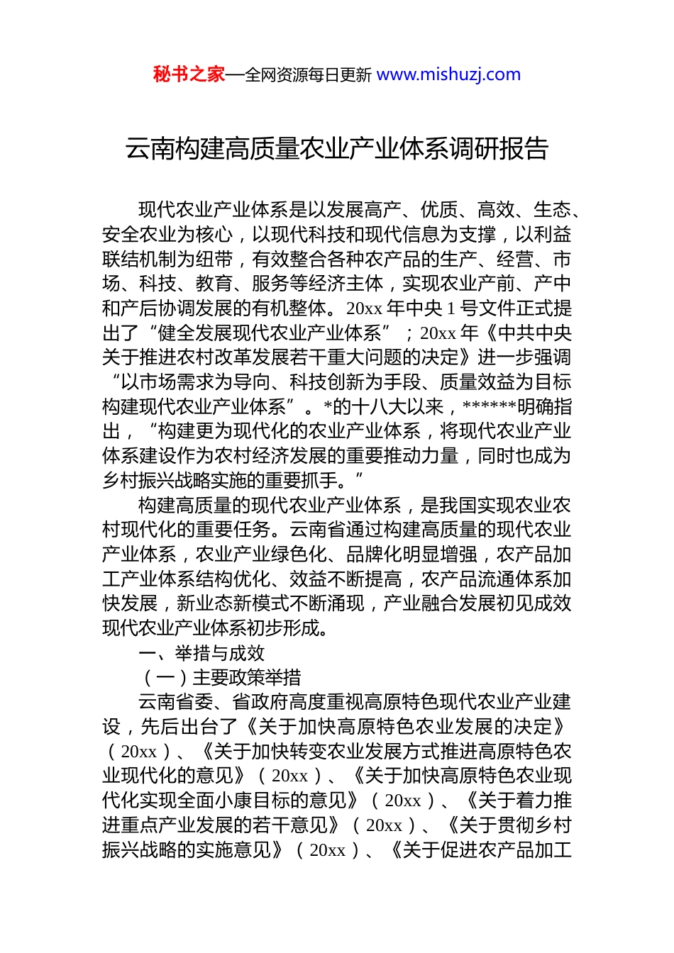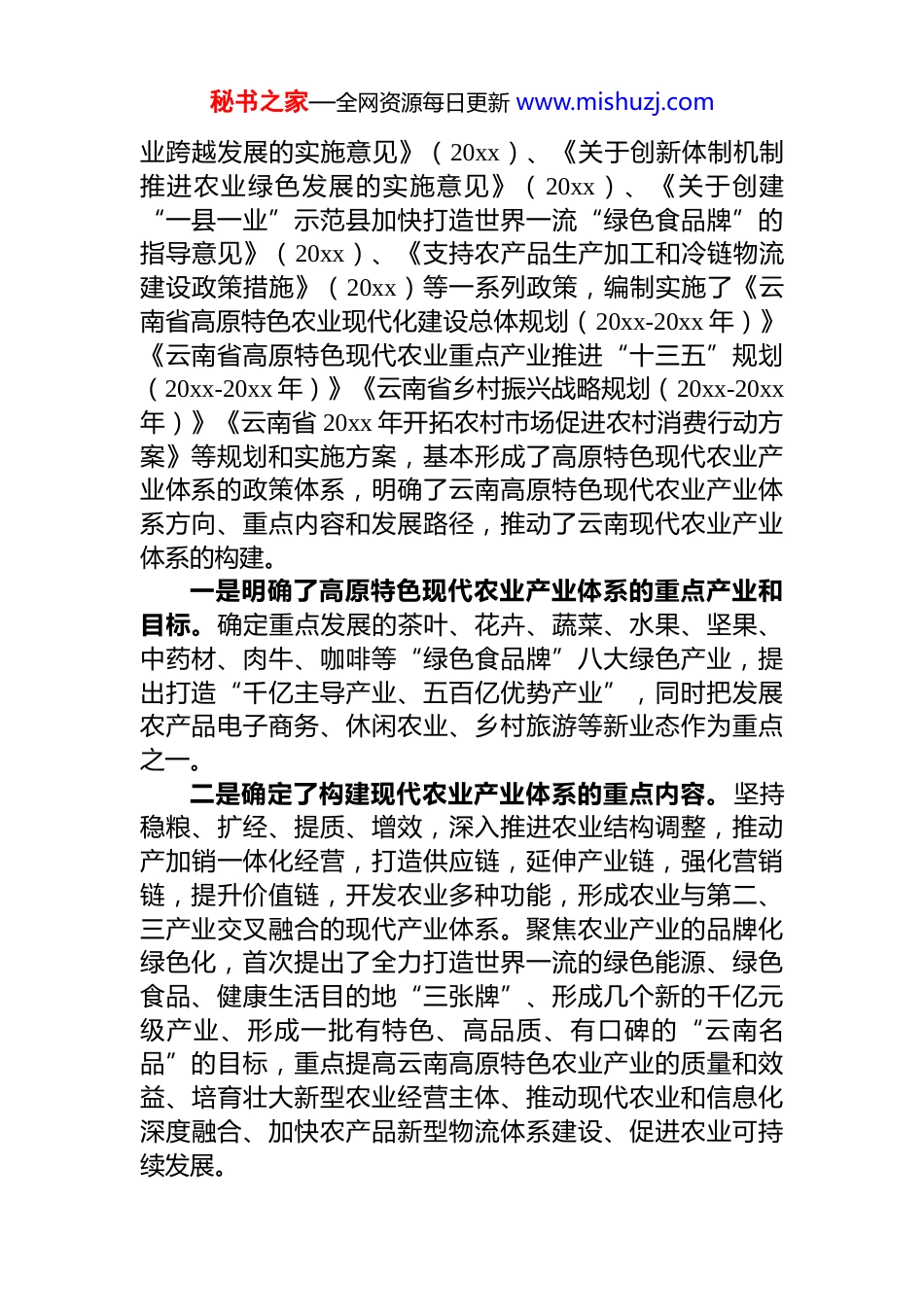秘书之家—全网资源每日更新 www.mishuzj.com云南构建高质量农业产业体系调研报告现代农业产业体系是以发展高产、优质、高效、生态、安全农业为核心,以现代科技和现代信息为支撑,以利益联结机制为纽带,有效整合各种农产品的生产、经营、市场、科技、教育、服务等经济主体,实现农业产前、产中和产后协调发展的有机整体。20xx 年中央 1 号文件正式提出了“健全发展现代农业产业体系”;20xx 年《中共中央关于推进农村改革发展若干重大问题的决定》进一步强调“以市场需求为导向、科技创新为手段、质量效益为目标构建现代农业产业体系”。*的十八大以来,******明确指出,“构建更为现代化的农业产业体系,将现代农业产业体系建设作为农村经济发展的重要推动力量,同时也成为乡村振兴战略实施的重要抓手。”构建高质量的现代农业产业体系,是我国实现农业农村现代化的重要任务。云南省通过构建高质量的现代农业产业体系,农业产业绿色化、品牌化明显增强,农产品加工产业体系结构优化、效益不断提高,农产品流通体系加快发展,新业态新模式不断涌现,产业融合发展初见成效现代农业产业体系初步形成。一、举措与成效(一)主要政策举措云南省委、省政府高度重视高原特色现代农业产业建设,先后出台了《关于加快高原特色农业发展的决定》(20xx)、《关于加快转变农业发展方式推进高原特色农业现代化的意见》(20xx)、《关于加快高原特色农业现代化实现全面小康目标的意见》(20xx)、《关于着力推进重点产业发展的若干意见》(20xx)、《关于贯彻乡村振兴战略的实施意见》(20xx)、《关于促进农产品加工秘书之家—全网资源每日更新 www.mishuzj.com业跨越发展的实施意见》(20xx)、《关于创新体制机制推进农业绿色发展的实施意见》(20xx)、《关于创建“一县一业”示范县加快打造世界一流“绿色食品牌”的指导意见》(20xx)、《支持农产品生产加工和冷链物流建设政策措施》(20xx)等一系列政策,编制实施了《云南省高原特色农业现代化建设总体规划(20xx-20xx 年)》《云南省高原特色现代农业重点产业推进“十三五”规划(20xx-20xx 年)》《云南省乡村振兴战略规划(20xx-20xx年)》《云南省 20xx 年开拓农村市场促进农村消费行动方案》等规划和实施方案,基本形成了高原特色现代农业产业体系的政策体系,明确了云南高原特色现代农业产业体系方向、重点内容和发展路径,推动了云南现代农业产业体系的构建。一是明确了高原特色现代农业产业体系的重点产业和目标。确定重点发展的茶叶、花卉、蔬菜、水果、坚果、中药材、肉牛、咖啡等“绿色食品牌”八大绿色产业,提出打造“千亿主导产业、五百亿优势产业”,同时把发展农产品电子商务、休闲农业、乡村旅游等新业态作为重点之一。二是确定了构建现代农业产业体系的重点内容。坚持稳粮、扩经、提质、增效,深入推进农业结构调整,推动产加销一体化经营,打造供应链,延伸产业链,强化营销链,提升价值链,开发农业多种功能,形成农业与第二、三产业交叉融合的现代产业体系。聚焦农业产业的品牌化绿色化,首次提出了全力打造世界一流的绿色能源、绿色食品、健康生活目的地“三张牌”、形成几个新的千亿元级产业、形成一批有特色、高品质、有口碑的“云南名品”的目标,重点提高云南高原特色农业产业的质量和效益、培育壮大新型农业经营主体、推动现代农业和信息化深度融合、加快农产品新型物流体系建设、促进农业可持续发展。秘书之家—全网资源每日更新 www.mishuzj.com三是明确了现代农业产业体系的发展路径。紧扣“质量兴农”“绿色兴农”“品牌强农”发展方向,以提质增效为目标,加快推进农业产业的绿色化、优质化、特色化品牌化发展,着力建设高质量的现代农业产业体系。坚持高质量发展要求,聚焦八大重点产业和“世界一流三张牌”,绘制产业链“全景图”,做大做优做强产业链,培育和发展产业集群;按照“大产业+新主体+新平台”发展模式和“创名牌、育龙头、抓有机、建平台、占市场、解难题”工作思路,紧盯行业制高点,全产业链发力,构建“传统产业+支柱产业+新兴产业”迭代产业体系,争取更多领域站在产业...