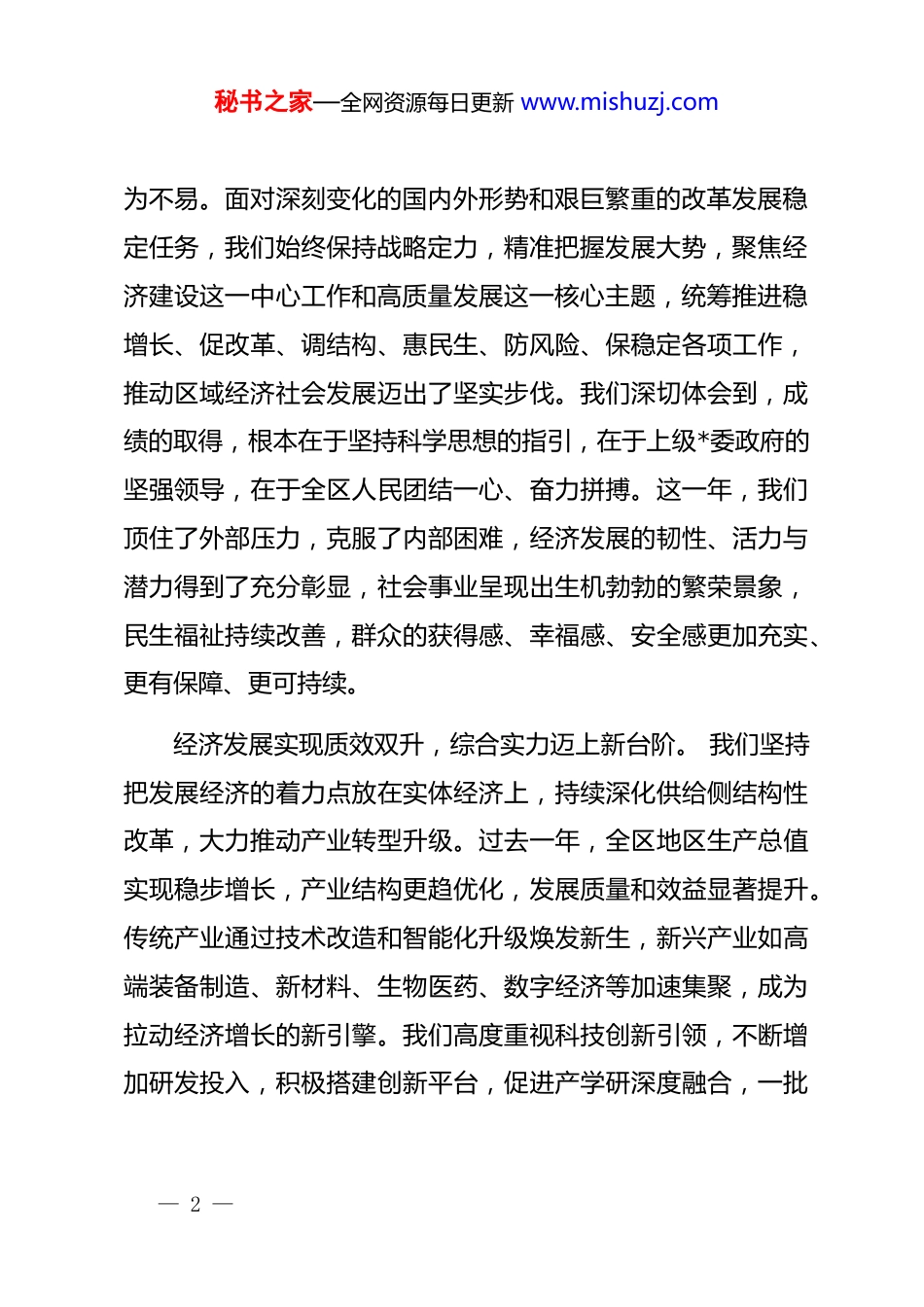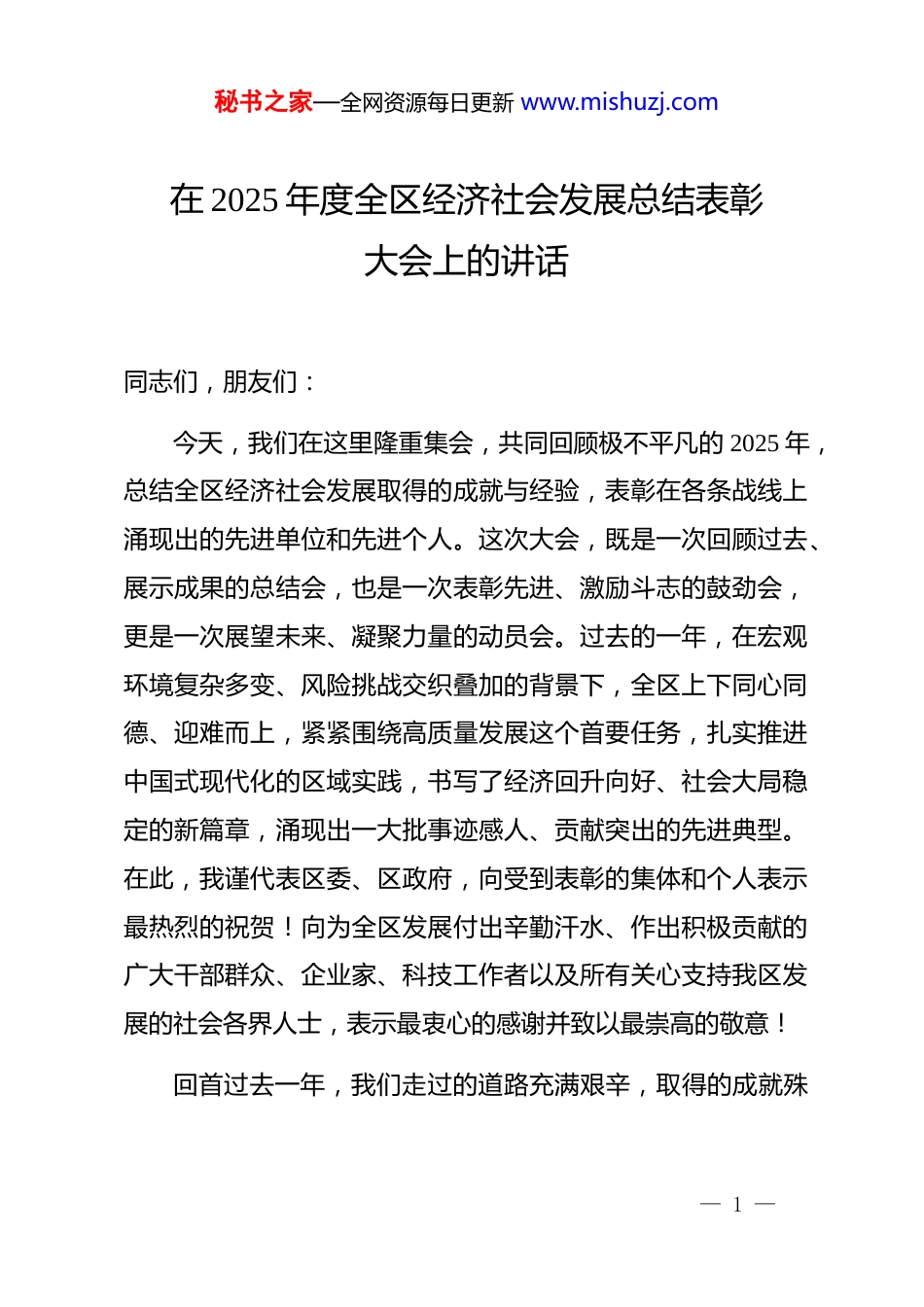 秘书之家—全网资源每日更新 www.mishuzj.com在 2025 年度全区经济社会发展总结表彰大会上的讲话同志们,朋友们:今天,我们在这里隆重集会,共同回顾极不平凡的 2025 年,总结全区经济社会发展取得的成就与经验,表彰在各条战线上涌现出的先进单位和先进个人。这次大会,既是一次回顾过去、展示成果的总结会,也是一次表彰先进、激励斗志的鼓劲会,更是一次展望未来、凝聚力量的动员会。过去的一年,在宏观环境复杂多变、风险挑战交织叠加的背景下,全区上下同心同德、迎难而上,紧紧围绕高质量发展这个首要任务,扎实推进中国式现代化的区域实践,书写了经济回升向好、社会大局稳定的新篇章,涌现出一大批事迹感人、贡献突出的先进典型。在此,我谨代表区委、区政府,向受到表彰的集体和个人表示最热烈的祝贺!向为全区发展付出辛勤汗水、作出积极贡献的广大干部群众、企业家、科技工作者以及所有关心支持我区发展的社会各界人士,表示最衷心的感谢并致以最崇高的敬意!回首过去一年,我们走过的道路充满艰辛,取得的成就殊— 1 —秘书之家—全网资源每日更新 www.mishuzj.com为不易。面对深刻变化的国内外形势和艰巨繁重的改革发展稳定任务,我们始终保持战略定力,精准把握发展大势,聚焦经济建设这一中心工作和高质量发展这一核心主题,统筹推进稳增长、促改革、调结构、惠民生、防风险、保稳定各项工作,推动区域经济社会发展迈出了坚实步伐。我们深切体会到,成绩的取得,根本在于坚持科学思想的指引,在于上级*委政府的坚强领导,在于全区人民团结一心、奋力拼搏。这一年,我们顶住了外部压力,克服了内部困难,经济发展的韧性、活力与潜力得到了充分彰显,社会事业呈现出生机勃勃的繁荣景象,民生福祉持续改善,群众的获得感、幸福感、安全感更加充实、更有保障、更可持续。经济发展实现质效双升,综合实力迈上新台阶。 我们坚持把发展经济的着力点放在实体经济上,持续深化供给侧结构性改革,大力推动产业转型升级。过去一年,全区地区生产总值实现稳步增长,产业结构更趋优化,发展质量和效益显著提升。传统产业通过技术改造和智能化升级焕发新生,新兴产业如高端装备制造、新材料、生物医药、数字经济等加速集聚,成为拉动经济增长的新引擎。我们高度重视科技创新引领,不断增加研发投入,积极搭建创新平台,促进产学研深度融合,一批— 2 —秘书之家—全网资源每日更新 www.mishuzj.com关键核心技术取得突破,科技成果转化效率明显提高,区域创新能力综合排名持续进位。我们坚持“项目为王”理念,全力以赴抓招商、上项目、促投资,一批投资规模大、科技含量高、带动能力强的重大项目相继落地、开工建设或投产达效,为长远发展注入了强劲动力。营商环境是区域竞争力的重要体现,我们以“攻坚年”为契机,深化“放管服”改革,着力破解企业全生命周期中的堵点、难点、痛点问题,政务服务效率大幅提升,市场主体的满意度和发展信心不断增强,亲清政商关系得到巩固发展。城乡面貌发生深刻变化,协调发展绘就新画卷。 我们牢固树立和践行以人民为中心的发展思想,统筹城乡区域协调发展,努力打造宜居、韧性、智慧城市和宜居宜业和美乡村。城市更新行动扎实推进,一批老旧小区焕然一新,基础设施日臻完善,道路交通网络更加畅通,城市管理更加精细化、智能化,生态空间持续拓展,人居环境品质显著提升。在乡村,我们学习运用“千万工程”经验,全面推进乡村振兴战略,农业农村现代化步伐加快。乡村产业发展壮大,集体经济活力增强,农民收入渠道拓宽;乡村建设行动深入实施,农村人居环境整治成效显著,水、电、路、气、信等基础设施短板加快补齐;乡风文— 3 —秘书之家—全网资源每日更新 www.mishuzj.com明建设不断加强,基层治理效能有效提升,一幅“村美、人和、业兴”的乡村新图景正在徐徐展开。生态文明建设纵深推进,我们坚定不移走生态优先、绿色发展之路,打好蓝天、碧水、净土保卫战,主要污染物排放总量持续下降,生态环境质量稳定改善,绿色低碳生产生活方式逐渐成为社会新风尚。改革开放释放强大活力,内生动力得到新增强。 我们坚持以改革...