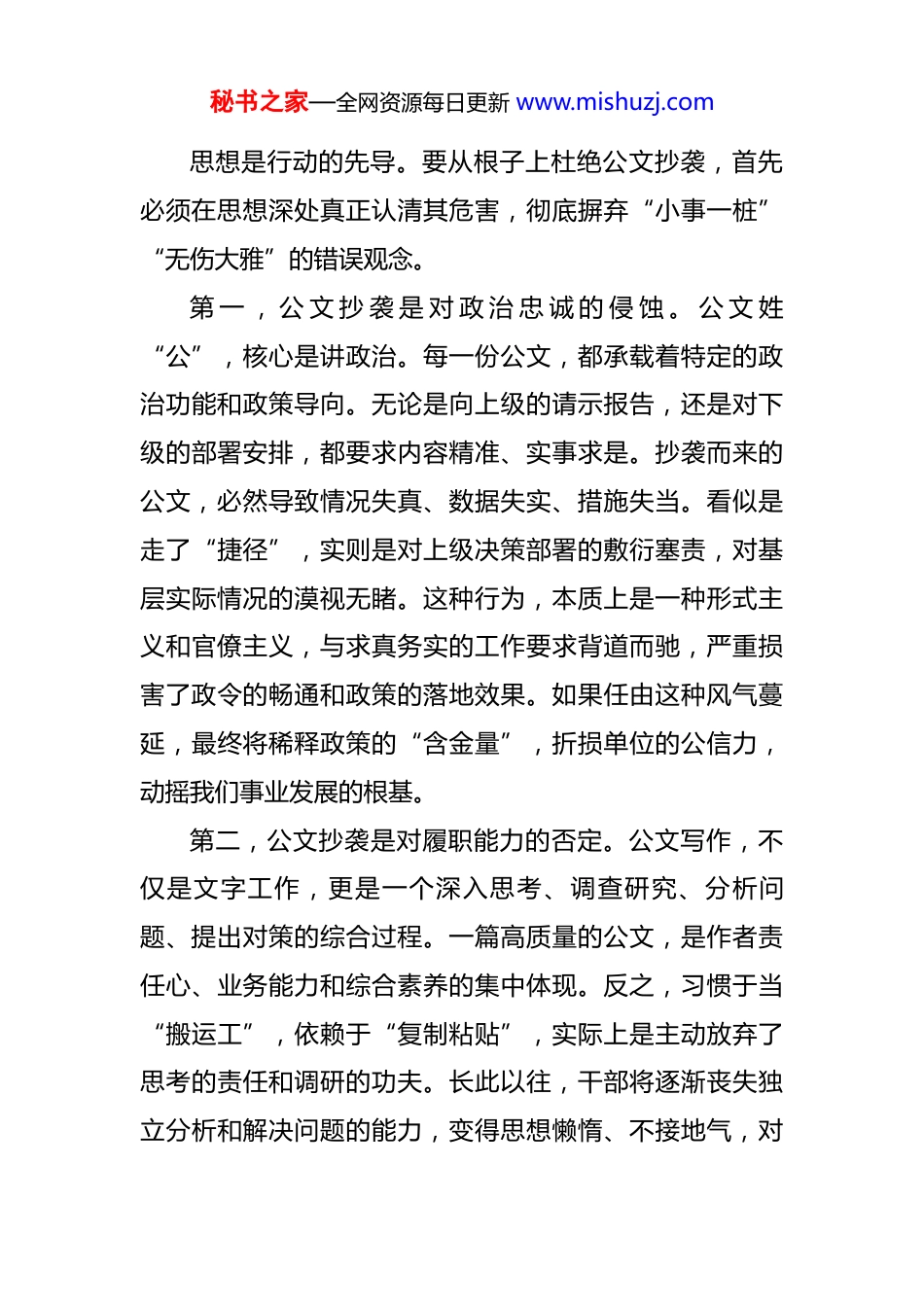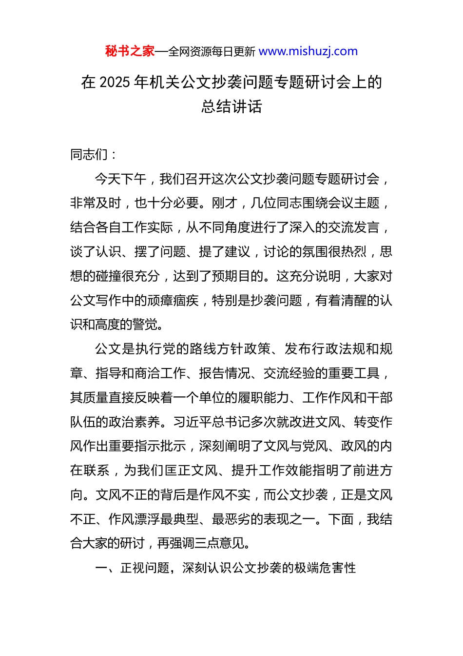 秘书之家—全网资源每日更新 www.mishuzj.com在 2025 年机关公文抄袭问题专题研讨会上的总结讲话 同志们:今天下午,我们召开这次公文抄袭问题专题研讨会,非常及时,也十分必要。刚才,几位同志围绕会议主题,结合各自工作实际,从不同角度进行了深入的交流发言,谈了认识、摆了问题、提了建议,讨论的氛围很热烈,思想的碰撞很充分,达到了预期目的。这充分说明,大家对公文写作中的顽瘴痼疾,特别是抄袭问题,有着清醒的认识和高度的警觉。公文是执行党的路线方针政策、发布行政法规和规章、指导和商洽工作、报告情况、交流经验的重要工具,其质量直接反映着一个单位的履职能力、工作作风和干部队伍的政治素养。习近平总书记多次就改进文风、转变作风作出重要指示批示,深刻阐明了文风与党风、政风的内在联系,为我们匡正文风、提升工作效能指明了前进方向。文风不正的背后是作风不实,而公文抄袭,正是文风不正、作风漂浮最典型、最恶劣的表现之一。下面,我结合大家的研讨,再强调三点意见。一、正视问题,深刻认识公文抄袭的极端危害性秘书之家—全网资源每日更新 www.mishuzj.com思想是行动的先导。要从根子上杜绝公文抄袭,首先必须在思想深处真正认清其危害,彻底摒弃“小事一桩”“无伤大雅”的错误观念。第 一 , 公 文 抄 袭 是 对 政 治 忠 诚 的 侵 蚀 。 公 文 姓“公”,核心是讲政治。每一份公文,都承载着特定的政治功能和政策导向。无论是向上级的请示报告,还是对下级的部署安排,都要求内容精准、实事求是。抄袭而来的公文,必然导致情况失真、数据失实、措施失当。看似是走了“捷径”,实则是对上级决策部署的敷衍塞责,对基层实际情况的漠视无睹。这种行为,本质上是一种形式主义和官僚主义,与求真务实的工作要求背道而驰,严重损害了政令的畅通和政策的落地效果。如果任由这种风气蔓延,最终将稀释政策的“含金量”,折损单位的公信力,动摇我们事业发展的根基。第二,公文抄袭是对履职能力的否定。公文写作,不仅是文字工作,更是一个深入思考、调查研究、分析问题、提出对策的综合过程。一篇高质量的公文,是作者责任心、业务能力和综合素养的集中体现。反之,习惯于当“搬运工”,依赖于“复制粘贴”,实际上是主动放弃了思考的责任和调研的功夫。长此以往,干部将逐渐丧失独立分析和解决问题的能力,变得思想懒惰、不接地气,对秘书之家—全网资源每日更新 www.mishuzj.com本职工作一知半解,对服务对象的需求一问三不知。这不仅是个人的能力退化,更是对组织所赋予职责的严重辜负。近年来,多地曝出公文“同质化”“套路化”甚至原文照搬的恶性抄袭事件,不仅沦为社会笑柄,更暴露出相关单位和个人履职能力的严重缺失。第三,公文抄袭是对纪律规矩的践踏。没有规矩,不成方圆。公文处理有严格的法规制度,公文写作有明确的规范要求。抄袭行为,本身就是对这些规矩的公然挑战和漠视。它破坏了严谨细致的工作风气,助长了投机取巧、弄虚作假的歪风邪气。这种风气一旦形成,就不只停留在文稿层面,还会渗透到项目申报、工作总结、评优评先等各个环节,最终演变成一种“虚假”的组织文化,严重污染单位的政治生态。我们教育系统作为立德树人的重要阵地,为人师表,更应在作风建设上走在前列、作出表率。如果我们自己都文风不正、作风不实,又何以育人、何以正风?必须清醒地看到,尽管我们单位在公文处理效率上取得了一定成绩,例如根据 2025 年上半年的统计,我局收发文流转及时率达到 100%,准确率达到 99.8%,部分科室通过数字化转型,文件处理时效甚至提升了 38%以上。但效率不等于质量,速度不代表水平。我们必须警惕,在追秘书之家—全网资源每日更新 www.mishuzj.com求高效的同时,决不能以牺牲内容的真实性、原创性为代价。公文抄袭的病根在于思想上的“懒癌”和作风上的“软骨病”,必须下猛药、出重拳,坚决根治。二、聚焦关键,构建杜绝公文抄袭的长效机制冰冻三尺非一日之寒。根治公文抄袭问题,不能仅靠一次会议、一次强调,必须立足长远,坚持标本兼治、综合施策,构建起一套科学、严密、管用的长效机制。...