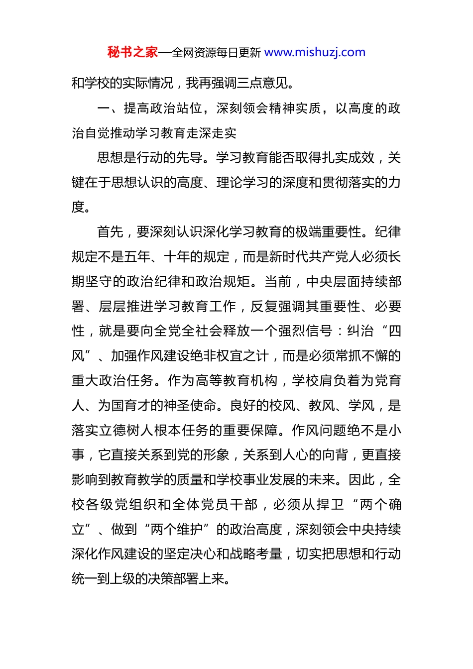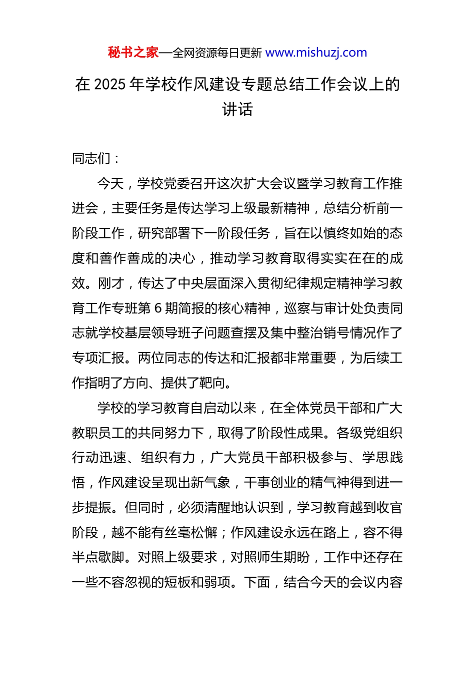秘书之家—全网资源每日更新 www.mishuzj.com在 2025 年学校作风建设专题总结工作会议上的讲话 同志们:今天,学校党委召开这次扩大会议暨学习教育工作推进会,主要任务是传达学习上级最新精神,总结分析前一阶段工作,研究部署下一阶段任务,旨在以慎终如始的态度和善作善成的决心,推动学习教育取得实实在在的成效。刚才,传达了中央层面深入贯彻纪律规定精神学习教育工作专班第 6 期简报的核心精神,巡察与审计处负责同志就学校基层领导班子问题查摆及集中整治销号情况作了专项汇报。两位同志的传达和汇报都非常重要,为后续工作指明了方向、提供了靶向。学校的学习教育自启动以来,在全体党员干部和广大教职员工的共同努力下,取得了阶段性成果。各级党组织行动迅速、组织有力,广大党员干部积极参与、学思践悟,作风建设呈现出新气象,干事创业的精气神得到进一步提振。但同时,必须清醒地认识到,学习教育越到收官阶段,越不能有丝毫松懈;作风建设永远在路上,容不得半点歇脚。对照上级要求,对照师生期盼,工作中还存在一些不容忽视的短板和弱项。下面,结合今天的会议内容秘书之家—全网资源每日更新 www.mishuzj.com和学校的实际情况,我再强调三点意见。一、提高政治站位,深刻领会精神实质,以高度的政治自觉推动学习教育走深走实思想是行动的先导。学习教育能否取得扎实成效,关键在于思想认识的高度、理论学习的深度和贯彻落实的力度。首先,要深刻认识深化学习教育的极端重要性。纪律规定不是五年、十年的规定,而是新时代共产党人必须长期坚守的政治纪律和政治规矩。当前,中央层面持续部署、层层推进学习教育工作,反复强调其重要性、必要性,就是要向全党全社会释放一个强烈信号:纠治“四风”、加强作风建设绝非权宜之计,而是必须常抓不懈的重大政治任务。作为高等教育机构,学校肩负着为党育人、为国育才的神圣使命。良好的校风、教风、学风,是落实立德树人根本任务的重要保障。作风问题绝不是小事,它直接关系到党的形象,关系到人心的向背,更直接影响到教育教学的质量和学校事业发展的未来。因此,全校各级党组织和全体党员干部,必须 从捍卫“两个确立”、做到“两个维护”的政治高度,深刻领会中央持续深化作风建设的坚定决心和战略考量,切实把思想和行动统一到上级的决策部署上来。秘书之家—全网资源每日更新 www.mishuzj.com其次,要精准把握学习教育的核心要求。从刚才传达的简报精神和近期一系列工作部署来看,学习教育的核心要求非常明确,就是要做到学有质量、查有力度、改有成效。“学有质量”,就是要杜绝“雨过地皮湿”式的浅尝辄止,必须原原本本、逐字逐句学习习近平总书记关于学习教育的重要讲话和重要指示批示精神,深刻领会其中蕴含的马克思主义立场、观点和方法,真正做到学思用贯通、知信行统一。“查有力度”,就是要敢于刀刃向内,聚焦纪律规定的具体内容,如改进调查研究、精简会议活动、厉行勤俭节约等方面深入查摆自身及所在单位存在的顽瘴痼疾,特别是形式主义、官僚主义的新动向、新表现。“改有成效”,就是要把整改落实作为检验学习教育成果的“试金石”,以钉钉子精神一抓到底,确保所有问题改彻底、改到位,不留死角、不留尾巴。最后,要切实压紧压实各级党组织的政治责任。学习教育的成效,最终要通过责任链条的传导来实现。学校党委将坚决扛起主体责任,班子成员要以身作则、率先垂范。各基层党总支、直属党支部书记作为“第一责任人”,必须亲自抓、带头抓,不能当“甩手掌柜”。要加强对本单位、本部门学习教育的组织领导和督促指导,确保压力层层传导、责任环环相扣。要将学习教育与中心工秘书之家—全网资源每日更新 www.mishuzj.com作紧密结合,做到两手抓、两不误、两促进,坚决防止“两张皮”现象。要把学习教育的成果,转化为推动学校内涵式发展、提升人才培养质量、增强服务社会能力的强大动力,以高质量发展的实际成果来检验学习教育的成效。二、坚持问题导向,勇于动真碰硬,以彻底的自我革命精神抓好整改整治习近平总书记深刻指出,勇于自我革命,是我们党最鲜明的品格,也是我们党最大的优势。...