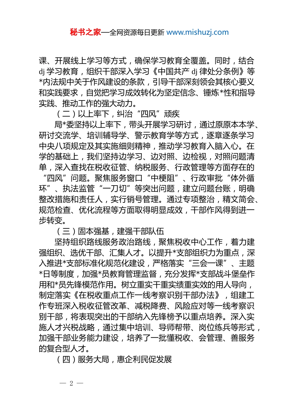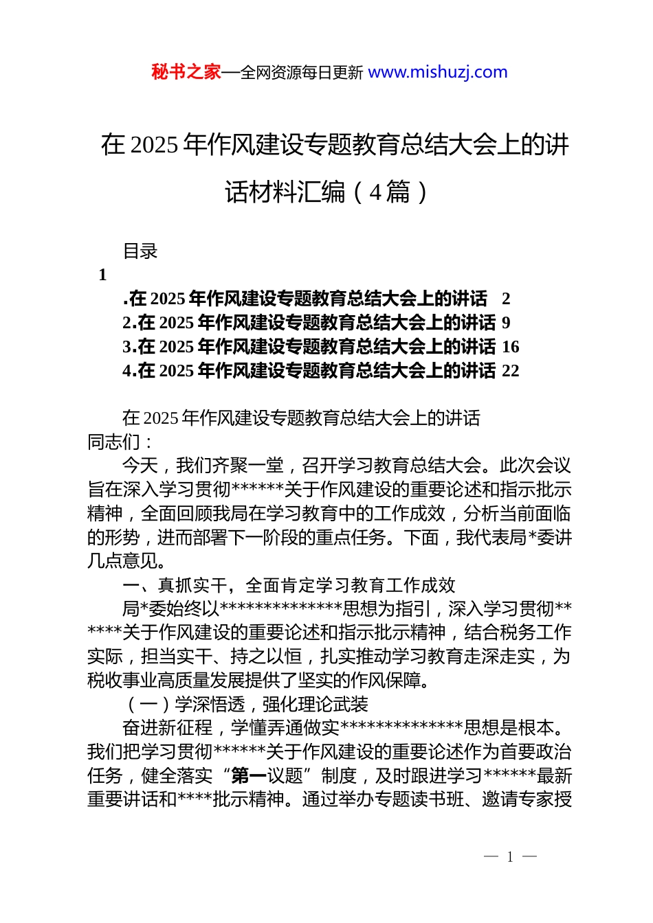 秘书之家—全网资源每日更新 www.mishuzj.com在 2025 年作风建设专题教育总结大会上的讲话材料汇编(4 篇)目录1.在 2025 年作风建设专题教育总结大会上的讲话22.在 2025 年作风建设专题教育总结大会上的讲话 93.在 2025 年作风建设专题教育总结大会上的讲话 164.在 2025 年作风建设专题教育总结大会上的讲话 22在 2025 年作风建设专题教育总结大会上的讲话同志们:今天,我们齐聚一堂,召开学习教育总结大会。此次会议旨在深入学习贯彻******关于作风建设的重要论述和指示批示精神,全面回顾我局在学习教育中的工作成效,分析当前面临的形势,进而部署下一阶段的重点任务。下面,我代表局*委讲几点意见。一、真抓实干,全面肯定学习教育工作成效局*委始终以**************思想为指引,深入学习贯彻******关于作风建设的重要论述和指示批示精神,结合税务工作实际,担当实干、持之以恒,扎实推动学习教育走深走实,为税收事业高质量发展提供了坚实的作风保障。(一)学深悟透,强化理论武装奋进新征程,学懂弄通做实**************思想是根本。我们把学习贯彻******关于作风建设的重要论述作为首要政治任务,健全落实“第一议题”制度,及时跟进学习******最新重要讲话和****批示精神。通过举办专题读书班、邀请专家授— 1 —秘书之家—全网资源每日更新 www.mishuzj.com课、开展线上学习等方式,确保学习教育全覆盖。同时,结合dj 学习教育,组织干部深入学习《中国共产 dj 律处分条例》等*内法规中关于作风建设的条款,引导干部深刻领会其核心要义和实践要求,自觉把学习成效转化为坚定信念、锤炼*性和指导实践、推动工作的强大动力。(二)以上率下,纠治“四风”顽疾局*委坚持以上率下,带头开展学习研讨,通过原原本本学、研讨交流学、培训辅导学、警示教育学等方式,逐章逐条学习中央八项规定及其实施细则精神,推动学习教育入脑入心。在学的基础上,我们坚持边学习、边对照、边检视,对照问题清单,深入查找在税收征管、纳税服务、行政管理等方面存在的“四风”问题。聚焦服务窗口“中梗阻”、行政审批“体外循环”、执法监管“一刀切”等突出问题,建立问题台账,明确整改措施和责任人,实行销号管理。通过专项整治,精文简会、规范检查、优化流程等方面取得明显成效,干部作风得到进一步转变。(三)固本强基,建强干部队伍坚持组织路线服务政治路线,聚焦税收中心工作,着力建强组织、选优干部、汇集人才。以提升*支部组织力为重点,深入推进*支部标准化规范化建设,严格落实“三会一课”、主题*日等制度,加强*员教育管理监督,充分发挥*支部战斗堡垒作用和*员先锋模范作用。树立重实干重实绩重实效的用人导向,制定落实《在税收重点工作一线考察识别干部办法》,组建工作专班深入税收征管改革、减税降费、风险应对等一线考察识别干部,将表现突出的干部纳入先锋榜予以重点培养。深入实施人才兴税战略,通过集中培训、导师帮带、岗位练兵等形式,加强干部业务能力建设,培养了一批懂税收、会管理、善服务的复合型人才。(四)服务大局,惠企利民促发展— 2 —秘书之家—全网资源每日更新 www.mishuzj.com聚焦税收主责主业,主动服务经济社会发展大局,以实际行动践行以人民为中心的发展思想。深入开展“便民办税春风行动”,持续优化税收营商环境。推出一系列便民办税缴费举措,如拓展“非接触式”办税缴费服务、简化办税流程、压缩办税时间等,切实减轻纳税人缴费人负担。加强税收政策宣传辅导,通过举办线上线下培训班、发放宣传资料、开展上门辅导等方式,确保纳税人缴费人应享尽享税收优惠政策。积极参与地方经济建设,加强税收分析研判,为*委政府科学决策提供有力参考。二、聚焦重点,以作风建设新成效推动税收事业新发展(一)强化思想政治引领,筑牢作风建设根基始终将*的政治建设摆在首位,以思想自觉引领行动自觉,推动作风建设内化于心、外化于行。持续深化理论武装,拧紧思想“总开关”。坚持系统性学习,将******关于作风建设的重要论述、关于力戒形式主义官僚主义的****批示精神,纳入各级*委(*组)理论学习中心组学习的年度...