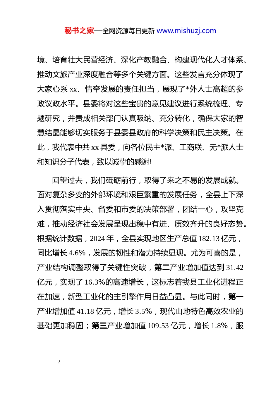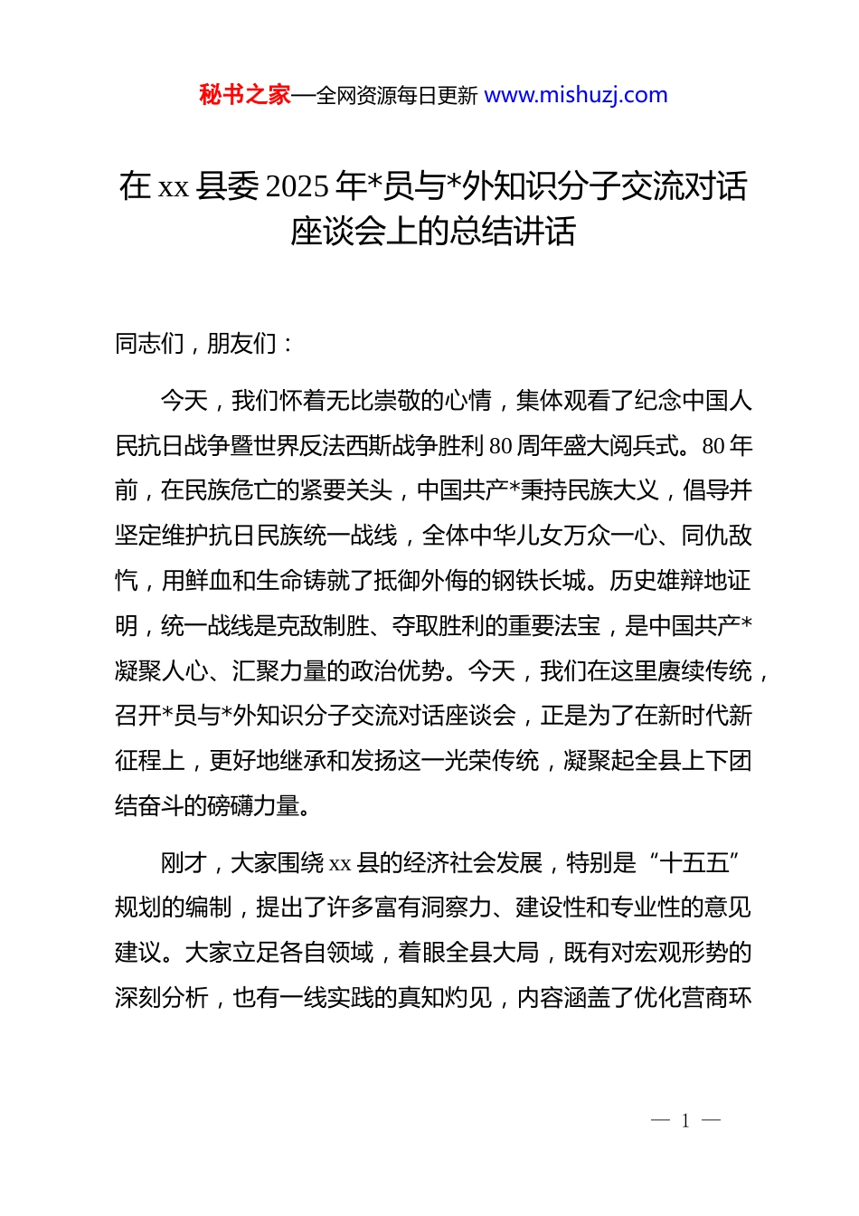 秘书之家—全网资源每日更新 www.mishuzj.com在 xx 县委 2025 年*员与*外知识分子交流对话座谈会上的总结讲话同志们,朋友们:今天,我们怀着无比崇敬的心情,集体观看了纪念中国人民抗日战争暨世界反法西斯战争胜利 80 周年盛大阅兵式。80 年前,在民族危亡的紧要关头,中国共产*秉持民族大义,倡导并坚定维护抗日民族统一战线,全体中华儿女万众一心、同仇敌忾,用鲜血和生命铸就了抵御外侮的钢铁长城。历史雄辩地证明,统一战线是克敌制胜、夺取胜利的重要法宝,是中国共产*凝聚人心、汇聚力量的政治优势。今天,我们在这里赓续传统,召开*员与*外知识分子交流对话座谈会,正是为了在新时代新征程上,更好地继承和发扬这一光荣传统,凝聚起全县上下团结奋斗的磅礴力量。刚才,大家围绕 xx 县的经济社会发展,特别是“十五五”规划的编制,提出了许多富有洞察力、建设性和专业性的意见建议。大家立足各自领域,着眼全县大局,既有对宏观形势的深刻分析,也有一线实践的真知灼见,内容涵盖了优化营商环— 1 —秘书之家—全网资源每日更新 www.mishuzj.com境、培育壮大民营经济、深化产教融合、构建现代化人才体系、推动文旅产业深度融合等多个关键方面。这些发言充分体现了大家心系 xx、情牵发展的责任担当,展现了*外人士高超的参政议政水平。县委将对这些宝贵的意见建议进行系统梳理、专题研究,并责成相关部门认真吸纳、充分转化,确保大家的智慧结晶能够切实服务于县委县政府的科学决策和民主决策。在此,我代表中共 xx 县委,向各位民主*派、工商联、无*派人士和知识分子代表,致以诚挚的感谢!回望过去,我们砥砺前行,取得了来之不易的发展成就。面对复杂多变的外部环境和艰巨繁重的发展任务,全县上下深入贯彻落实中央、省委和市委的决策部署,团结一心,攻坚克难,推动经济社会发展呈现出稳中有进、质效齐升的良好态势。根据统计数据,2024 年,全县实现地区生产总值 182.13 亿元,同比增长 4.6%,发展的韧性和潜力持续显现。尤为可喜的是,产业结构调整取得了关键性突破,第二产业增加值达到 31.42亿元,实现了 16.3%的高速增长,这标志着我县工业化进程正在加速,新型工业化的主引擎作用日益凸显。与此同时,第一产业增加值 41.18 亿元,增长 3.5%,现代山地特色高效农业的基础更加稳固;第三产业增加值 109.53 亿元,增长 1.8%,服— 2 —秘书之家—全网资源每日更新 www.mishuzj.com务业在稳定经济大盘、吸纳就业方面继续发挥着“压舱石”作用。全年财政总收入达到 9.63 亿元,为各项事业的发展提供了坚实的财力保障。这些成绩的取得,是全县人民共同奋斗的结果,也饱含着在座各位*外朋友的智慧和汗水。展望未来,我们正站在一个新的历史起点上。2025 年是“十四五”规划的收官之年,也是科学谋划“十五五”发展的关键之年。当前,我们既面临着国家深入实施西部大开发、乡村振兴等重大战略带来的历史性机遇,也必须清醒地认识到,发展不平衡不充分的问题依然存在,产业转型升级的压力依然巨大,民生领域还有不少短板亟待补齐。船到中流浪更急,人到半山路更陡。在这个关键时期,比以往任何时候都更需要汇聚众智、凝聚共识,比以往任何时候都更需要我们肝胆相照、荣辱与共。希望各位*外人士朋友能够继续与中共 xx 县委想在一起、站在一起、干在一起,同心同德、同向同行,共同谱写xx 高质量发展的新篇章。借此机会,我提三点希望,与大家共勉。第一,争当服务发展的“智囊团”,在精准建言献策上展现新作为高质量发展是新时代的硬道理,也是我们谋划“十五五”— 3 —秘书之家—全网资源每日更新 www.mishuzj.com时期的核心主题。*外人士队伍人才荟萃、智力密集、联系广泛,是推动 xx 高质量发展的宝贵智力资源。大家要充分发挥专业优势、智力优势和视野优势,紧紧围绕县委县政府的中心工作,聚焦事关全县发展的全局性、战略性和前瞻性问题,深入开展调查研究,提出更多有价值、有分量、可操作的意见建议。一是要聚焦产业能级提升开展深度研究。我县第二产业已经展现出强劲的增长势头,但如何从“量的增长”迈向“质的飞跃...
