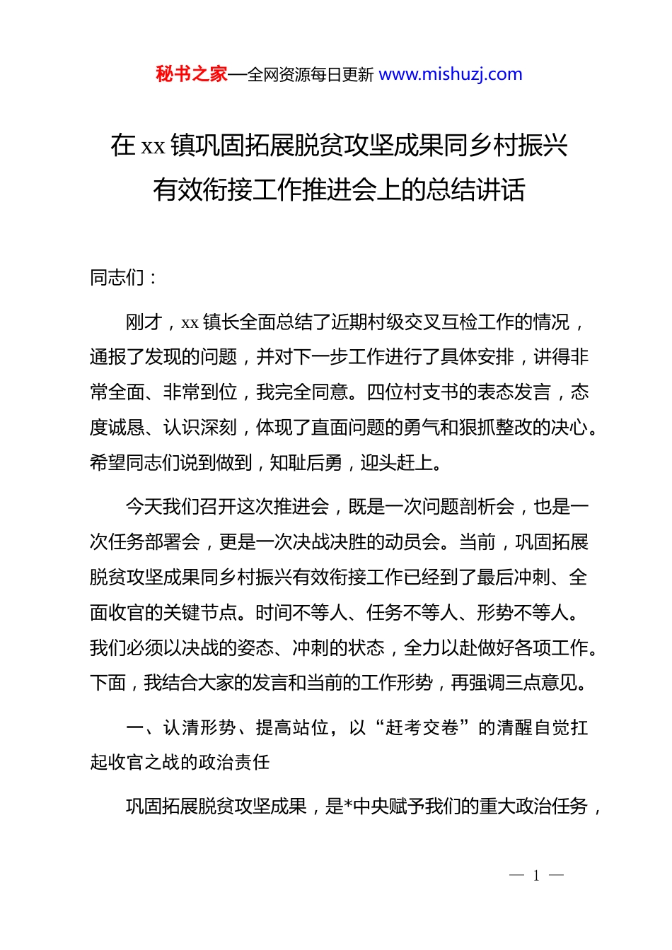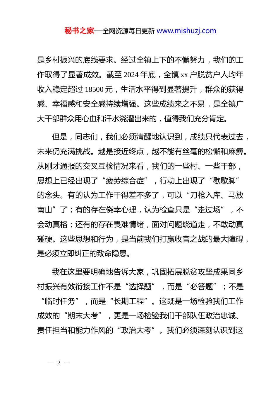 秘书之家—全网资源每日更新 www.mishuzj.com在 xx 镇巩固拓展脱贫攻坚成果同乡村振兴有效衔接工作推进会上的总结讲话同志们:刚才,xx 镇长全面总结了近期村级交叉互检工作的情况,通报了发现的问题,并对下一步工作进行了具体安排,讲得非常全面、非常到位,我完全同意。四位村支书的表态发言,态度诚恳、认识深刻,体现了直面问题的勇气和狠抓整改的决心。希望同志们说到做到,知耻后勇,迎头赶上。今天我们召开这次推进会,既是一次问题剖析会,也是一次任务部署会,更是一次决战决胜的动员会。当前,巩固拓展脱贫攻坚成果同乡村振兴有效衔接工作已经到了最后冲刺、全面收官的关键节点。时间不等人、任务不等人、形势不等人。我们必须以决战的姿态、冲刺的状态,全力以赴做好各项工作。下面,我结合大家的发言和当前的工作形势,再强调三点意见。一、认清形势、提高站位,以“赶考交卷”的清醒自觉扛起收官之战的政治责任巩固拓展脱贫攻坚成果,是*中央赋予我们的重大政治任务,— 1 —秘书之家—全网资源每日更新 www.mishuzj.com是乡村振兴的底线要求。经过全镇上下的不懈努力,我们的工作取得了显著成效。截至 2024 年底,全镇 xx 户脱贫户人均年收入稳定超过 18500 元,生活水平得到显著提升,群众的获得感、幸福感和安全感持续增强。这些成绩来之不易,是全镇广大干部群众用心血和汗水浇灌出来的,值得我们充分肯定。但是,同志们,我们必须清醒地认识到,成绩只代表过去,未来仍充满挑战。越是接近终点,越不能有丝毫的松懈和麻痹。从刚才通报的交叉互检情况来看,我们的一些村、一些干部,思想上已经出现了“疲劳综合症”,行动上出现了“歇歇脚”的念头。有的认为工作干得差不多了,可以“刀枪入库、马放南山”了;有的存在侥幸心理,认为检查只是“走过场”,不会动真格;还有的存在畏难情绪,面对问题绕道走,不敢动真碰硬。这些思想和行为,是当前我们打赢收官之战的最大障碍,是必须立即纠正的致命隐患。我在这里要明确地告诉大家,巩固拓展脱贫攻坚成果同乡村振兴有效衔接工作不是“选择题”,而是“必答题”;不是“临时任务”,而是“长期工程”。这既是一场检验我们工作成效的“期末大考”,更是一场检验我们干部队伍政治忠诚、责任担当和能力作风的“政治大考”。我们必须深刻认识到这— 2 —秘书之家—全网资源每日更新 www.mishuzj.com项工作的极端重要性,坚决把思想和行动统一到中央、省、市、县的决策部署上来。要彻底摒弃“过关”思想,牢固树立“交卷”意识,把这次迎检作为一次全面的自我体检和自我提升。要以对*和人民高度负责的态度,以务实担当的作风,拿出“滚石上山、爬坡过坎”的勇气和毅力,把各项工作抓实、抓细、抓到位,确保我们交出的这份答卷,能够经得起历史、实践和人民的检验。二、聚焦短板、精准施策,以“钉钉子”的精神攻克瓶颈难题问题是时代的声音,也是我们工作的导向。刚才通报的问题,个个都切中要害,反映出我们在工作中还存在不少短板和漏洞。我们必须坚持问题导向,拿出壮士断腕的决心,下足“绣花”功夫,精准发力,靶向治疗,确保所有问题见底清零,所有工作提质增效。第一,要坚决杜绝“应纳未纳、体外循环”,织密织牢动态监测“防护网”。防止返贫动态监测和帮扶是我们的核心任务,是守住不发生规模性返贫底线的关键一招。但在检查中,我们发现“应纳未纳”和“体外循环”的问题依然存在。所谓“应纳未纳”,就是由于我们工作疏忽或政策执行不到位,导— 3 —秘书之家—全网资源每日更新 www.mishuzj.com致一些存在返贫致贫风险的农户没有被及时识别为监测对象,游离于我们的帮扶体系之外。而“体外循环”,则是虽然发现了风险,但没有按规定程序纳入监测,只是在机制外给予一些临时性、非制度化的帮扶。这两种现象,本质上都是责任缺失、作风不实,严重影响了政策的公平性和帮扶的精准性,是绝对不能容忍的。各村、各相关站所必须立即行动起来,开展一次拉网式、地毯式的大排查、大起底。要逐村逐户逐人,特别是针对脱贫不稳定户、边缘易致贫户以及因病因灾因意外事故等刚性支出较大或收入大幅缩...