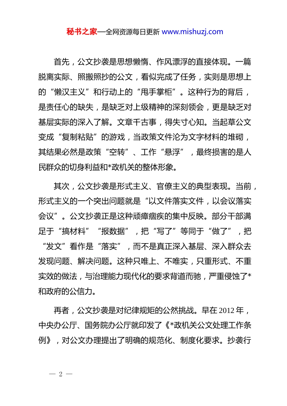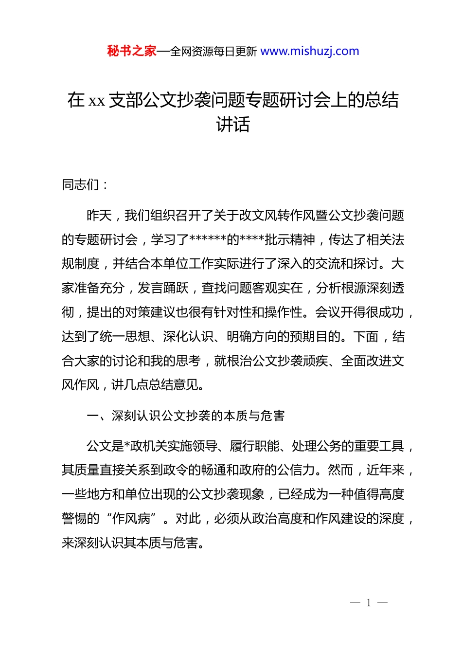 秘书之家—全网资源每日更新 www.mishuzj.com在 xx 支部公文抄袭问题专题研讨会上的总结讲话同志们:昨天,我们组织召开了关于改文风转作风暨公文抄袭问题的专题研讨会,学习了******的****批示精神,传达了相关法规制度,并结合本单位工作实际进行了深入的交流和探讨。大家准备充分,发言踊跃,查找问题客观实在,分析根源深刻透彻,提出的对策建议也很有针对性和操作性。会议开得很成功,达到了统一思想、深化认识、明确方向的预期目的。下面,结合大家的讨论和我的思考,就根治公文抄袭顽疾、全面改进文风作风,讲几点总结意见。一、深刻认识公文抄袭的本质与危害公文是*政机关实施领导、履行职能、处理公务的重要工具,其质量直接关系到政令的畅通和政府的公信力。然而,近年来,一些地方和单位出现的公文抄袭现象,已经成为一种值得高度警惕的“作风病”。对此,必须从政治高度和作风建设的深度,来深刻认识其本质与危害。— 1 —秘书之家—全网资源每日更新 www.mishuzj.com首先,公文抄袭是思想懒惰、作风漂浮的直接体现。一篇脱离实际、照搬照抄的公文,看似完成了任务,实则是思想上的“懒汉主义”和行动上的“甩手掌柜”。这种行为的背后,是责任心的缺失,是缺乏对上级精神的深刻领会,更是缺乏对基层实际的深入了解。文章千古事,得失寸心知。当起草公文变成“复制粘贴”的游戏,当政策文件沦为文字材料的堆砌,其结果必然是政策“空转”、工作“悬浮”,最终损害的是人民群众的切身利益和*政机关的整体形象。其次,公文抄袭是形式主义、官僚主义的典型表现。当前,形式主义的一个突出问题就是“以文件落实文件,以会议落实会议”。公文抄袭正是这种顽瘴痼疾的集中反映。部分干部满足于“搞材料”“报数据”,把“写了”等同于“做了”,把“发文”看作是“落实”,而不是真正深入基层、深入群众去发现问题、解决问题。这种只唯上、不唯实,只重形式、不重实效的做法,与治理能力现代化的要求背道而驰,严重侵蚀了*和政府的公信力。再者,公文抄袭是对纪律规矩的公然挑战。早在 2012 年,中央办公厅、国务院办公厅就印发了《*政机关公文处理工作条例》,对公文办理提出了明确的规范化、制度化要求。抄袭行— 2 —秘书之家—全网资源每日更新 www.mishuzj.com为不仅违背了公文写作的基本要求,更是对组织纪律和工作规矩的漠视。一些单位因公文抄袭问题受到严肃处理的案例,足以说明这绝非小事,而是必须严肃对待的纪律问题。随着大数据、人工智能技术的飞速发展,抄袭行为的识别与追溯变得越来越容易,这给监督执纪提供了新的技术手段,也对每一位公文起草者和审核者提出了更高的要求。二、深挖根源剖析公文抄袭现象背后的作风沉疴冰冻三尺非一日之寒。公文抄袭现象屡禁不止,其根源在于作风建设上存在的深层次问题。破解这一难题,必须用解剖麻雀的精神,深挖其背后的作风沉疴。一是政治站位不高,责任担当精神弱化。部分干部没有从讲政治的高度看待文风问题,认为公文写作只是“笔杆子”的技术活,与政治能力、大局观念无关。这种认识上的偏差,导致其在工作中缺乏“求真务实”的精神和“极端负责”的态度。面对急难险重的任务,不是主动思考、深入研究,而是习惯于当“二传手”,从网上、从旧文中寻找“模板”,满足于“依葫芦画瓢”,看似走了捷径,实则丢掉了作为一名干部的责任与担当。— 3 —秘书之家—全网资源每日更新 www.mishuzj.com二是调查研究不深,脱离实际脱离群众。文风是作风的“晴雨表”。******反复强调,要倡导“短、实、新”的文风,反对“假、长、空”。好的文风来源于深入的调查研究。没有调查,就没有发言权,更没有决策权。一些干部习惯于坐在办公室里“闭门造车”,满足于看来电、看报表,不愿、不肯、不敢深入基层一线,听不到群众的真实声音,看不到工作的实际困难,写出来的文件自然是言之无物、空洞乏味,除了抄袭,也别无他法。这种状况下产出的公文,既不能准确反映情况,也无法有效指导实践。三是审核把关不严,监督问责机制虚化。公文抄袭现象的发生,起草人固然是第一责任人,但审核把关环节的失守同样难辞其咎。一...