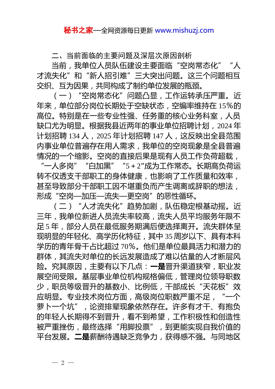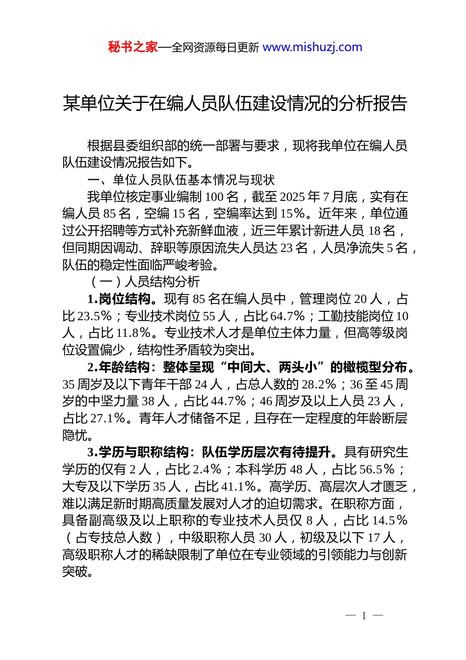 秘书之家—全网资源每日更新 www.mishuzj.com某单位关于在编人员队伍建设情况的分析报告根据县委组织部的统一部署与要求,现将我单位在编人员队伍建设情况报告如下。一、单位人员队伍基本情况与现状我单位核定事业编制 100 名,截至 2025 年 7 月底,实有在编人员 85 名,空编 15 名,空编率达到 15%。近年来,单位通过公开招聘等方式补充新鲜血液,近三年累计新进人员 18 名,但同期因调动、辞职等原因流失人员达 23 名,人员净流失 5 名,队伍的稳定性面临严峻考验。(一)人员结构分析1.岗位结构。现有 85 名在编人员中,管理岗位 20 人,占比 23.5%;专业技术岗位 55 人,占比 64.7%;工勤技能岗位 10人,占比 11.8%。专业技术人才是单位主体力量,但高等级岗位设置偏少,结构性矛盾较为突出。2.年龄结构:整体呈现“中间大、两头小”的橄榄型分布。35 周岁及以下青年干部 24 人,占总人数的 28.2%;36 至 45 周岁的中坚力量 38 人,占比 44.7%;46 周岁及以上人员 23 人,占比 27.1%。青年人才储备不足,且存在一定程度的年龄断层隐忧。3.学历与职称结构:队伍学历层次有待提升。具有研究生学历的仅有 2 人,占比 2.4%;本科学历 48 人,占比 56.5%;大专及以下学历 35 人,占比 41.1%。高学历、高层次人才匮乏,难以满足新时期高质量发展对人才的迫切需求。在职称方面,具备副高级及以上职称的专业技术人员仅 8 人,占比 14.5%(占专技总人数),中级职称人员 30 人,初级及以下 17 人,高级职称人才的稀缺限制了单位在专业领域的引领能力与创新突破。— 1 —秘书之家—全网资源每日更新 www.mishuzj.com二、当前面临的主要问题及深层次原因剖析当前,我单位人员队伍建设主要面临“空岗常态化”“人才流失化”和“新人招引难”三大突出问题。这三个问题相互交织、互为因果,共同构成了制约单位发展的瓶颈。(一)“空岗常态化”问题凸显,工作运转承压严重。近年来,单位部分岗位长期处于空缺状态,空编率维持在 15%的高位。特别是在一些专业性强、任务重的核心业务科室,人员缺口尤为明显。根据我县近两年的事业单位招聘计划,2024 年计划招聘 134 人,2025 年计划招聘 147 人,这反映出全县范围内事业单位普遍存在用人需求,我单位的空岗现象是全县普遍情况的一个缩影。空岗的直接后果是现有人员工作负荷超载,“一人多岗”“白加黑”“5+2”成为工作常态。长期高负荷运转不仅透支干部职工的身体健康,也影响了工作质量和效率,甚至导致部分干部职工因不堪重负而产生调离或辞职的想法,形成“空岗—加压—流失—更空岗”的恶性循环。(二)“人才流失化”趋势加剧,队伍稳定根基动摇。近三年,我单位新进人员流失率较高,流失人员平均服务年限不足 5 年,部分人员在最低服务期满后便选择离开。流失群体呈现明显的年轻化、高学历化特征,其中 35 周岁以下、具有本科学历的青年骨干占比超过 70%。他们是单位最具活力和潜力的群体,其流失对单位的长远发展造成了难以估量的人才断层风险。究其原因,主要有以下几点:一是晋升渠道狭窄,职业发展空间受限。基层事业单位机构规格偏低,管理岗位领导职数少,职员等级晋升的基数小、比例低,干部成长“天花板”效应明显。专业技术岗位方面,高级岗位职数严重不足,“一个萝卜一个坑”,论资排辈现象依然存在。许多有才干、有抱负的年轻人长期得不到晋升,看不到希望,工作积极性和创造性被严重挫伤,最终选择“用脚投票”,到更能实现自我价值的平台发展。二是薪酬待遇缺乏竞争力,获得感不强。与同地区— 2 —秘书之家—全网资源每日更新 www.mishuzj.com同级别的公务员相比,我单位人员在收入上存在明显差距,最直观的便是缺少公务交通补贴。根据相关政策,*县公务员依据职级每月可享受数百至上千元不等的交通补贴,而事业单位人员此项福利为空白,仅此一项每年收入差距就可达数千甚至上万元。此外,基础性绩效奖金的发放标准也低于部分市级单位和经济发达地区,未能充分体现基层工作的辛苦和贡献,导致心理失衡,影响工作热情。三...