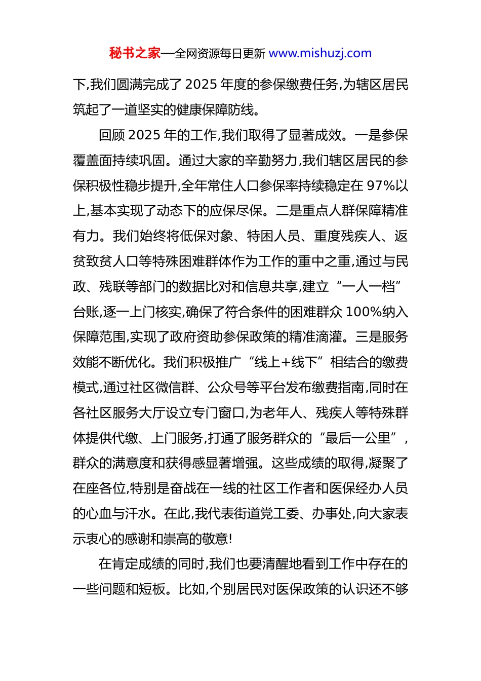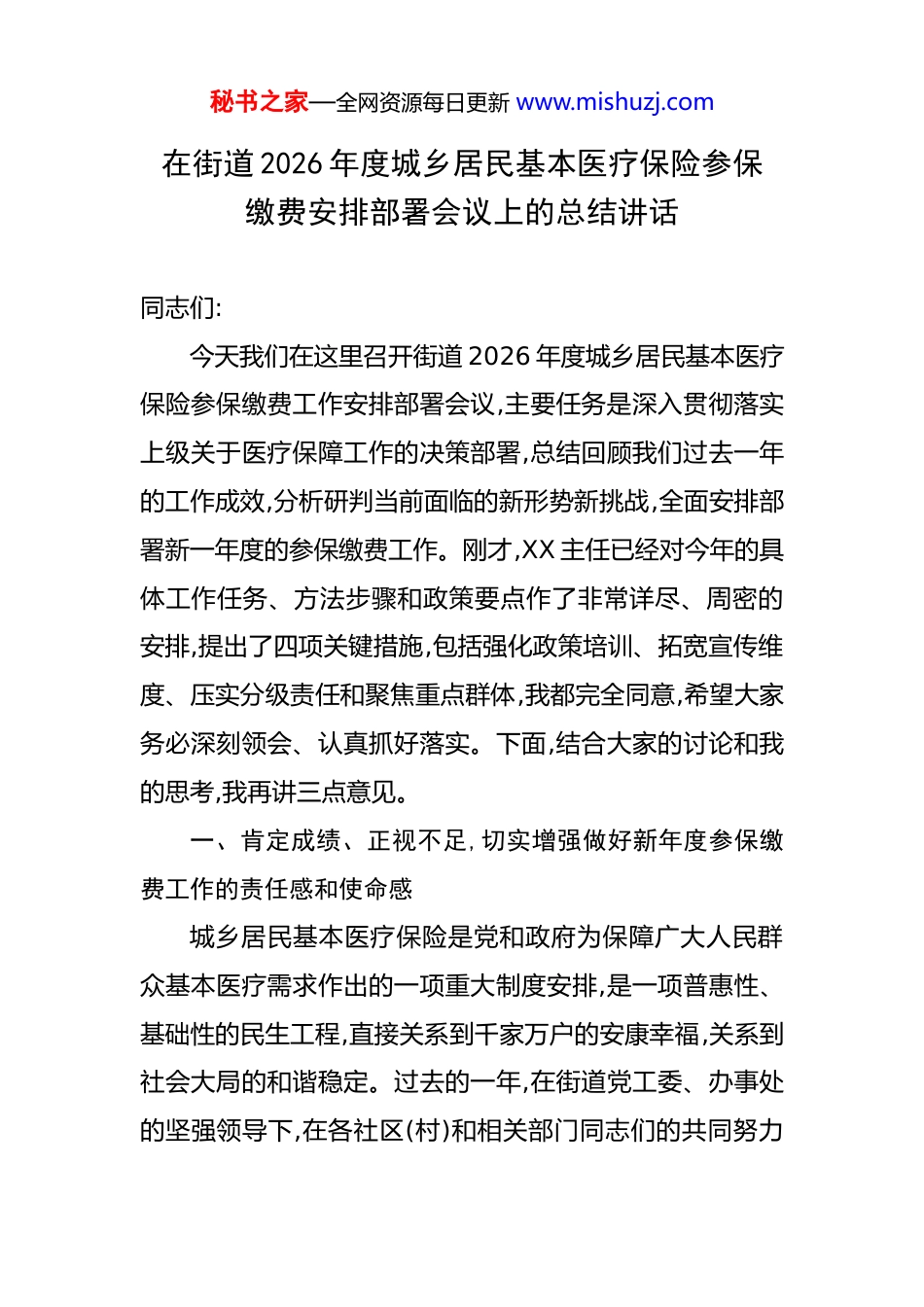 秘书之家—全网资源每日更新 www.mishuzj.com在街道 2026 年度城乡居民基本医疗保险参保缴费安排部署会议上的总结讲话 同志们:今天我们在这里召开街道 2026 年度城乡居民基本医疗保险参保缴费工作安排部署会议,主要任务是深入贯彻落实上级关于医疗保障工作的决策部署,总结回顾我们过去一年的工作成效,分析研判当前面临的新形势新挑战,全面安排部署新一年度的参保缴费工作。刚才,XX 主任已经对今年的具体工作任务、方法步骤和政策要点作了非常详尽、周密的安排,提出了四项关键措施,包括强化政策培训、拓宽宣传维度、压实分级责任和聚焦重点群体,我都完全同意,希望大家务必深刻领会、认真抓好落实。下面,结合大家的讨论和我的思考,我再讲三点意见。一、肯定成绩、正视不足,切实增强做好新年度参保缴费工作的责任感和使命感城乡居民基本医疗保险是党和政府为保障广大人民群众基本医疗需求作出的一项重大制度安排,是一项普惠性、基础性的民生工程,直接关系到千家万户的安康幸福,关系到社会大局的和谐稳定。过去的一年,在街道党工委、办事处的坚强领导下,在各社区(村)和相关部门同志们的共同努力秘书之家—全网资源每日更新 www.mishuzj.com下,我们圆满完成了 2025 年度的参保缴费任务,为辖区居民筑起了一道坚实的健康保障防线。回顾 2025 年的工作,我们取得了显著成效。一是参保覆盖面持续巩固。通过大家的辛勤努力,我们辖区居民的参保积极性稳步提升,全年常住人口参保率持续稳定在 97%以上,基本实现了动态下的应保尽保。二是重点人群保障精准有力。我们始终将低保对象、特困人员、重度残疾人、返贫致贫人口等特殊困难群体作为工作的重中之重,通过与民政、残联等部门的数据比对和信息共享,建立“一人一档”台账,逐一上门核实,确保了符合条件的困难群众 100%纳入保障范围,实现了政府资助参保政策的精准滴灌。三是服务效能不断优化。我们积极推广“线上+线下”相结合的缴费模式,通过社区微信群、公众号等平台发布缴费指南,同时在各社区服务大厅设立专门窗口,为老年人、残疾人等特殊群体提供代缴、上门服务,打通了服务群众的“最后一公里”,群众的满意度和获得感显著增强。这些成绩的取得,凝聚了在座各位,特别是奋战在一线的社区工作者和医保经办人员的心血与汗水。在此,我代表街道党工委、办事处,向大家表示衷心的感谢和崇高的敬意!在肯定成绩的同时,我们也要清醒地看到工作中存在的一些问题和短板。比如,个别居民对医保政策的认识还不够秘书之家—全网资源每日更新 www.mishuzj.com深入,认为自己身体健康、年轻力壮,参保意愿不强,存在侥幸心理;宣传方式有时还不够灵活多样,政策解读的通俗化、精准化程度还有待提高;面对人口流动性增大、人户分离现象普遍的新情况,对流动人口、新迁入居民的参保动员和信息核查工作还面临新的挑战;个别网格员在面对群众疑问时,对政策细节的掌握还不够熟练,影响了工作效率。对于这些问题,我们必须高度重视,在 2026 年度的工作中采取更加有力的措施,切实加以解决。二、提高站位、深化认识,准确把握新年度参保缴费工作的核心要义和目标要求做好 2026 年度的参保缴费工作,不仅是完成一项常规性的业务工作,更是一项必须扛稳抓牢的重大政治任务。我们必须站在全局和战略的高度,深刻认识其重要性和紧迫性。第一,这是践行“人民至上、生命至上”理念的根本要求。医疗保障是减轻群众就医负担、增进民生福祉、维护社会和谐稳定的重大制度安排。党的二十大报告明确提出,要“促进多层次医疗保障有序衔接,完善大病保险和医疗救助制度,落实异地就医结算,建立长期护理保险制度,积极发展商业医疗保险”。抓好城乡居民医保参保工作,就是把党中央的温暖送到千家万户,防止群众因病致贫、因病返贫的最秘书之家—全网资源每日更新 www.mishuzj.com直接、最有效的举措。我们每一位同志都要怀着对人民群众的深厚感情,把这项工作作为检验我们初心使命的“试金石”,用心用情用力,把好事办好、实事办实。第二,这是应对风险挑战、筑牢社会稳定“压舱石”的现实需要。当前,外部环境复杂多变,经济下行压力依然存在,居民就业和收入预期受到一定影响。越是在这样的时...