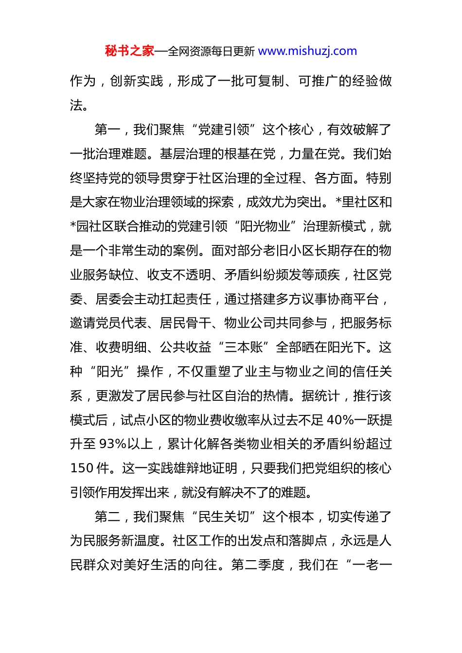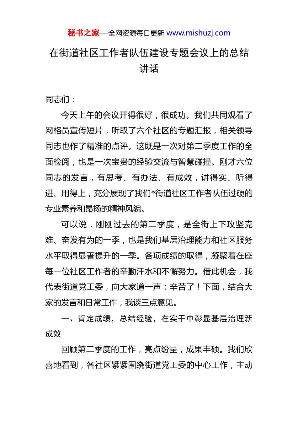 秘书之家—全网资源每日更新 www.mishuzj.com在街道社区工作者队伍建设专题会议上的总结讲话 同志们:今天上午的会议开得很好,很成功。我们共同观看了网格员宣传短片,听取了六个社区的专题汇报,相关领导同志也作了精准的点评。这既是一次对第二季度工作的全面检阅,也是一次宝贵的经验交流与智慧碰撞。刚才六位同志的发言,有思考、有办法、有成效,讲得实、听得进、用得上,充分展现了我们*街道社区工作者队伍过硬的专业素养和昂扬的精神风貌。可以说,刚刚过去的第二季度,是全街上下攻坚克难、奋发有为的一季,也是我们基层治理能力和社区服务水平取得显著提升的一季。各项成绩的取得,凝聚着在座每一位社区工作者的辛勤汗水和不懈努力。借此机会,我代表街道党工委,向大家道一声:辛苦了!下面,结合大家的发言和日常工作,我谈三点意见。一、肯定成绩,总结经验,在实干中彰显基层治理新成效回顾第二季度的工作,亮点纷呈,成果丰硕。我们欣喜地看到,各社区紧紧围绕街道党工委的中心工作,主动秘书之家—全网资源每日更新 www.mishuzj.com作为,创新实践,形成了一批可复制、可推广的经验做法。第一,我们聚焦“党建引领”这个核心,有效破解了一批治理难题。基层治理的根基在党,力量在党。我们始终坚持党的领导贯穿于社区治理的全过程、各方面。特别是大家在物业治理领域的探索,成效尤为突出。*里社区和*园社区联合推动的党建引领“阳光物业”治理新模式,就是一个非常生动的案例。面对部分老旧小区长期存在的物业服务缺位、收支不透明、矛盾纠纷频发等顽疾,社区党委、居委会主动扛起责任,通过搭建多方议事协商平台,邀请党员代表、居民骨干、物业公司共同参与,把服务标准、收费明细、公共收益“三本账”全部晒在阳光下。这种“阳光”操作,不仅重塑了业主与物业之间的信任关系,更激发了居民参与社区自治的热情。据统计,推行该模式后,试点小区的物业费收缴率从过去不足 40%一跃提升至 93%以上,累计化解各类物业相关的矛盾纠纷超过150 件。这一实践雄辩地证明,只要我们把党组织的核心引领作用发挥出来,就没有解决不了的难题。第二,我们聚焦“民生关切”这个根本,切实传递了为民服务新温度。社区工作的出发点和落脚点,永远是人民群众对美好生活的向往。第二季度,我们在“一老一秘书之家—全网资源每日更新 www.mishuzj.com小”等重点群体的服务上投入了大量精力。*里社区针对辖区老年人口多、空巢独居比例高的特点,深入开展解围纾困专项行动,探索建立了“时间银行”互助养老服务机制,鼓励低龄健康老人和社区志愿者为高龄、失能老人提供陪伴、助餐、助洁等服务。仅第二季度,就为超过 300名老年人提供了近 2000 小时的志愿服务。同时,社区还联合卫生服务中心,为辖区 95%以上超过 80 岁的高龄老人建立了电子健康档案,并成功预警并协助处置了 58 起独居老人的紧急健康状况,真正做到了民有所呼、我有所应。此外,*家社区将党建与志愿服务深度融合,打造了一系列特色服务项目,注册志愿者人数较一季度增长 20%,累计服务时长超过 8000 小时,这些闪亮的数据背后,是我们对民生福祉的深切关怀和有力担当。第三,我们聚焦“队伍建设”这个关键,充分激发了干事创业新动能。事业成败,关键在人。一支高素质、专业化的社区工作者队伍,是做好一切工作的基础。*里社区分享的青年社工成长转变案例,让我们看到了新生力量的快速崛起;*里社区关于副职作用发挥和网格管理的经验,则体现了我们团队内部的协同作战能力。街道党工委高度重视社工队伍建设,持续实施“青苗”培养计划,通过“经验传帮带”等方式,让经验丰富的老社工与充满活力秘书之家—全网资源每日更新 www.mishuzj.com的年轻社工结成对子,在实践中互学共进。正是这种良好的传帮带氛围和团队协作精神,锻造了一支召之即来、来之能战、战之必胜的铁军队伍。这支队伍,是我们应对一切风险挑战、推动工作不断向前的最宝贵财富。二、深化认识,对标对表,用“三有理念”指导基层治理新实践成绩固然可喜,但我们更要清醒地看到,社区治理工作千头万绪、永无止境,居民群众的需求日...