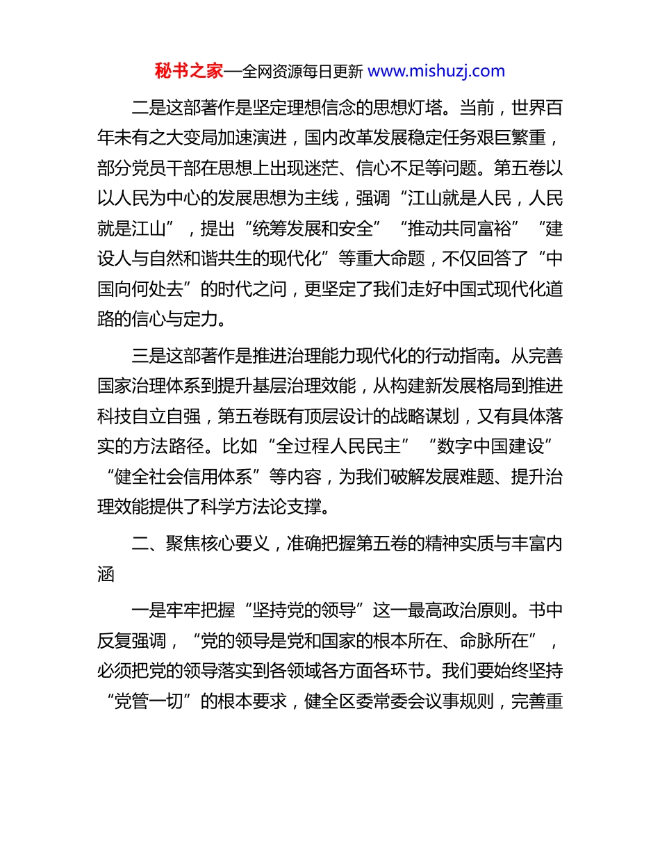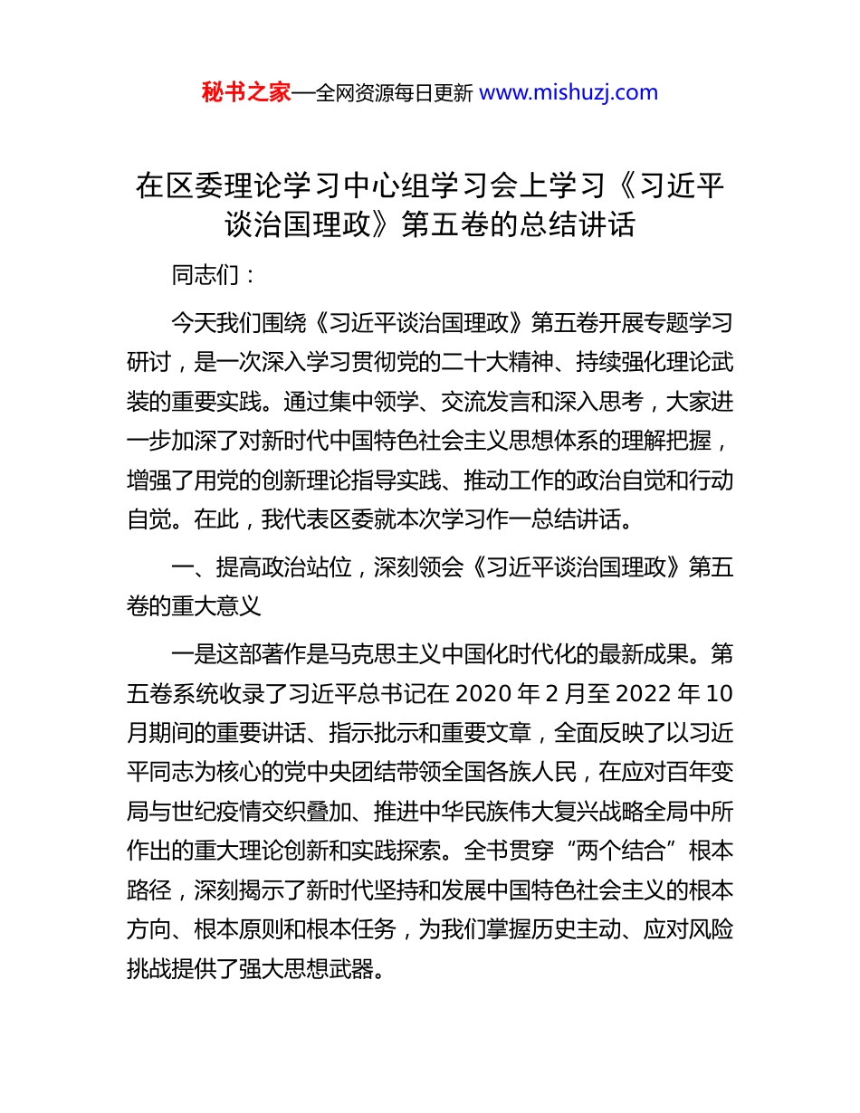秘书之家—全网资源每日更新 www.mishuzj.com在区委理论学习中心组学习会上学习《习近平谈治国理政》第五卷的总结讲话同志们:今天我们围绕《习近平谈治国理政》第五卷开展专题学习研讨,是一次深入学习贯彻党的二十大精神、持续强化理论武装的重要实践。通过集中领学、交流发言和深入思考,大家进一步加深了对新时代中国特色社会主义思想体系的理解把握,增强了用党的创新理论指导实践、推动工作的政治自觉和行动自觉。在此,我代表区委就本次学习作一总结讲话。一、提高政治站位,深刻领会《习近平谈治国理政》第五卷的重大意义一是这部著作是马克思主义中国化时代化的最新成果。第五卷系统收录了习近平总书记在 2020 年 2 月至 2022 年 10月期间的重要讲话、指示批示和重要文章,全面反映了以习近平同志为核心的党中央团结带领全国各族人民,在应对百年变局与世纪疫情交织叠加、推进中华民族伟大复兴战略全局中所作出的重大理论创新和实践探索。全书贯穿“两个结合”根本路径,深刻揭示了新时代坚持和发展中国特色社会主义的根本方向、根本原则和根本任务,为我们掌握历史主动、应对风险挑战提供了强大思想武器。秘书之家—全网资源每日更新 www.mishuzj.com二是这部著作是坚定理想信念的思想灯塔。当前,世界百年未有之大变局加速演进,国内改革发展稳定任务艰巨繁重,部分党员干部在思想上出现迷茫、信心不足等问题。第五卷以以人民为中心的发展思想为主线,强调“江山就是人民,人民就是江山”,提出“统筹发展和安全”“推动共同富裕”“建设人与自然和谐共生的现代化”等重大命题,不仅回答了“中国向何处去”的时代之问,更坚定了我们走好中国式现代化道路的信心与定力。三是这部著作是推进治理能力现代化的行动指南。从完善国家治理体系到提升基层治理效能,从构建新发展格局到推进科技自立自强,第五卷既有顶层设计的战略谋划,又有具体落实的方法路径。比如“全过程人民民主”“数字中国建设”“健全社会信用体系”等内容,为我们破解发展难题、提升治理效能提供了科学方法论支撑。二、聚焦核心要义,准确把握第五卷的精神实质与丰富内涵一是牢牢把握“坚持党的领导”这一最高政治原则。书中反复强调,“党的领导是党和国家的根本所在、命脉所在”,必须把党的领导落实到各领域各方面各环节。我们要始终坚持“党管一切”的根本要求,健全区委常委会议事规则,完善重秘书之家—全网资源每日更新 www.mishuzj.com大事项请示报告制度,确保党中央决策部署在本区不折不扣落地见效。二是深刻理解“以人民为中心”的价值取向。第五卷明确指出:“人民对美好生活的向往,就是我们的奋斗目标。”这不仅是庄严承诺,更是实践准则。今年以来,全区累计完成老旧小区改造 36 个、新增托育机构 14 家、建成社区养老服务站 28 个,群众获得感、幸福感、安全感不断提升。这些成绩正是践行“人民至上”理念的具体体现。三是准确把握“高质量发展”这一首要任务。面对经济下行压力,我们坚持稳中求进工作总基调,全力推进产业转型升级,培育数字经济、智能制造、现代服务业三大支柱产业。前三季度,全区规上工业增加值同比增长 7.9%,高新技术企业数量突破 800 家,战略性新兴产业增加值占 GDP 比重达35.6%。实践证明,只有完整、准确、全面贯彻新发展理念才能走出一条符合实际、可持续的发展之路。四是深入领悟“统筹发展和安全”的战略考量。书中多次强调“统筹疫情防控和经济社会发展”“防范化解重大风险隐患”。今年上半年,我们建立“一企一档”安全生产动态管理机制,排查整治隐患点位 213 处;健全舆情预警响应机制,成功处置网络负面信息 17 起,实现重大风险“零发生”。秘书之家—全网资源每日更新 www.mishuzj.com三、强化知行合一,切实把学习成果转化为推动高质量发展的强大动力一是要在学深悟透上下功夫。各级党组织要把学习第五卷纳入中心组学习、干部培训、支部主题党日重要内容,采取“原文精读+专题研讨+案例教学”相结合的方式,推动理论学习走深走实。领导干部要带头学、深入学,真正把思想和行动统一到党中央决策部署上来。二是要在调...