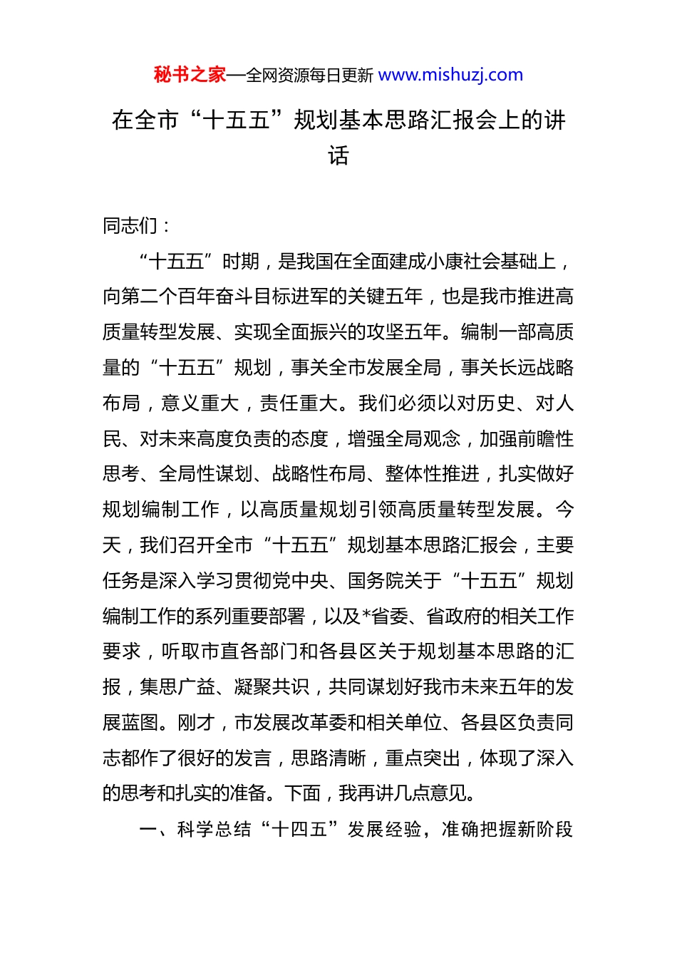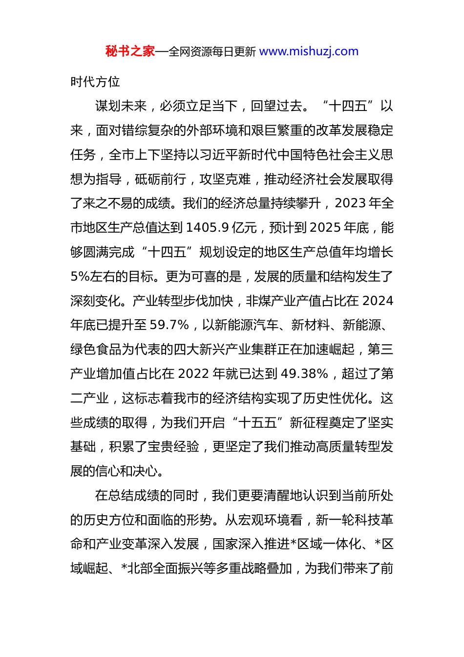 秘书之家—全网资源每日更新 www.mishuzj.com在全市“十五五”规划基本思路汇报会上的讲话 同志们:“十五五”时期,是我国在全面建成小康社会基础上,向第二个百年奋斗目标进军的关键五年,也是我市推进高质量转型发展、实现全面振兴的攻坚五年。编制一部高质量的“十五五”规划,事关全市发展全局,事关长远战略布局,意义重大,责任重大。我们必须以对历史、对人民、对未来高度负责的态度,增强全局观念,加强前瞻性思考、全局性谋划、战略性布局、整体性推进,扎实做好规划编制工作,以高质量规划引领高质量转型发展。今天,我们召开全市“十五五”规划基本思路汇报会,主要任务是深入学习贯彻党中央、国务院关于“十五五”规划编制工作的系列重要部署,以及*省委、省政府的相关工作要求,听取市直各部门和各县区关于规划基本思路的汇报,集思广益、凝聚共识,共同谋划好我市未来五年的发展蓝图。刚才,市发展改革委和相关单位、各县区负责同志都作了很好的发言,思路清晰,重点突出,体现了深入的思考和扎实的准备。下面,我再讲几点意见。一、科学总结“十四五”发展经验,准确把握新阶段秘书之家—全网资源每日更新 www.mishuzj.com时代方位谋划未来,必须立足当下,回望过去。“十四五”以来,面对错综复杂的外部环境和艰巨繁重的改革发展稳定任务,全市上下坚持以习近平新时代中国特色社会主义思想为指导,砥砺前行,攻坚克难,推动经济社会发展取得了来之不易的成绩。我们的经济总量持续攀升,2023 年全市地区生产总值达到 1405.9 亿元,预计到 2025 年底,能够圆满完成“十四五”规划设定的地区生产总值年均增长5%左右的目标。更为可喜的是,发展的质量和结构发生了深刻变化。产业转型步伐加快,非煤产业产值占比在 2024年底已提升至 59.7%,以新能源汽车、新材料、新能源、绿色食品为代表的四大新兴产业集群正在加速崛起,第三产业增加值占比在 2022 年就已达到 49.38%,超过了第二产业,这标志着我市的经济结构实现了历史性优化。这些成绩的取得,为我们开启“十五五”新征程奠定了坚实基础,积累了宝贵经验,更坚定了我们推动高质量转型发展的信心和决心。在总结成绩的同时,我们更要清醒地认识到当前所处的历史方位和面临的形势。从宏观环境看,新一轮科技革命和产业变革深入发展,国家深入推进*区域一体化、*区域崛起、*北部全面振兴等多重战略叠加,为我们带来了前秘书之家—全网资源每日更新 www.mishuzj.com所未有的发展机遇。我们必须牢牢抓住这些机遇,乘势而上,主动作为。但同时,也要看到,当前国内外环境的复杂性、严峻性、不确定性上升,区域竞争日趋激烈,传统产业转型升级的阵痛仍在持续,科技创新能力不足、高端人才短缺等短板弱项依然突出。这些都是我们编制“十五五”规划时必须直面和破解的课题。因此,我们必须坚持用全面、辩证、长远的眼光分析当前形势,既要看到“形”的波动,更要把握“势”的主流;既要正视“危”的挑战,更要善于抓住“机”的有利条件,切实做到在战略上保持主动,在战术上精准有效。二、坚持高点站位系统谋划,科学确立“十五五”奋斗目标编制“十五五”规划,首要的是确立科学的指导思想和发展目标。这需要我们胸怀“国之大者”,紧密对接国家和*省的战略部署,同时立足*市的资源禀赋、产业基础和发展阶段,做到既“顶天”又“立地”。要牢牢锚定“一城一基地”的城市发展定位。“一城”,就是要建设成为经济繁荣、社会文明、生态宜居、人民幸福的现代化高品质城市。“一基地”,就是要打造成为在*区域具有重要影响力的新型综合能源基地、新材料产业基地和绿色农产品深加工基地。这个定位,是我们基秘书之家—全网资源每日更新 www.mishuzj.com于自身比较优势和未来发展方向作出的战略抉择,是统领“十五五”乃至更长时期发展的总纲。规划编制工作必须紧紧围绕这个总纲来展开,将这一定位具体化、指标化、项目化。在具体目标设定上,要坚持科学严谨、实事求是,兼顾需要与可能,做到积极稳妥、尽力而为、量力而行。初步考虑,到 2030 年,我们的发展要实现以下目标:第一,综合实力实现新跨越。在保证质...