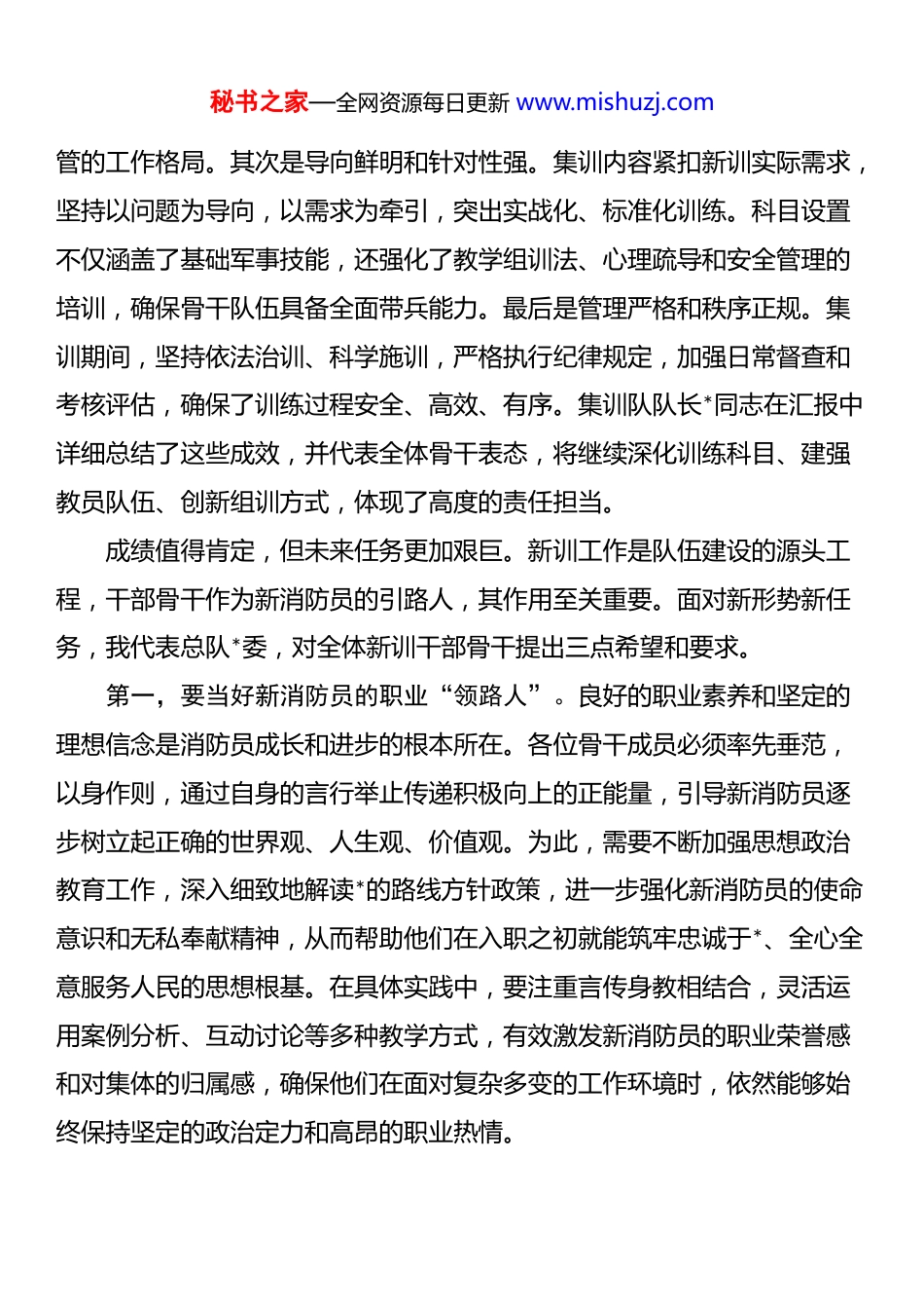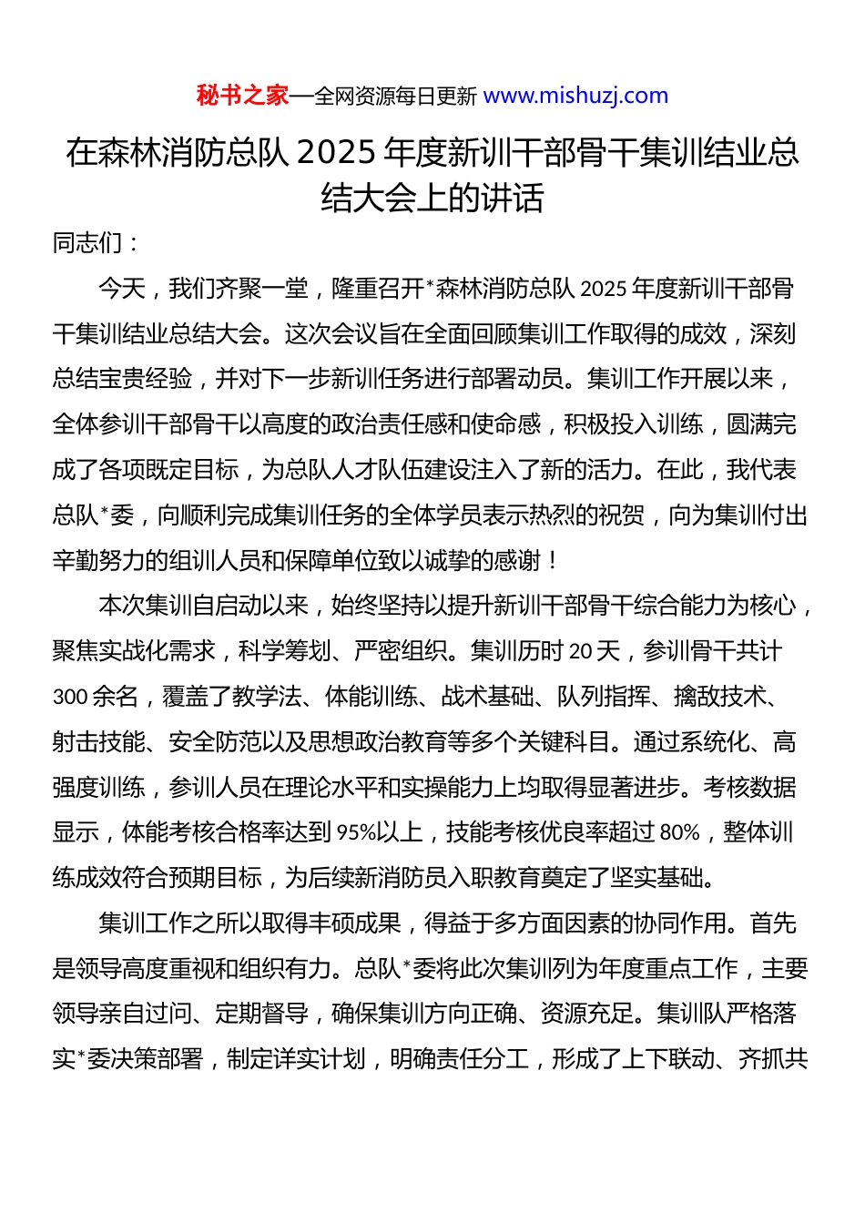 秘书之家—全网资源每日更新 www.mishuzj.com在森林消防总队 2025 年度新训干部骨干集训结业总结大会上的讲话同志们:今天,我们齐聚一堂,隆重召开*森林消防总队 2025 年度新训干部骨干集训结业总结大会。这次会议旨在全面回顾集训工作取得的成效,深刻总结宝贵经验,并对下一步新训任务进行部署动员。集训工作开展以来,全体参训干部骨干以高度的政治责任感和使命感,积极投入训练,圆满完成了各项既定目标,为总队人才队伍建设注入了新的活力。在此,我代表总队*委,向顺利完成集训任务的全体学员表示热烈的祝贺,向为集训付出辛勤努力的组训人员和保障单位致以诚挚的感谢!本次集训自启动以来,始终坚持以提升新训干部骨干综合能力为核心,聚焦实战化需求,科学筹划、严密组织。集训历时 20 天,参训骨干共计300 余名,覆盖了教学法、体能训练、战术基础、队列指挥、擒敌技术、射击技能、安全防范以及思想政治教育等多个关键科目。通过系统化、高强度训练,参训人员在理论水平和实操能力上均取得显著进步。考核数据显示,体能考核合格率达到 95%以上,技能考核优良率超过 80%,整体训练成效符合预期目标,为后续新消防员入职教育奠定了坚实基础。集训工作之所以取得丰硕成果,得益于多方面因素的协同作用。首先是领导高度重视和组织有力。总队*委将此次集训列为年度重点工作,主要领导亲自过问、定期督导,确保集训方向正确、资源充足。集训队严格落实*委决策部署,制定详实计划,明确责任分工,形成了上下联动、齐抓共秘书之家—全网资源每日更新 www.mishuzj.com管的工作格局。其次是导向鲜明和针对性强。集训内容紧扣新训实际需求,坚持以问题为导向,以需求为牵引,突出实战化、标准化训练。科目设置不仅涵盖了基础军事技能,还强化了教学组训法、心理疏导和安全管理的培训,确保骨干队伍具备全面带兵能力。最后是管理严格和秩序正规。集训期间,坚持依法治训、科学施训,严格执行纪律规定,加强日常督查和考核评估,确保了训练过程安全、高效、有序。集训队队长*同志在汇报中详细总结了这些成效,并代表全体骨干表态,将继续深化训练科目、建强教员队伍、创新组训方式,体现了高度的责任担当。成绩值得肯定,但未来任务更加艰巨。新训工作是队伍建设的源头工程,干部骨干作为新消防员的引路人,其作用至关重要。面对新形势新任务,我代表总队*委,对全体新训干部骨干提出三点希望和要求。第一,要当好新消防员的职业“领路人”。良好的职业素养和坚定的理想信念是消防员成长和进步的根本所在。各位骨干成员必须率先垂范,以身作则,通过自身的言行举止传递积极向上的正能量,引导新消防员逐步树立起正确的世界观、人生观、价值观。为此,需要不断加强思想政治教育工作,深入细致地解读*的路线方针政策,进一步强化新消防员的使命意识和无私奉献精神,从而帮助他们在入职之初就能筑牢忠诚于*、全心全意服务人民的思想根基。在具体实践中,要注重言传身教相结合,灵活运用案例分析、互动讨论等多种教学方式,有效激发新消防员的职业荣誉感和对集体的归属感,确保他们在面对复杂多变的工作环境时,依然能够始终保持坚定的政治定力和高昂的职业热情。秘书之家—全网资源每日更新 www.mishuzj.com第二,要做好新消防员的技能“传授人”。过硬的专业技能是消防员履行职责使命的根本保障。骨干队伍必须精通各项业务技能,并善于将所学知识转化为高效的教学能力。要深入钻研训练大纲,熟练掌握科学合理的组训方法,针对新消防员在个体素质、学习能力等方面的差异,因材施教,进行分类指导。在训练过程中,要突出实战化导向,通过模拟真实场景,全面提升新消防员的应急反应能力和协同作战水平。同时,要注重创新训练手段,积极利用现代化教育技术手段,如模拟训练系统和多媒体教学教程,不断增强训练的趣味性和实效性。相关考核数据表明,技能传授环节的质量直接关系到整体训练效果,因此,骨干们必须持续学习新知识、不断精进自身教学水平,确保每一名新消防员都能达到岗位所需的技能要求。第三,要成为新消防员的生活“贴心人”。队伍的全面建设离不开深厚的人文关怀...