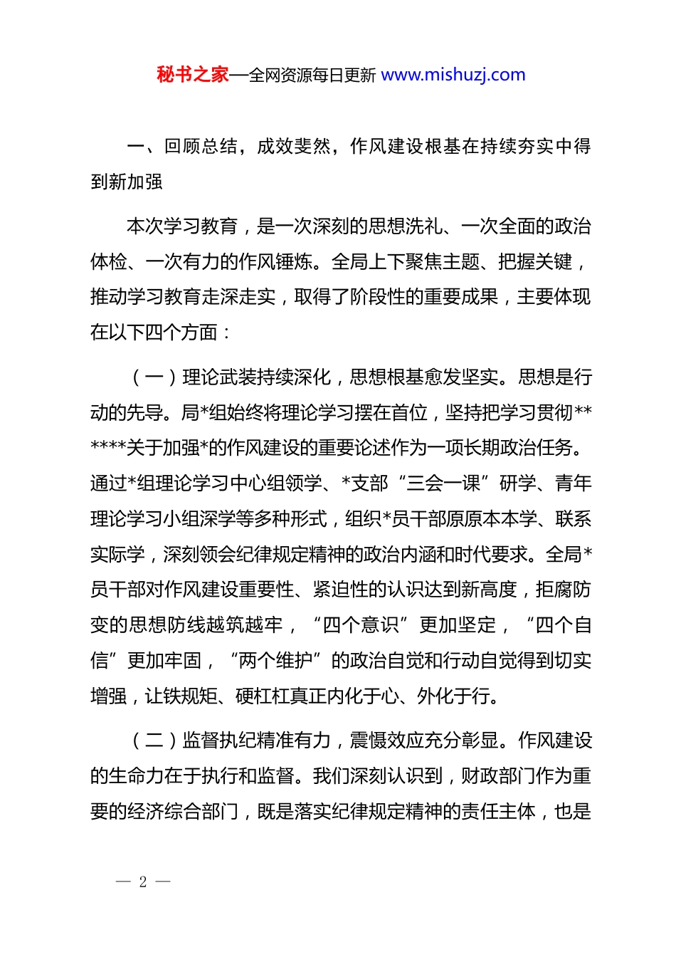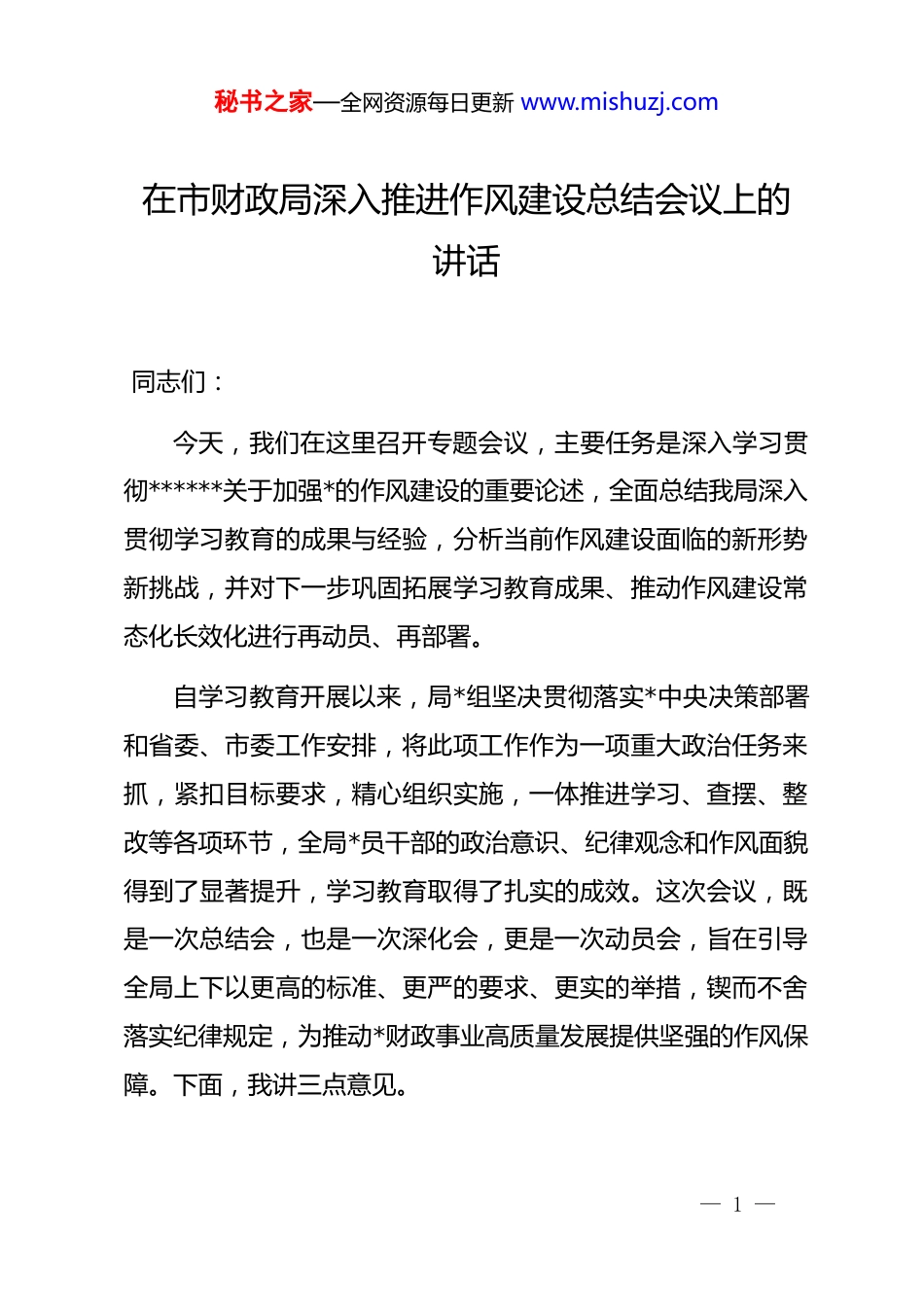 秘书之家—全网资源每日更新 www.mishuzj.com在市财政局深入推进作风建设总结会议上的讲话 同志们:今天,我们在这里召开专题会议,主要任务是深入学习贯彻******关于加强*的作风建设的重要论述,全面总结我局深入贯彻学习教育的成果与经验,分析当前作风建设面临的新形势新挑战,并对下一步巩固拓展学习教育成果、推动作风建设常态化长效化进行再动员、再部署。自学习教育开展以来,局*组坚决贯彻落实*中央决策部署和省委、市委工作安排,将此项工作作为一项重大政治任务来抓,紧扣目标要求,精心组织实施,一体推进学习、查摆、整改等各项环节,全局*员干部的政治意识、纪律观念和作风面貌得到了显著提升,学习教育取得了扎实的成效。这次会议,既是一次总结会,也是一次深化会,更是一次动员会,旨在引导全局上下以更高的标准、更严的要求、更实的举措,锲而不舍落实纪律规定,为推动*财政事业高质量发展提供坚强的作风保障。下面,我讲三点意见。— 1 —秘书之家—全网资源每日更新 www.mishuzj.com一、回顾总结,成效斐然,作风建设根基在持续夯实中得到新加强本次学习教育,是一次深刻的思想洗礼、一次全面的政治体检、一次有力的作风锤炼。全局上下聚焦主题、把握关键,推动学习教育走深走实,取得了阶段性的重要成果,主要体现在以下四个方面:(一)理论武装持续深化,思想根基愈发坚实。思想是行动的先导。局*组始终将理论学习摆在首位,坚持把学习贯彻******关于加强*的作风建设的重要论述作为一项长期政治任务。通过*组理论学习中心组领学、*支部“三会一课”研学、青年理论学习小组深学等多种形式,组织*员干部原原本本学、联系实际学,深刻领会纪律规定精神的政治内涵和时代要求。全局*员干部对作风建设重要性、紧迫性的认识达到新高度,拒腐防变的思想防线越筑越牢,“四个意识”更加坚定,“四个自信”更加牢固,“两个维护”的政治自觉和行动自觉得到切实增强,让铁规矩、硬杠杠真正内化于心、外化于行。(二)监督执纪精准有力,震慑效应充分彰显。作风建设的生命力在于执行和监督。我们深刻认识到,财政部门作为重要的经济综合部门,既是落实纪律规定精神的责任主体,也是— 2 —秘书之家—全网资源每日更新 www.mishuzj.com监督检查的重要力量。过去一年多来,我局持续强化财会监督的“利剑”作用,构建“全员参与、全面覆盖、全程监督”的大监督体系。在 2024 年的财会监督工作中,我们聚焦重点领域,严肃查处财经纪律执行中的突出问题,累计向纪检监察等部门移送问题线索超过 450 条,有力整治乡镇财政管理问题 1167 个,通过严格的预算审核与监督检查,直接节约财政资金达 2.52 亿元。同时,我局带头践行“过紧日子”思想,严格控制“三公”经费支出,2025 年市本级“三公”经费预算总额控制在6733 万元,较往年持续压减,以财政的“紧日子”换取人民群众的“好日子”,向全社会释放了从严从紧的强烈信号。(三)制度藩篱不断扎牢,长效机制日臻完善。制度建设是管根本、管长远的治本之策。学习教育期间,我们坚持问题导向,把“当下改”与“长久立”结合起来,针对作风建设中暴露出的薄弱环节和制度漏洞,进行全面梳理和系统重塑。例如,为根治“舌尖上的浪费”,我局创新性地依托“*政通”平台,在全市范围内率先推行“电子公函”管理制度,实现了公务出差审批和公务接待的全过程电子化、可溯源管理,从源头上遏制了违规吃喝问题。同时,我们还结合财政工作实际,修订完善了内部控制、预算管理、政府采购、绩效考核等一系列— 3 —秘书之家—全网资源每日更新 www.mishuzj.com规章制度,形成了内容科学、程序严密、配套完备、有效管用的制度体系,切实把权力关进制度的笼子,强化了制度的刚性约束力。(四)科技赋能监督升级,治理效能显著提升。面对“四风”问题隐形变异、花样翻新的挑战,必须创新监督手段,提升治理能力。我局主动拥抱大数据、信息化浪潮,将科技作为提升监督效能的“倍增器”。最具代表性的就是我市在全省率先探索并全面推行的“码上监督”平台。该平台自 2021 年 6 月上线以来,不断优化升级,将民生资金...