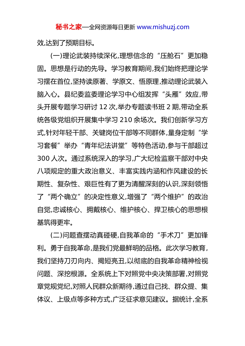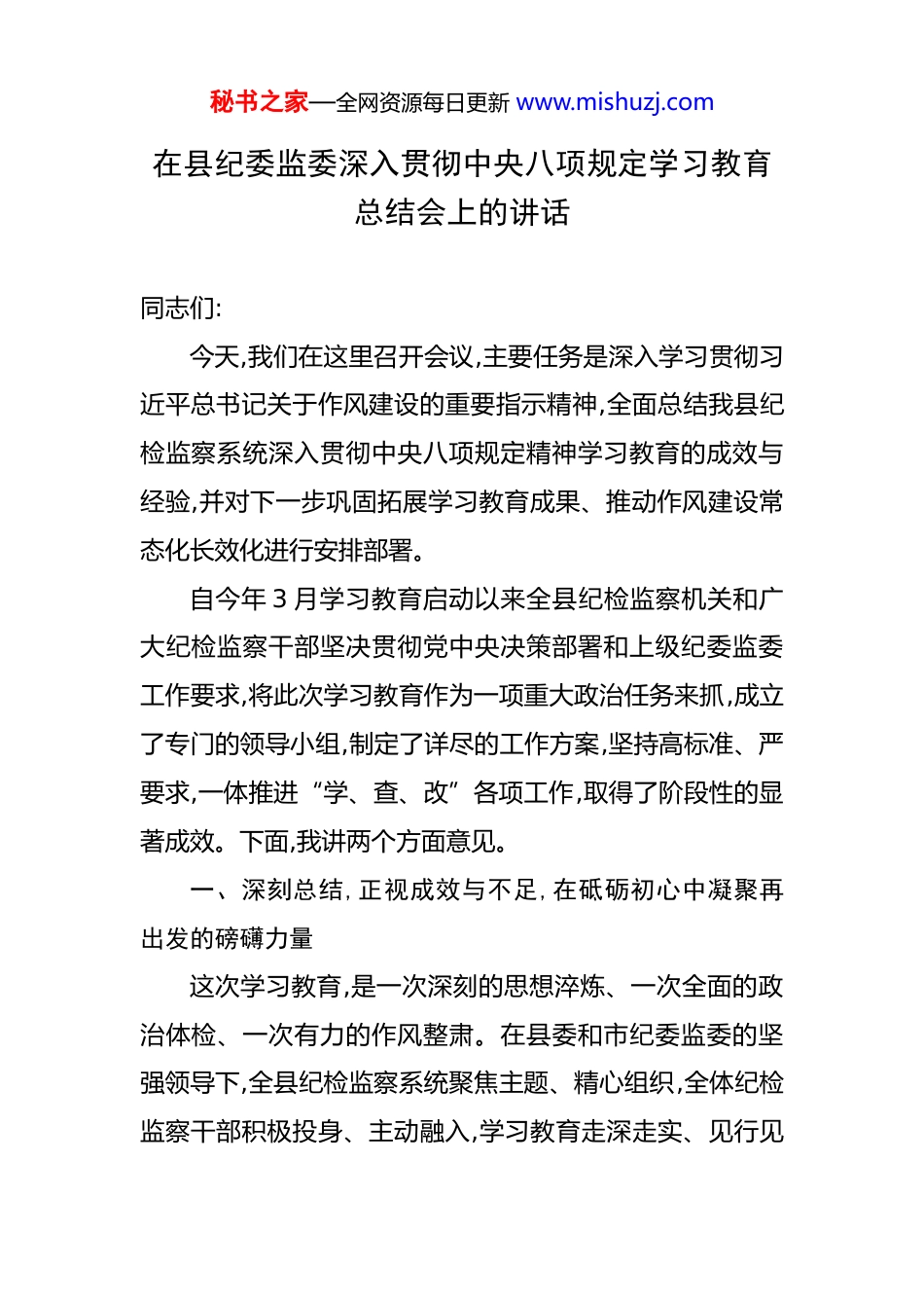 秘书之家—全网资源每日更新 www.mishuzj.com在县纪委监委深入贯彻中央八项规定学习教育总结会上的讲话 同志们:今天,我们在这里召开会议,主要任务是深入学习贯彻习近平总书记关于作风建设的重要指示精神,全面总结我县纪检监察系统深入贯彻中央八项规定精神学习教育的成效与经验,并对下一步巩固拓展学习教育成果、推动作风建设常态化长效化进行安排部署。自今年 3 月学习教育启动以来全县纪检监察机关和广大纪检监察干部坚决贯彻党中央决策部署和上级纪委监委工作要求,将此次学习教育作为一项重大政治任务来抓,成立了专门的领导小组,制定了详尽的工作方案,坚持高标准、严要求,一体推进“学、查、改”各项工作,取得了阶段性的显著成效。下面,我讲两个方面意见。一、深刻总结,正视成效与不足,在砥砺初心中凝聚再出发的磅礴力量这次学习教育,是一次深刻的思想淬炼、一次全面的政治体检、一次有力的作风整肃。在县委和市纪委监委的坚强领导下,全县纪检监察系统聚焦主题、精心组织,全体纪检监察干部积极投身、主动融入,学习教育走深走实、见行见秘书之家—全网资源每日更新 www.mishuzj.com效,达到了预期目标。(一)理论武装持续深化,理想信念的“压舱石”更加稳固。思想是行动的先导。学习教育期间,我们始终把理论学习摆在首位,坚持读原著、学原文、悟原理,推动理论武装入脑入心。县纪委监委理论学习中心组发挥“头雁”效应,带头开展专题学习研讨 12 次,举办专题读书班 2 期,带动全系统各级党组织开展集中学习 210 余场次。我们创新学习方式,针对年轻干部、关键岗位干部等不同群体,量身定制“学习套餐”举办“青年纪法讲堂”等特色活动,参与干部超过300 人次。通过系统深入的学习,广大纪检监察干部对中央八项规定的重大政治意义、丰富实践内涵和作风建设的长期性、复杂性、艰巨性有了更为清醒深刻的认识,深刻领悟了“两个确立”的决定性意义,增强了“两个维护”的政治自觉,忠诚核心、拥戴核心、维护核心、捍卫核心的思想根基筑得更牢。(二)问题查摆动真碰硬,自我革命的“手术刀”更加锋利。勇于自我革命,是我们党最鲜明的品格。此次学习教育,我们坚持刀刃向内、揭短亮丑,以彻底的自我革命精神检视问题、深挖根源。全系统上下对照党中央决策部署,对照党章党规党纪,对照人民群众新期待,通过自己找、群众提、集体议、上级点等多种方式,广泛征求意见建议。据统计,全系秘书之家—全网资源每日更新 www.mishuzj.com统共梳理查摆出在思想认识、担当作为、纪律作风等方面的突出问题 3 大类 38 项,制定整改措施 120 余条。每一名纪检监察干部都建立了个人问题清单和整改台账,明确了整改时限和责任。这种“过筛子”式的全面检视,让许多长期存在但未被足够重视的问题浮出水面,让干部职工思想深处受到了极大触动,达到了“红脸出汗、排毒治病”的效果。(三)整改整治务求实效,激浊扬清的“净化器”更加高效。查摆问题的目的在于解决问题。我们坚持“改”字当头、立行立改,把问题整改贯穿学习教育全过程,确保件件有着落、事事有回音。针对查摆出的问题,我们实行销号管理,完成一项销号一项,整改完成率达到 95%以上。同时,我们坚持“当下改”与“长久立”相结合,着眼于常态长治,围绕监督检查、审查调查、案件审理等关键环节,修订完善了内部管理制度 15 项,进一步扎紧了制度的笼子。更重要的是,我们将学习教育的成果转化为履职尽责的强大动力,监督执纪执法的质效得到显著提升。今年以来,全县纪检监察机关查处违反中央八项规定精神问题数量同比上升了 8%,给予党纪政务处分人数增加了 11%,释放了越往后执纪越严的强烈信号,作风建设的“金色名片”越擦越亮。(四)成果转化成效彰显,服务大局的“护航舰”更加坚实。学习教育的最终成效,要体现在推动发展、服务大局秘书之家—全网资源每日更新 www.mishuzj.com上。我们紧紧围绕县委“建设 XX 示范区、打造 XX 经济增长极”的中心任务,将作风建设与优化营商环境、护航重大项目、保障民生福祉等工作紧密结合。通过深化作风问题专项整治,严肃查处了一批在项目推进中不作为、慢作为、乱作为的典型案例,有力保障了全县 20 余个重大项目...