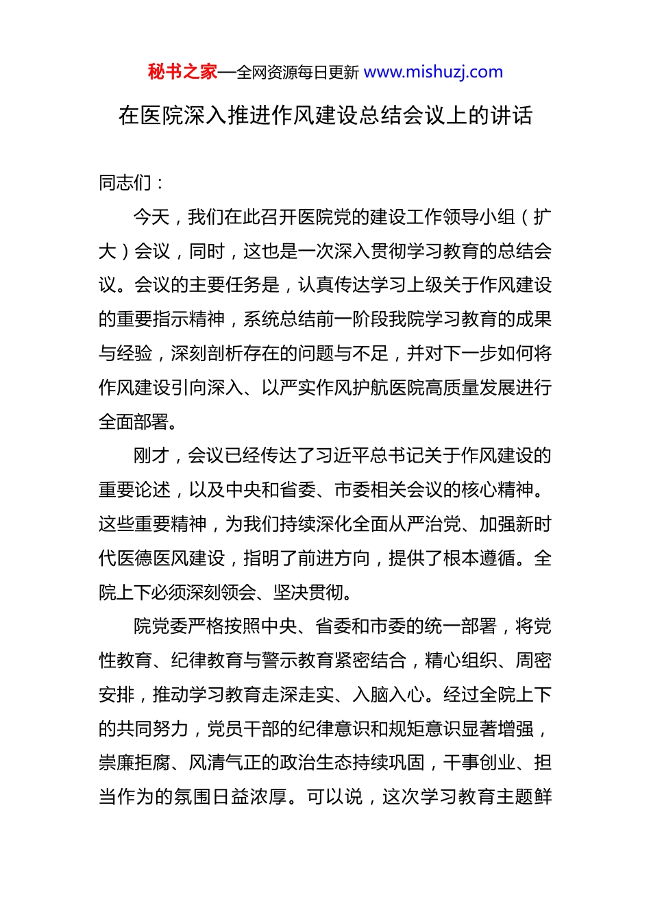 秘书之家—全网资源每日更新 www.mishuzj.com在医院深入推进作风建设总结会议上的讲话 同志们:今天,我们在此召开医院党的建设工作领导小组(扩大)会议,同时,这也是一次深入贯彻学习教育的总结会议。会议的主要任务是,认真传达学习上级关于作风建设的重要指示精神,系统总结前一阶段我院学习教育的成果与经验,深刻剖析存在的问题与不足,并对下一步如何将作风建设引向深入、以严实作风护航医院高质量发展进行全面部署。刚才,会议已经传达了习近平总书记关于作风建设的重要论述,以及中央和省委、市委相关会议的核心精神。这些重要精神,为我们持续深化全面从严治党、加强新时代医德医风建设,指明了前进方向,提供了根本遵循。全院上下必须深刻领会、坚决贯彻。院党委严格按照中央、省委和市委的统一部署,将党性教育、纪律教育与警示教育紧密结合,精心组织、周密安排,推动学习教育走深走实、入脑入心。经过全院上下的共同努力,党员干部的纪律意识和规矩意识显著增强,崇廉拒腐、风清气正的政治生态持续巩固,干事创业、担当作为的氛围日益浓厚。可以说,这次学习教育主题鲜秘书之家—全网资源每日更新 www.mishuzj.com明、重点突出、成效显著,达到了预期的目标。下面,我讲三点意见。一、回顾成效,固本培元,作风建设取得阶段性坚实成果作风建设永远在路上。本次学习教育,不仅是一次思想的再洗礼、纪律的再加固,更是一次对我院治理能力和发展活力的全面检阅。回顾这段时期的工作,主要体现在以下三个方面:(一)思想根基更加牢固,政治忠诚得到淬炼。理论上的清醒是政治上坚定的基础。院党委始终将理论武装置于首要位置,坚持不懈用习近平新时代中国特色社会主义思想凝心铸魂。在学习教育中,我们组织了党委理论学习中心组专题学习 12 次,举办了覆盖全院中层干部和关键岗位人员的专题读书班 3 期,超过 1500 名党员、干部通过“三会一课”、主题党日等形式参与了系统学习,实现了对“关键少数”和绝大多数的教育全覆盖。通过原原本本学、融会贯通悟、联系实际思,全院党员干部进一步深刻领悟“两个确立”的决定性意义,增强“四个意识”、坚定“四个自信”、做到“两个维护”。大家普遍反映,通过这次系统学习,对纪律规定精神的时代内涵和实践要求有了更精准的把握,对“我是谁、为了谁、依靠谁”这一秘书之家—全网资源每日更新 www.mishuzj.com根本问题有了更深刻的体悟,将铁的纪律转化为日常习惯和自觉遵循的政治自觉、思想自觉和行动自觉显著增强。(二)制度笼子更加扎密,长效机制初步构建。无规矩不成方圆。作风建设要从根本上取得成功,必须依靠科学、严密、管用的制度体系。院党委坚持标本兼治,在抓好集中教育的同时,着力于“当下改”和“长久立”的有机结合。根据上级精神和我院实际,我们全面梳理、修订和完善了内部管理制度 40 余项,特别是在公务接待、会议培训、招标采购、财务审计等重点领域,进一步明确了标准、简化了流程、堵塞了漏洞。值得一提的是,我们结合市里的先进经验,探索建立了全面从严治党主体责任社会评议制度,将部分考核指标向社会公开,主动接受患者和社会的监督。同时,我们制定并印发了《XX 医院 2025 年度全面从严治党工作要点》将责任层层分解,明确了各党支部、各科室的责任清单和任务目标,形成了党委统一领导、纪委监督执纪、部门各负其责、全员共同参与的“大监督”格局。这套“组合拳”的打出,有力推动了管党治党从“宽松软”走向“严紧硬”,为作风建设常态化长效化奠定了坚实的制度基础。(三)医德医风更加清朗,服务效能显著提升。作风建设的最终成效,必须体现在医疗服务的质量和人民群众秘书之家—全网资源每日更新 www.mishuzj.com的满意度上。我们始终坚持将作风建设与医院中心工作深度融合,以党建引领业务,以作风转变促进服务提升,实现了党建与业务的同频共振。一是服务理念深入人心。全院上下牢固树立“病人至上、质量第一”的宗旨,将“以病人为中心”从一句口号,真正落实为每一位医护人员的自觉行动。我们持续深化“挂牌亮责”“三好一满意”等活动,通过设立党员先锋岗、服务示...