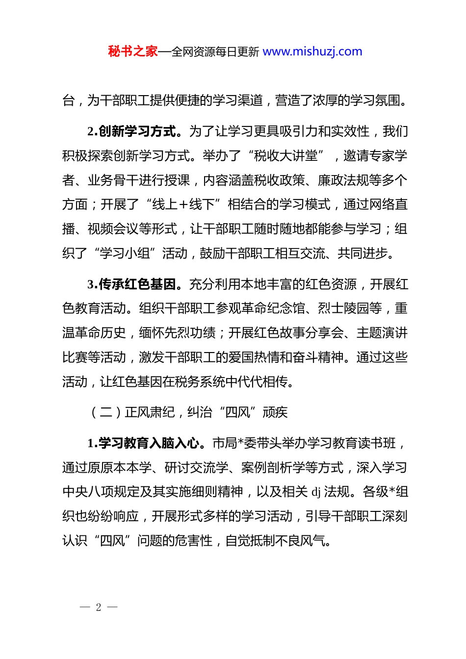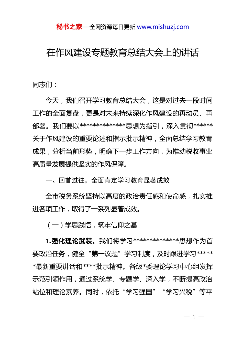 秘书之家—全网资源每日更新 www.mishuzj.com在作风建设专题教育总结大会上的讲话同志们:今天,我们召开学习教育总结大会,这是对过去一段时间工作的全面复盘,更是对未来持续深化作风建设的再动员、再部署。我们要以**************思想为指引,深入贯彻******关于作风建设的重要论述和指示批示精神,全面总结学习教育成果,分析当前形势,明确下一步工作方向,为推动税收事业高质量发展提供坚实的作风保障。一、回首过往,全面肯定学习教育显著成效全市税务系统坚持以高度的政治责任感和使命感,扎实推进各项工作,取得了一系列显著成效。(一)学思践悟,筑牢信仰之基1.强化理论武装。我们将学习**************思想作为首要政治任务,健全“第一议题”学习制度,及时跟进学习******最新重要讲话和****批示精神。各级*委理论学习中心组发挥示范引领作用,通过系统学、专题学、深入学,不断提高政治站位和理论素养。同时,依托“学习强国”“学习兴税”等平— 1 —秘书之家—全网资源每日更新 www.mishuzj.com台,为干部职工提供便捷的学习渠道,营造了浓厚的学习氛围。2.创新学习方式。为了让学习更具吸引力和实效性,我们积极探索创新学习方式。举办了“税收大讲堂”,邀请专家学者、业务骨干进行授课,内容涵盖税收政策、廉政法规等多个方面;开展了“线上+线下”相结合的学习模式,通过网络直播、视频会议等形式,让干部职工随时随地都能参与学习;组织了“学习小组”活动,鼓励干部职工相互交流、共同进步。3.传承红色基因。充分利用本地丰富的红色资源,开展红色教育活动。组织干部职工参观革命纪念馆、烈士陵园等,重温革命历史,缅怀先烈功绩;开展红色故事分享会、主题演讲比赛等活动,激发干部职工的爱国热情和奋斗精神。通过这些活动,让红色基因在税务系统中代代相传。(二)正风肃纪,纠治“四风”顽疾1.学习教育入脑入心。市局*委带头举办学习教育读书班,通过原原本本学、研讨交流学、案例剖析学等方式,深入学习中央八项规定及其实施细则精神,以及相关 dj 法规。各级*组织也纷纷响应,开展形式多样的学习活动,引导干部职工深刻认识“四风”问题的危害性,自觉抵制不良风气。— 2 —秘书之家—全网资源每日更新 www.mishuzj.com2.问题查摆精准深入。坚持问题导向,对照中央八项规定精神和“四风”问题清单,全面开展自查自纠。通过问卷调查、谈心谈话、实地走访等方式,广泛征求纳税人缴费人、基层税务干部的意见建议,共收集问题 x 个。对查摆出的问题,建立台账,明确整改责任人、整改措施和整改期限,确保问题整改到位。3.整改落实成效显著。针对查摆出的问题,我们制定了详细的整改方案,采取有力措施加以整改。在整治形式主义方面,精简文件会议,规范督查检查考核,让基层干部从繁琐的事务中解脱出来;在整治官僚主义方面,加强调查研究,提高决策的科学性和民主性,切实为纳税人缴费人办实事、解难题;在整治享乐主义和奢靡之风方面,严格执行公务接待、公车使用等制度,坚决杜绝铺张浪费现象。通过一系列整改措施的落实,干部职工的工作作风得到了明显转变。(三)强基固本,打造过硬队伍1.加强*组织建设。以提升组织力为重点,突出政治功能,加强基层*组织建设。选优配强*支部书记,加强*支部标准化、规范化建设,严格落实“三会一课”、主题*日等制度,充分发挥*支部的战斗堡垒作用和*员的先锋模范作用。— 3 —秘书之家—全网资源每日更新 www.mishuzj.com2.提升干部能力素质。实施“人才兴税”战略,加大干部教育培训力度。开展了各类业务培训、岗位练兵活动,提高干部职工的业务水平和综合素质;建立了人才库,选拔培养了一批业务骨干和领军人才,为税收事业发展提供了人才支撑。3.激励干部担当作为。建立健全干部考核评价机制,树立正确的用人导向,让想干事、能干事、干成事的干部有机会、有舞台。开展了“担当作为好干部”评选活动,对表现突出的干部进行表彰奖励,激发干部职工的工作积极性和主动性。(四)服务发展,展现税务担当1.助力经济发展。积极落实各项税收优惠政策,为企业减负增效。通过开展政策宣传辅导、优化纳税服...