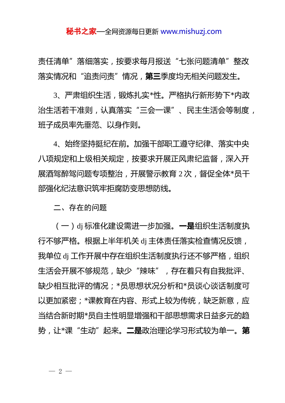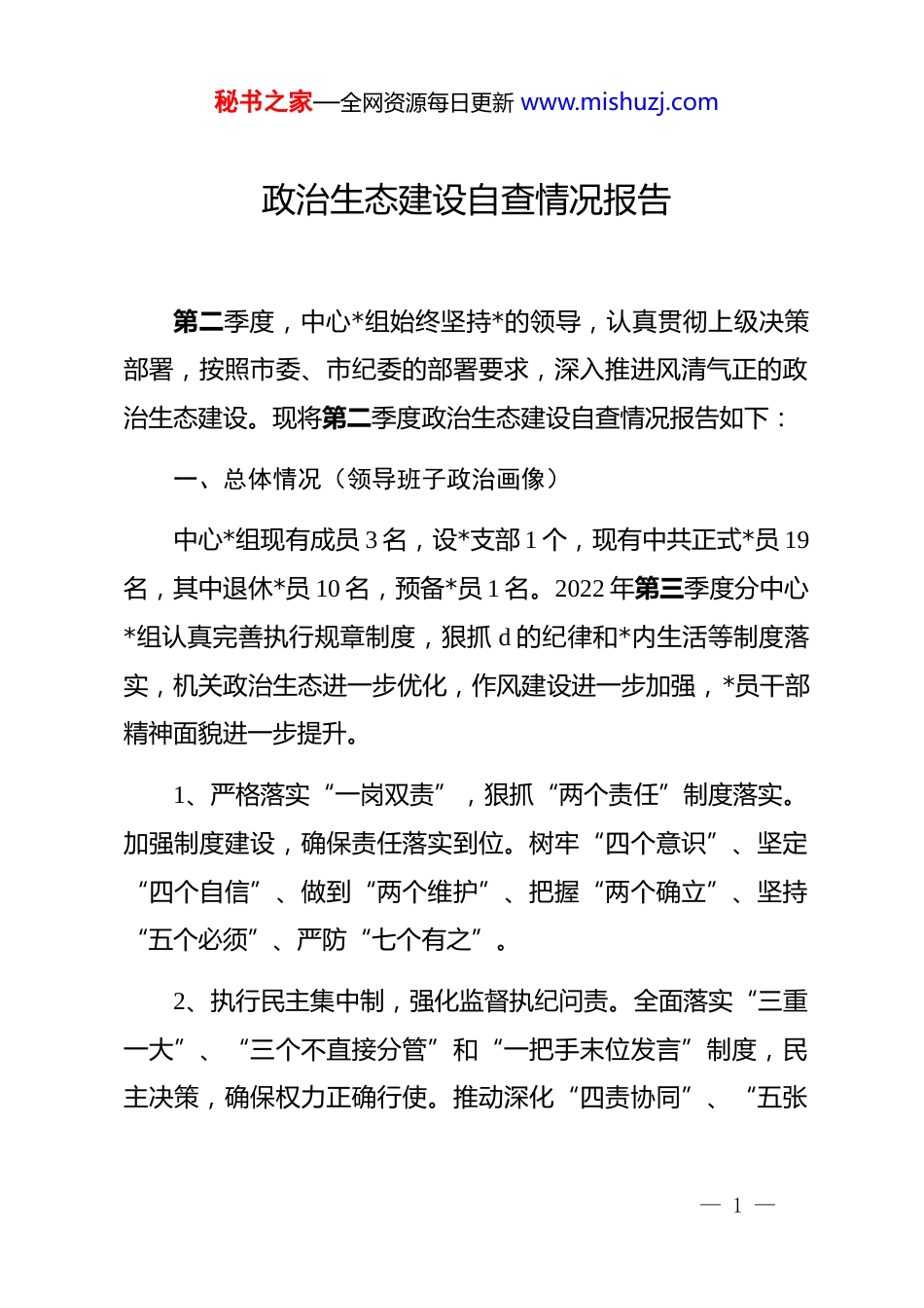 秘书之家—全网资源每日更新 www.mishuzj.com政治生态建设自查情况报告第二季度,中心*组始终坚持*的领导,认真贯彻上级决策部署,按照市委、市纪委的部署要求,深入推进风清气正的政治生态建设。现将第二季度政治生态建设自查情况报告如下:一、总体情况(领导班子政治画像)中心*组现有成员 3 名,设*支部 1 个,现有中共正式*员 19名,其中退休*员 10 名,预备*员 1 名。2022 年第三季度分中心*组认真完善执行规章制度,狠抓 d 的纪律和*内生活等制度落实,机关政治生态进一步优化,作风建设进一步加强,*员干部精神面貌进一步提升。1、严格落实“一岗双责”,狠抓“两个责任”制度落实。加强制度建设,确保责任落实到位。树牢“四个意识”、坚定“四个自信”、做到“两个维护”、把握“两个确立”、坚持“五个必须”、严防“七个有之”。2、执行民主集中制,强化监督执纪问责。全面落实“三重一大”、“三个不直接分管”和“一把手末位发言”制度,民主决策,确保权力正确行使。推动深化“四责协同”、“五张— 1 —秘书之家—全网资源每日更新 www.mishuzj.com责任清单”落细落实,按要求每月报送“七张问题清单”整改落实情况和“追责问责”情况,第三季度均无相关问题发生。3、严肃组织生活,锻炼扎实*性。严格执行新形势下*内政治生活若干准则,认真落实“三会一课”、民主生活会等制度,班子成员率先垂范、以身作则。4、始终坚持挺纪在前。加强干部职工遵守纪律、落实中央八项规定和上级相关规定,按要求开展正风肃纪监督,深入开展酒驾醉驾问题专项整治,开展警示教育 2 次,督促全体*员干部强化纪法意识筑牢拒腐防变思想防线。二、存在的问题(一)dj 标准化建设需进一步加强。一是组织生活制度执行不够严格。根据上半年机关 dj 主体责任落实检查情况反馈,我单位 dj 工作开展中存在组织生活制度执行还不够严格,组织生活会开展不够规范,缺少“辣味”,存在着只有自我批评、缺少相互批评的情况;*员思想状况分析和*员谈心谈话制度可以更加紧密;*课教育在内容、形式上较为传统,缺乏新意,应当结合新时期*员自主性明显增强和干部思想需求日益多元的趋势,让*课“生动”起来。二是政治理论学习形式较为单一。第— 2 —秘书之家—全网资源每日更新 www.mishuzj.com三季度疫情形势时有起伏,因此仍以集中学习为主,未开展形式多样的学习活动,总体以自学为主,集体交流讨论积极性不高,一般性传达学习较频繁,研讨式深入学习欠缺,没有组织实践性学习,缺乏以理论学习和实践教学相结合的形式,影响了理论学习效果的体现。三是 dj 品牌创建特色还不够鲜明。对“一单位一品牌一队伍”创建工作推动还有待加强,dj 品牌可以随着近期阶段性重点工作的开展进一步提炼升华。业务工作与 dj 宣传工作互融共促的作用发挥不明显,缺少亮点的提炼总结,高质量的信息宣传报道较少,信息宣传基本以综合 dj 条线为主,欠缺业务条线的文字总结。四是教育管理欠紧密。由于窗口和机关两地办公,缺乏全面细致的监督管理,尤其是临聘人员管理教育有疏漏,临聘人员对群内下发文件查阅学习不及时,目前已将对学习的成效检验纳入其日常考核中,激发全体干部职工的工作主动性和学习积极性。(二)工作攻坚需进一步推进。一是基层调研下沉不够。班子成员深入基层调研少,调研群体均集中于缴存职工,数据来源均为办事群众提供,欠缺主动去企业、机关开展调研宣传,从而在发现问题、解决问题做的不够。班子成员对于推进数字化改革、共同富裕建设等现阶段重点工作缺乏突破性研究成果,— 3 —秘书之家—全网资源每日更新 www.mishuzj.com大部分调研仍旧集中在业务归集扩面和信贷发放方面。二是解决问题措施较为被动。在实际走访企业、群众时多以梳理问题及政策回复为主,面对业务制度性的问题,则因分中心是隶属于绍兴业务中心的分支机构,因此分中心只能向绍兴市业务管理中心反映,缺乏政策制定上的主动创新,对于反映问题的响应速度较慢。三是审计整改问题尚未清零。对照审计整改要求,诸暨分中心在业务上涉及“一人多缴”、“退休后继续缴存”、“超额缴存”和...