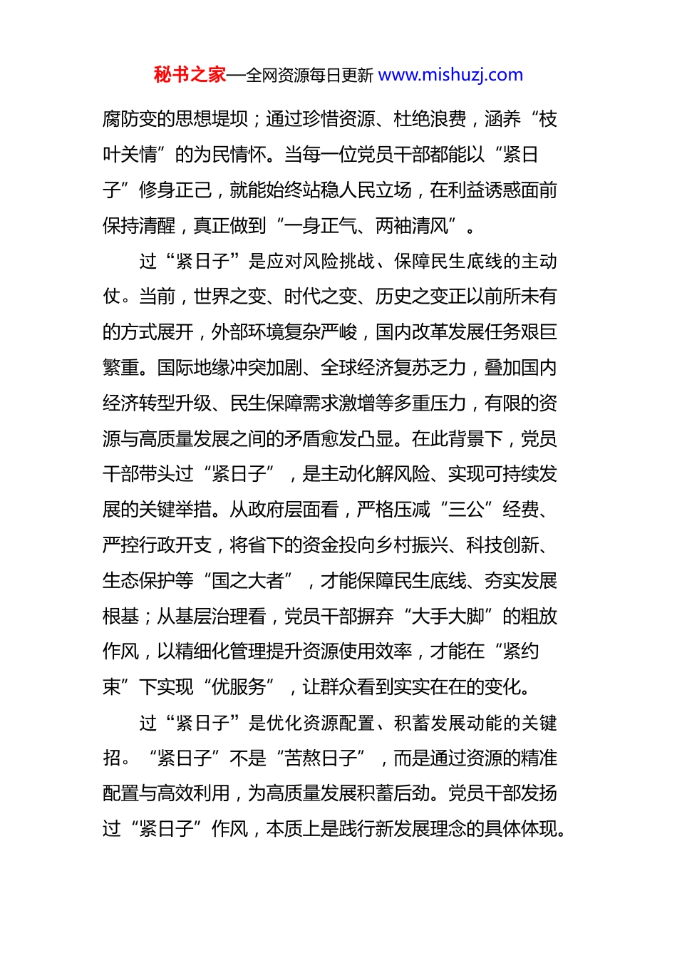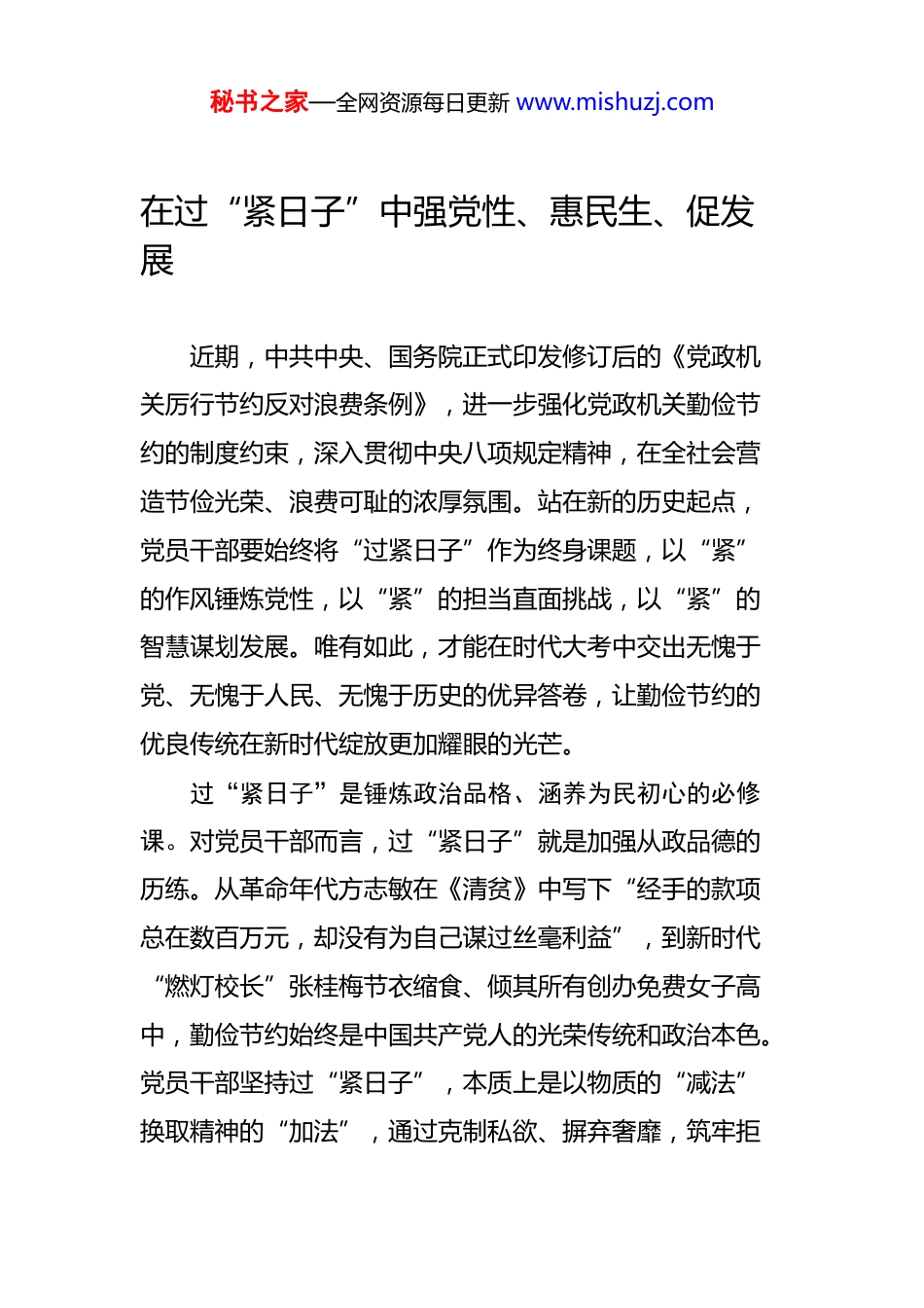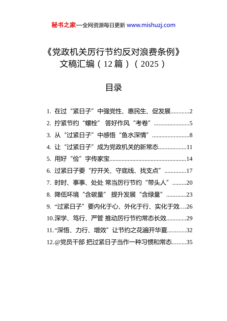 秘书之家—全网资源每日更新 www.mishuzj.com《党政机关厉行节约反对浪费条例》文稿汇编(12 篇)(2025)目录1. 在过“紧日子”中强党性、惠民生、促发展............22. 拧紧节约“螺栓” 答好作风“考卷”.......................53. 从“过紧日子”中感悟“鱼水深情”........................84. 让“过紧日子”成为党政机关的新常态..................115. 用好“俭”字传家宝..................................................146. 过紧日子要“拧开关、守底线、找支点”..............177. 时时、事事、处处 常当厉行节约“带头人”.........208. 降低环境“含碳量” 提升发展“含绿量”.............239. “过紧日子”要内化于心、外化于行、实化于效....2610.深学、笃行、严管 推动厉行节约常态长效.............2911.“深悟、力行、增效”让节约之花遍开华夏............3212.@党员干部 把过紧日子当作一种习惯和常态.........35秘书之家—全网资源每日更新 www.mishuzj.com在过“紧日子”中强党性、惠民生、促发展近期,中共中央、国务院正式印发修订后的《党政机关厉行节约反对浪费条例》,进一步强化党政机关勤俭节约的制度约束,深入贯彻中央八项规定精神,在全社会营造节俭光荣、浪费可耻的浓厚氛围。站在新的历史起点,党员干部要始终将“过紧日子”作为终身课题,以“紧”的作风锤炼党性,以“紧”的担当直面挑战,以“紧”的智慧谋划发展。唯有如此,才能在时代大考中交出无愧于党、无愧于人民、无愧于历史的优异答卷,让勤俭节约的优良传统在新时代绽放更加耀眼的光芒。过“紧日子”是锤炼政治品格、涵养为民初心的必修课。对党员干部而言,过“紧日子”就是加强从政品德的历练。从革命年代方志敏在《清贫》中写下“经手的款项总在数百万元,却没有为自己谋过丝毫利益”,到新时代“燃灯校长”张桂梅节衣缩食、倾其所有创办免费女子高中,勤俭节约始终是中国共产党人的光荣传统和政治本色。党员干部坚持过“紧日子”,本质上是以物质的“减法”换取精神的“加法”,通过克制私欲、摒弃奢靡,筑牢拒秘书之家—全网资源每日更新 www.mishuzj.com腐防变的思想堤坝;通过珍惜资源、杜绝浪费,涵养“枝叶关情”的为民情怀。当每一位党员干部都能以“紧日子”修身正己,就能始终站稳人民立场,在利益诱惑面前保持清醒,真正做到“一身正气、两袖清风”。过“紧日子”是应对风险挑战、保障民生底线的主动仗。当前,世界之变、时代之变、历史之变正以前所未有的方式展开,外部环境复杂严峻,国内改革发展任务艰巨繁重。国际地缘冲突加剧、全球经济复苏乏力,叠加国内经济转型升级、民生保障需求激增等多重压力,有限的资源与高质量发展之间的矛盾愈发凸显。在此背景下,党员干部带头过“紧日子”,是主动化解风险、实现可持续发展的关键举措。从政府层面看,严格压减“三公”经费、严控行政开支,将省下的资金投向乡村振兴、科技创新、生态保护等“国之大者”,才能保障民生底线、夯实发展根基;从基层治理看,党员干部摒弃“大手大脚”的粗放作风,以精细化管理提升资源使用效率,才能在“紧约束”下实现“优服务”,让群众看到实实在在的变化。过“紧日子”是优化资源配置、积蓄发展动能的关键招。“紧日子”不是“苦熬日子”,而是通过资源的精准配置与高效利用,为高质量发展积蓄后劲。党员干部发扬过“紧日子”作风,本质上是践行新发展理念的具体体现。秘书之家—全网资源每日更新 www.mishuzj.com一方面,通过厉行节约倒逼制度创新与管理优化,推动政府部门打破惯性思维,探索数字化办公、跨部门协同等新模式,以“紧”促“改”;另一方面,将节省的资金投入到教育、医疗、养老等民生领域,或是用于攻克“卡脖子”技术、培育战略性新兴产业,以“俭”谋“进”。正如脱贫攻坚战中,党员干部通过精打细算将每一分扶贫资金用在刀刃上,最终实现千万群众脱贫摘帽;疫情防控期间,各地政府精简非必要支出,全力保障防疫物资供应,守护人民生命健康。这些实践证明,“紧日子”不仅能激发创新活力,更能凝聚起攻坚克难的强大合力,为长远发展筑牢...