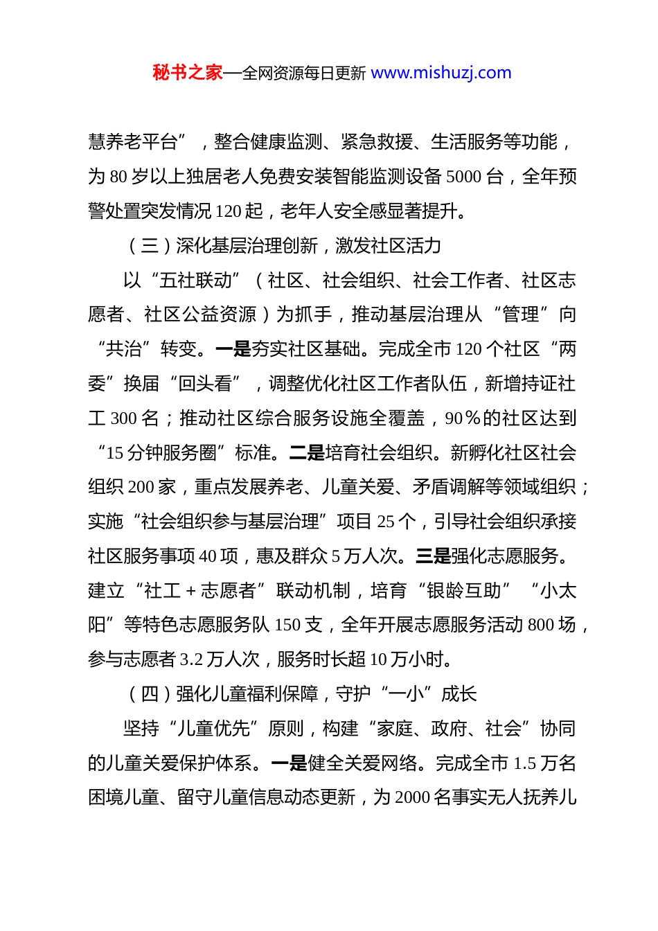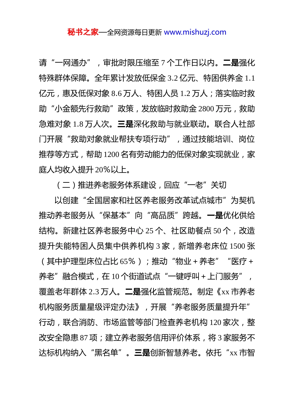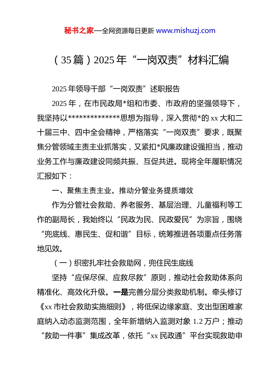 秘书之家—全网资源每日更新 www.mishuzj.com(35 篇)2025 年“一岗双责”材料汇编2025 年领导干部“一岗双责”述职报告2025 年,在市民政局*组和市委、市政府的坚强领导下,我坚持以**************思想为指导,深入贯彻*的 xx 大和二十届三中、四中全会精神,严格落实“一岗双责”要求,既聚焦分管领域主责主业抓落实,又紧扣*风廉政建设强担当,推动业务工作与廉政建设同频共振、互促共进。现将全年履职情况汇报如下:一、聚焦主责主业,推动分管业务提质增效作为分管社会救助、养老服务、基层治理、儿童福利等工作的副局长,我始终以“民政为民、民政爱民”为宗旨,围绕“兜底线、惠民生、促和谐”目标,统筹推进各项重点任务落地见效。(一)织密扎牢社会救助网,兜住民生底线坚持“应保尽保、应救尽救”原则,推动社会救助体系向精准化、高效化升级。一是完善分层分类救助机制。牵头修订《xx 市社会救助实施细则》,将低保边缘家庭、支出型困难家庭纳入动态监测范围,全年新增纳入监测对象 1.2 万户;推动“救助一件事”集成改革,依托“xx 民政通”平台实现救助申秘书之家—全网资源每日更新 www.mishuzj.com请“一网通办”,审批时限压缩至 7 个工作日以内。二是强化特殊群体保障。全年累计发放低保金 3.2 亿元、特困供养金 1.1亿元,惠及低保对象 8.6 万人、特困人员 1.2 万人;落实临时救助“小金额先行救助”政策,发放临时救助金 2800 万元,救助急难对象 1.8 万人次。三是深化救助与就业联动。联合人社部门开展“救助对象就业帮扶专项行动”,通过技能培训、岗位推荐等方式,帮助 1200 名有劳动能力的低保对象实现就业,家庭人均收入提升 20%以上。(二)推进养老服务体系建设,回应“一老”关切以创建“全国居家和社区养老服务改革试点城市”为契机推动养老服务从“保基本”向“高品质”跨越。一是优化供给结构。新建社区养老服务中心 25 个、社区助餐点 50 个,改造提升失能特困人员集中供养机构 3 家,新增养老床位 1500 张(其中护理型床位占比 65%);推动“物业+养老”“医疗+养老”融合模式,在 10 个街道试点“一键呼叫+上门服务”,覆盖老年群体 2.3 万人。二是强化监管规范。制定《xx 市养老机构服务质量星级评定办法》,开展“养老服务质量提升年”行动,联合消防、市场监管等部门检查养老机构 120 家次,整改安全隐患 87 项;建立养老服务信用评价体系,将 3 家服务不达标机构纳入“黑名单”。三是创新智慧养老。依托“xx 市智秘书之家—全网资源每日更新 www.mishuzj.com慧养老平台”,整合健康监测、紧急救援、生活服务等功能,为 80 岁以上独居老人免费安装智能监测设备 5000 台,全年预警处置突发情况 120 起,老年人安全感显著提升。(三)深化基层治理创新,激发社区活力以“五社联动”(社区、社会组织、社会工作者、社区志愿者、社区公益资源)为抓手,推动基层治理从“管理”向“共治”转变。一是夯实社区基础。完成全市 120 个社区“两委”换届“回头看”,调整优化社区工作者队伍,新增持证社工 300 名;推动社区综合服务设施全覆盖,90%的社区达到“15 分钟服务圈”标准。二是培育社会组织。新孵化社区社会组织 200 家,重点发展养老、儿童关爱、矛盾调解等领域组织;实施“社会组织参与基层治理”项目 25 个,引导社会组织承接社区服务事项 40 项,惠及群众 5 万人次。三是强化志愿服务。建立“社工+志愿者”联动机制,培育“银龄互助”“小太阳”等特色志愿服务队 150 支,全年开展志愿服务活动 800 场,参与志愿者 3.2 万人次,服务时长超 10 万小时。(四)强化儿童福利保障,守护“一小”成长坚持“儿童优先”原则,构建“家庭、政府、社会”协同的儿童关爱保护体系。一是健全关爱网络。完成全市 1.5 万名困境儿童、留守儿童信息动态更新,为 2000 名事实无人抚养儿秘书之家—全网资源每日更新 www.mishuzj.com童落实基本生活补贴(月均 1500 元);推动“儿童之家”全覆盖,在 30 个社区试点“儿童友好空间”建设,提供课后托管、兴趣...