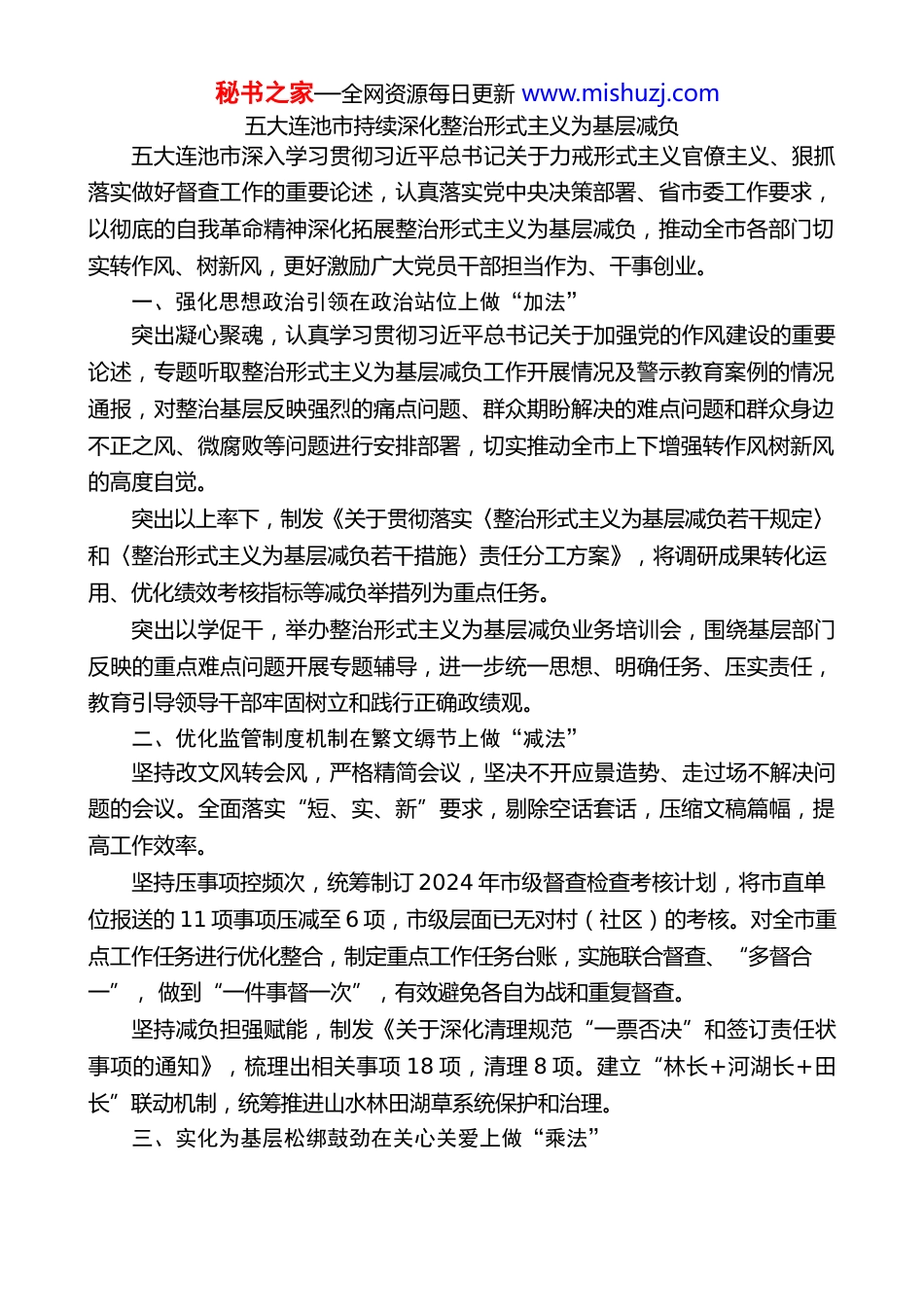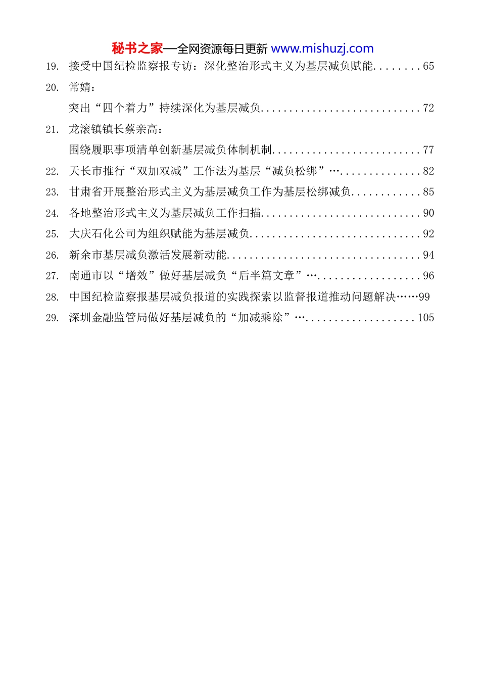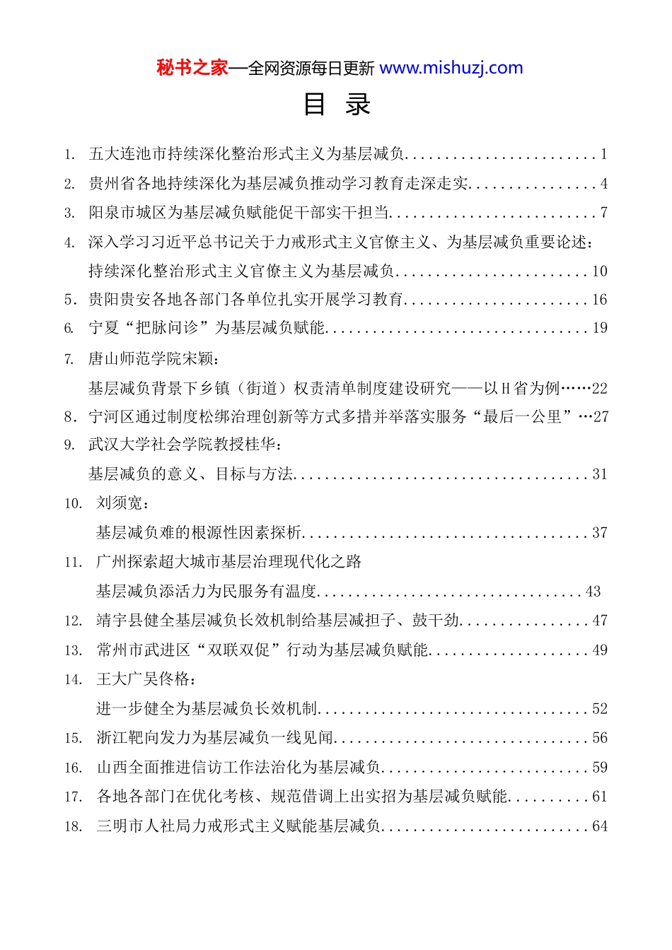 秘书之家—全网资源每日更新 www.mishuzj.com目 录1. 五大连池市持续深化整治形式主义为基层减负........................1 2. 贵州省各地持续深化为基层减负推动学习教育走深走实................4 3. 阳泉市城区为基层减负赋能促干部实干担当..........................7 4. 深入学习习近平总书记关于力戒形式主义官僚主义、为基层减负重要论述: 持续深化整治形式主义官僚主义为基层减负........................10 5.贵阳贵安各地各部门各单位扎实开展学习教育.......................16 6. 宁夏“把脉问诊”为基层减负赋能.................................19 7. 唐山师范学院宋颖: 基层减负背景下乡镇(街道)权责清单制度建设研究——以 H 省为例……22 8.宁河区通过制度松绑治理创新等方式多措并举落实服务“最后一公里”…279. 武汉大学社会学院教授桂华: 基层减负的意义、目标与方法.....................................31 10. 刘须宽: 基层减负难的根源性因素探析....................................37 11. 广州探索超大城市基层治理现代化之路 基层减负添活力为民服务有温度..................................43 12. 靖宇县健全基层减负长效机制给基层减担子、鼓干劲................47 13. 常州市武进区“双联双促”行动为基层减负赋能....................49 14. 王大广吴佟格: 进一步健全为基层减负长效机制..................................52 15. 浙江靶向发力为基层减负一线见闻................................56 16. 山西全面推进信访工作法治化为基层减负..........................59 17. 各地各部门在优化考核、规范借调上出实招为基层减负赋能..........61 18. 三明市人社局力戒形式主义赋能基层减负..........................64 秘书之家—全网资源每日更新 www.mishuzj.com19. 接受中国纪检监察报专访:深化整治形式主义为基层减负赋能........65 20. 常婧: 突出“四个着力”持续深化为基层减负............................72 21. 龙滚镇镇长蔡亲高: 围绕履职事项清单创新基层减负体制机制..........................77 22. 天长市推行“双加双减”工作法为基层“减负松绑”…..............82 23. 甘肃省开展整治形式主义为基层减负工作为基层松绑减负............85 24. 各地整治形式主义为基层减负工作扫描............................90 25. 大庆石化公司为组织赋能为基层减负..............................92 26. 新余市基层减负激活发展新动能..................................94 27. 南通市以“增效”做好基层减负“后半篇文章”…..................96 28. 中国纪检监察报基层减负报道的实践探索以监督报道推动问题解决……99 29. 深圳金融监管局做好基层减负的“加减乘除”…...................105秘书之家—全网资源每日更新 www.mishuzj.com五大连池市持续深化整治形式主义为基层减负五大连池市深入学习贯彻习近平总书记关于力戒形式主义官僚主义、狠抓落实做好督查工作的重要论述,认真落实党中央决策部署、省市委工作要求,以彻底的自我革命精神深化拓展整治形式主义为基层减负,推动全市各部门切实转作风、树新风,更好激励广大党员干部担当作为、干事创业。一、强化思想政治引领在政治站位上做“加法”突出凝心聚魂,认真学习贯彻习近平总书记关于加强党的作风建设的重要论述,专题听取整治形式主义为基层减负工作开展情况及警示教育案例的情况通报,对整治基层反映强烈的痛点问题、群众期盼解决的难点问题和群众身边不正之风、微腐败等问题进行安排部署,切实推动全市上下增强转作风树新风的高度自觉。突出以上率下,制发《关于贯彻落实〈整治形式主义为基层减负若干规定〉和〈整治形式主义为基层减负若干措施〉责任分工方案》,将调研成果转化运用、优化绩效考核指标等减负举措列为重点任务。突出以学促干,举办整治形式主义为基层减负业务培训会,围绕基层部门反映的重点难点问题开展专题辅导,进一步统一思想、明确任务、压实责任,教...