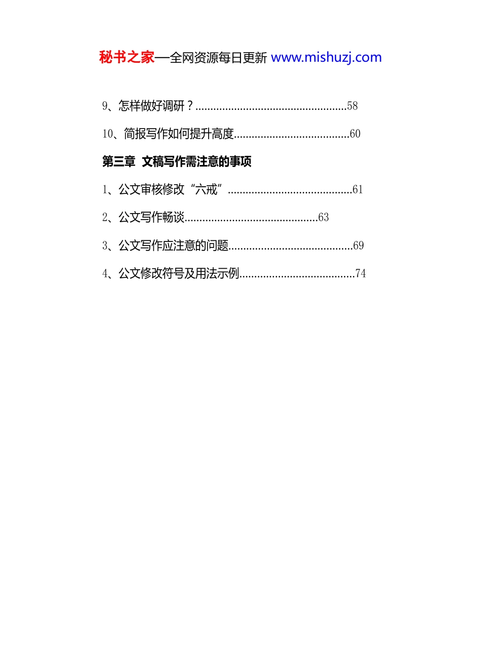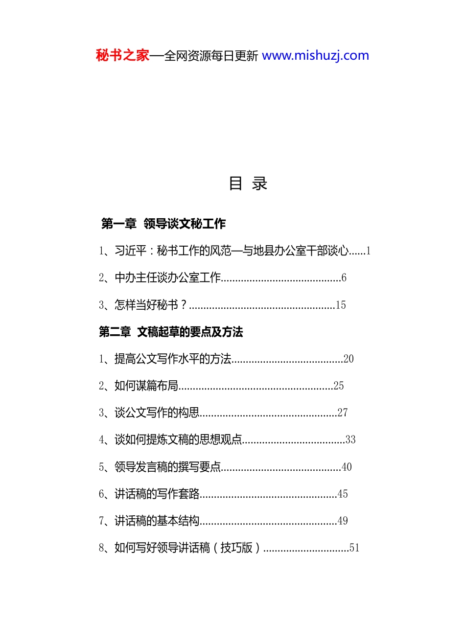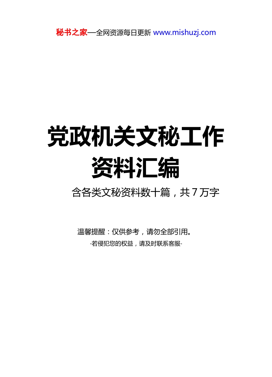 秘书之家—全网资源每日更新 www.mishuzj.com党政机关文秘工作资料汇编含各类文秘资料数十篇,共 7 万字温馨提醒:仅供参考,请勿全部引用。-若侵犯您的权益,请及时联系客服-秘书之家—全网资源每日更新 www.mishuzj.com目 录第一章 领导谈文秘工作1、习近平:秘书工作的风范—与地县办公室干部谈心……12、中办主任谈办公室工作……………………………………63、怎样当好秘书?……………………………………………15第二章 文稿起草的要点及方法1、提高公文写作水平的方法…………………………………202、如何谋篇布局………………………………………………253、谈公文写作的构思…………………………………………274、谈如何提炼文稿的思想观点………………………………335、领导发言稿的撰写要点……………………………………406、讲话稿的写作套路…………………………………………457、讲话稿的基本结构…………………………………………498、如何写好领导讲话稿(技巧版)…………………………51秘书之家—全网资源每日更新 www.mishuzj.com9、怎样做好调研?……………………………………………5810、简报写作如何提升高度…………………………………60第三章 文稿写作需注意的事项1、公文审核修改“六戒”……………………………………612、公文写作畅谈………………………………………633、公文写作应注意的问题……………………………………694、公文修改符号及用法示例…………………………………74秘书之家—全网资源每日更新 www.mishuzj.com第四章 会议组织和事务服务工作1、会议筹备 10 要点…………………………………………792、会议、宴会等座次安排……………………………………883、乘车礼仪……………………………………………………974、会务工作“八字”心得……………………………………1005、安康市委办公室落实 BXGD 有关事项的通知………103第五章 县政府公文处理规定1、D 政机关公文处理工作条例(节选)……………………1042、文稿制发要求……………………………………………1093、公文运转流程……………………………………………1114、公文格式标准讲义………………………………………1135、公文格式规定……………………………………………128第六章 相关资料1、新闻报道的禁用词和慎用词……………………………131第七章 秘书礼仪秘书之家—全网资源每日更新 www.mishuzj.com秘书之家—全网资源每日更新 www.mishuzj.com第一章 领导谈秘书工作1、 习近平:秘书工作的风范——与地县办公室干部谈心办公室,是一个单位、一个系统、一个机构的关键部门。办公室工作如何,对 D委乃至一个地方全面的工作影响很大。因此,每个地方的领导都非常关心、关怀和关注办公室工作。“运筹于帷幄之中,决胜于千里之外。”办公室工作做好了,各项工作的顺利开展也就有了可靠保证。一、办公室工作有四个特点。我曾经在中 Y 军委办公厅作过秘书工作,和大家一样,是同行。以后又相继在县、市、地区 D 委或政府中工作,和办公室的关系十分密切。对于办公室工作,我体会最深的有四个字:一是“重”,地位重要。办公室工作任务概括起来有三个:一个是决策的参谋、智囊作用;一个是对上对下的服务;一个是机要、保密工作。这几项任务都很重要。邓小平同志在一九七五年搞整顿时就讲过,一个地方工作要抓住几个人,办公室主任、公安局长、组织部长。这说明了办公室工作的重要性。因为它是决策的参谋部,始终围绕着首脑机关工作。参谋工作水平高,能推进 D 的方针、政策的顺利贯彻实施;水平低,就会影响全局工作,甚至造成严重后果。办公室对内掌握首脑机关的核心机密,泄露了重大机密,就会给 D 和国家造成损失。即使是我们地区一个保密的人事问题,泄露了也会影响领导班子的团结,使事情变得复杂起来。办公室对外还起一个“窗口”作用。基层的同志,外来的同志对我们地区的印象如何,对班子的印象如何,很大程度上同办公室的工作相联系。办公室工作出色,人家就会说这个地方工作真不错;办公室同志如果工作得很草率,或者是作风态度...