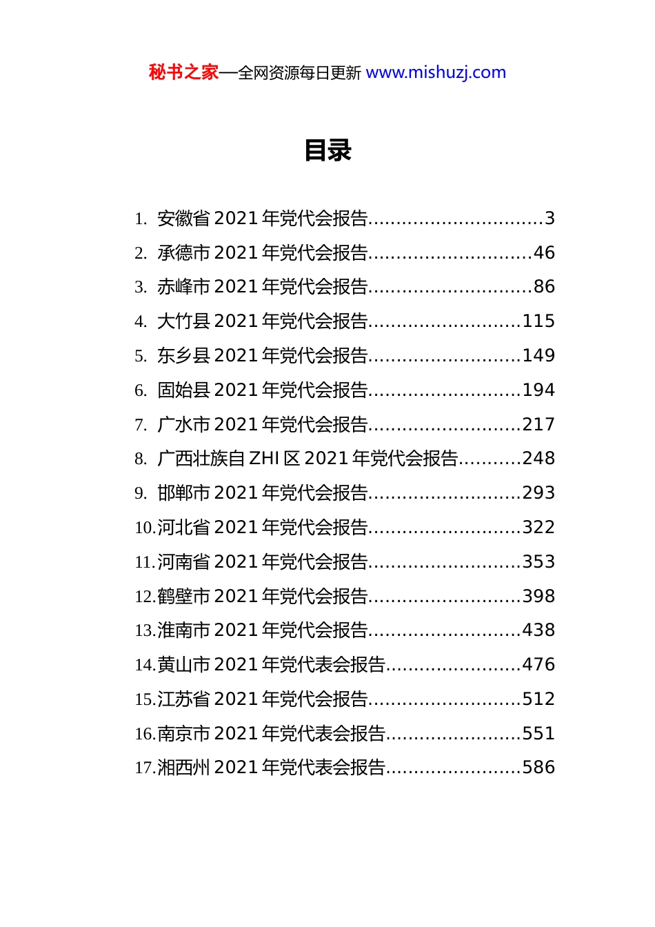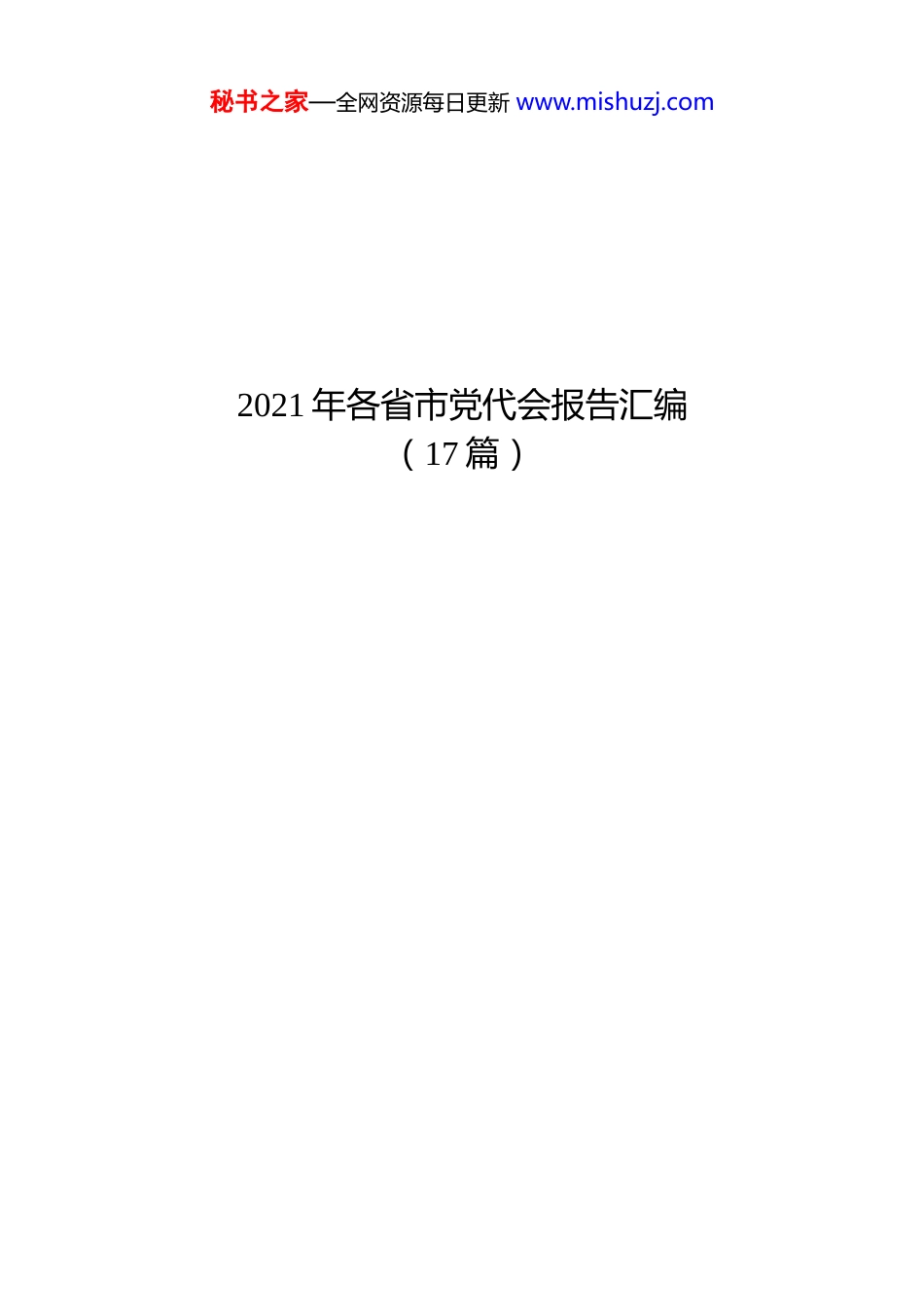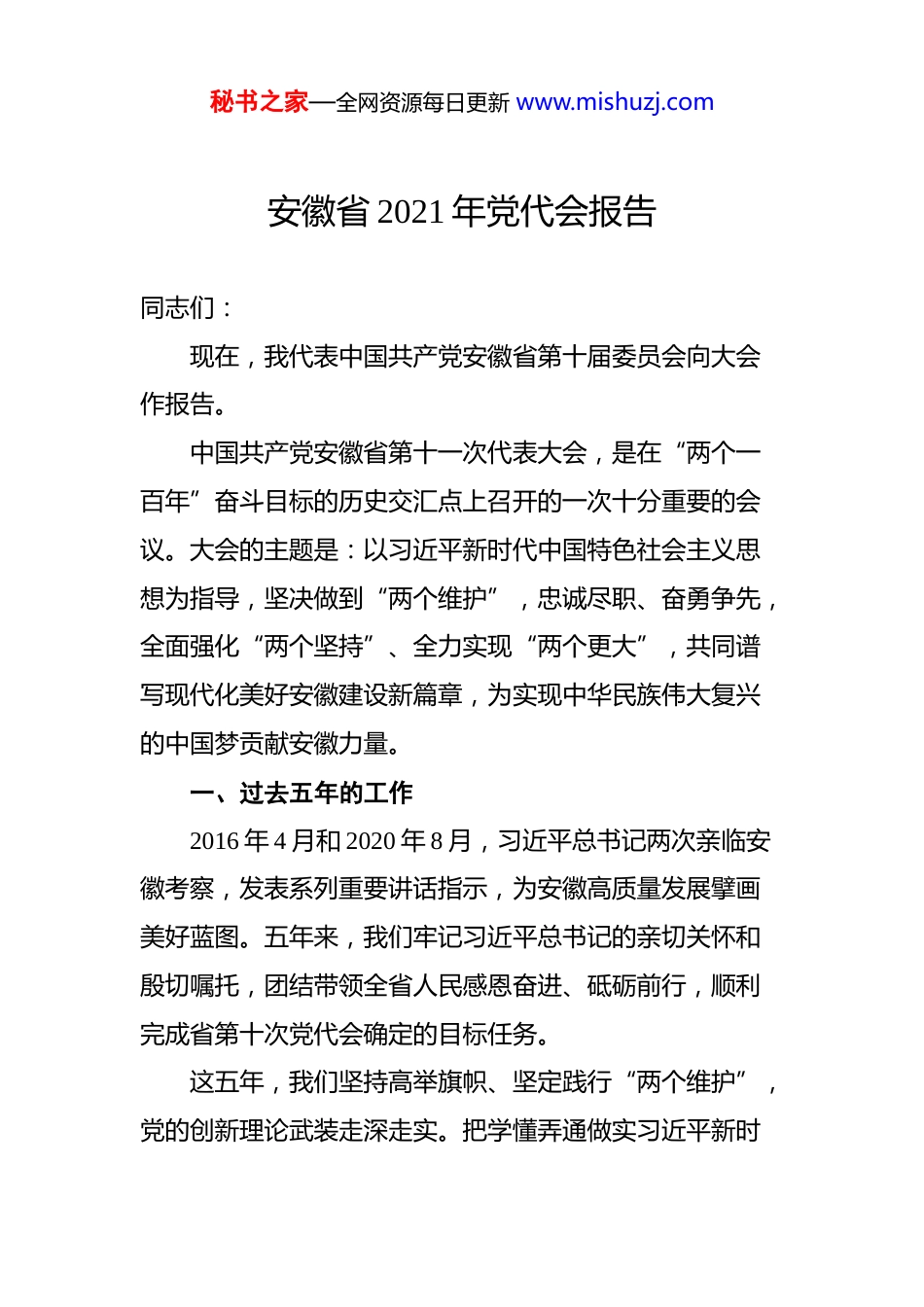 秘书之家—全网资源每日更新 www.mishuzj.com2021 年各省市党代会报告汇编(17 篇)秘书之家—全网资源每日更新 www.mishuzj.com目录1. 安徽省 2021 年党代会报告...............................32. 承德市 2021 年党代会报告.............................463. 赤峰市 2021 年党代会报告.............................864. 大竹县 2021 年党代会报告...........................1155. 东乡县 2021 年党代会报告...........................1496. 固始县 2021 年党代会报告...........................1947. 广水市 2021 年党代会报告...........................2178. 广西壮族自 ZHI 区 2021 年党代会报告...........2489. 邯郸市 2021 年党代会报告...........................29310.河北省 2021 年党代会报告...........................32211.河南省 2021 年党代会报告...........................35312.鹤壁市 2021 年党代会报告...........................39813.淮南市 2021 年党代会报告...........................43814.黄山市 2021 年党代表会报告........................47615.江苏省 2021 年党代会报告...........................51216.南京市 2021 年党代表会报告........................55117.湘西州 2021 年党代表会报告........................586秘书之家—全网资源每日更新 www.mishuzj.com安徽省 2021 年党代会报告同志们:现在,我代表中国共产党安徽省第十届委员会向大会作报告。中国共产党安徽省第十一次代表大会,是在“两个一百年”奋斗目标的历史交汇点上召开的一次十分重要的会议。大会的主题是:以习近平新时代中国特色社会主义思想为指导,坚决做到“两个维护”,忠诚尽职、奋勇争先,全面强化“两个坚持”、全力实现“两个更大”,共同谱写现代化美好安徽建设新篇章,为实现中华民族伟大复兴的中国梦贡献安徽力量。一、过去五年的工作2016 年 4 月和 2020 年 8 月,习近平总书记两次亲临安徽考察,发表系列重要讲话指示,为安徽高质量发展擘画美好蓝图。五年来,我们牢记习近平总书记的亲切关怀和殷切嘱托,团结带领全省人民感恩奋进、砥砺前行,顺利完成省第十次党代会确定的目标任务。这五年,我们坚持高举旗帜、坚定践行“两个维护”,党的创新理论武装走深走实。把学懂弄通做实习近平新时秘书之家—全网资源每日更新 www.mishuzj.com代中国特色社会主义思想作为首要政 ZHI 任务,巩固深化“两学一做”学习教育成果,深入开展“不忘初心、牢记使命” 主题教育和党史学习教育,组织开展“讲看齐、见行动”学习讨论。出台深入学习贯彻习近平新时代中国特色社会主义思想若干规定、贯彻落实习近平总书记重要指示批示若干规定,建立领导班子决策前学习习近平总书记重要讲话和有关重要论述的制度机制。建立贯彻落实习近平总书记考察安徽重要讲话指示精神任务清单,定期向党中 Y 报告贯彻落实情况,充分体现省委旗帜鲜明讲政 ZHI的坚定立场。这五年,我们坚持创新驱动、坚定科技自立自强,部分领域实现并跑领跑。全国首个国家实验室挂牌组建,合肥综合性国家科学中心建设取得重大进展, 大科学装置数量位居全国前列,省实验室和技术创新中心建成 32 家,区域创新能力稳居全国第一方阵。启动实施科技创新攻坚计划,量子通信、动态存储芯片、陶铝新材料、超薄玻璃等领域实现并跑领跑,墨子号、九章、祖冲之号、人造太阳等重大科技成果世界瞩目。安徽创新馆等科技大市场开市运营。实施新时代江淮英才计划,人才资源总量接近 1000万人。4 个产业集群入选国家首批战略性新兴产业集群,2家企业跻身世界五百强,制造业增加值、数字经济增加值秘书之家—全网资源每日更新 www.mishuzj.com均超 1 万亿元,以“芯屏器合”为标识的现代产业体系加快构建。这五年,我们坚持扬皖所长、坚定贯彻国家战略,区域协调发展共进共赢。安徽正式成为长三角成员,苏皖合作示范区加快建设,毗邻地区新型功能区、省际产业合作园区建设全面推进。合肥经济总量过 1 万亿元,合肥都市圈、皖江城...