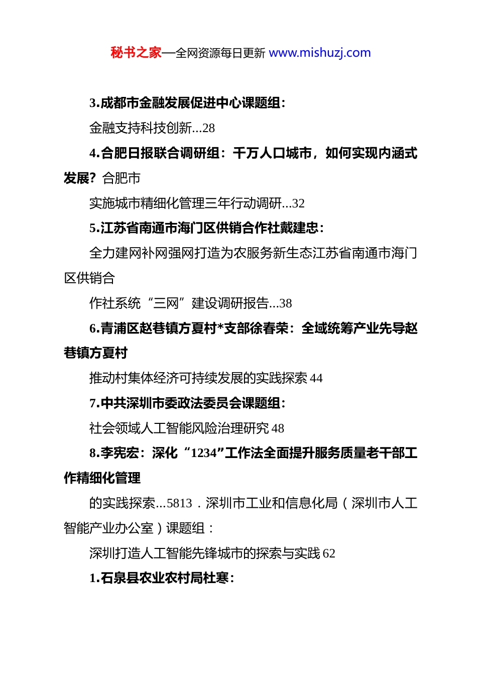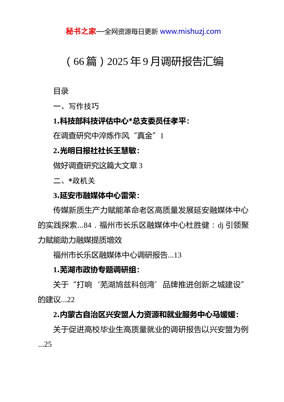 秘书之家—全网资源每日更新 www.mishuzj.com(66 篇)2025 年 9 月调研报告汇编目录一、写作技巧1.科技部科技评估中心*总支委员任孝平:在调查研究中淬炼作风“真金”12.光明日报社社长王慧敏:做好调查研究这篇大文章 3二、*政机关3.延安市融媒体中心雷荣:传媒新质生产力赋能革命老区高质量发展延安融媒体中心的实践探索…84.福州市长乐区融媒体中心杜胜健:dj 引领聚力赋能助力融媒提质增效福州市长乐区融媒体中心调研报告…131.芜湖市政协专题调研组:关于“打响‘芜湖鸠兹科创湾’品牌推进创新之城建设”的建议…222.内蒙古自治区兴安盟人力资源和就业服务中心马媛媛:关于促进高校毕业生高质量就业的调研报告以兴安盟为例…25秘书之家—全网资源每日更新 www.mishuzj.com3.成都市金融发展促进中心课题组:金融支持科技创新…284.合肥日报联合调研组:千万人口城市,如何实现内涵式发展?合肥市实施城市精细化管理三年行动调研…325.江苏省南通市海门区供销合作社戴建忠:全力建网补网强网打造为农服务新生态江苏省南通市海门区供销合作社系统“三网”建设调研报告…386.青浦区赵巷镇方夏村*支部徐春荣:全域统筹产业先导赵巷镇方夏村推动村集体经济可持续发展的实践探索 447.中共深圳市委政法委员会课题组:社会领域人工智能风险治理研究 488.李宪宏:深化“1234”工作法全面提升服务质量老干部工作精细化管理的实践探索…5813.深圳市工业和信息化局(深圳市人工智能产业办公室)课题组:深圳打造人工智能先锋城市的探索与实践 621.石泉县农业农村局杜寒:秘书之家—全网资源每日更新 www.mishuzj.com石泉县桑文旅融合驱动乡村振兴的实践探索…752.山东省临沂市供销合作社高立国:探寻供销合作社农产品流通高质量发展“密码”关于山东省临沂市农产品流通工作的调研报告…813.驻马店市乡村振兴服务中心黄妍:土地流转存在的问题及对策…86三、高校4.徐州医科大学档案馆焦勇:“三联 dj 工作法”推进高校博物馆文化育人的实践探索以徐州医科大学赤脚医生博物馆*支部为例…915.南京理工大学马克思主义学院陈彦余:物质精神协调发展社区教育铸牢中华民族共同体意识的实践路径基于呼和浩特市三顺店社区的田野调查 976.陈东洋、王阳:村级组织弱自主性的形塑机制与调适策略基于安徽省y 镇的田野调研 1087.中国人民警察大学**斌:秘书之家—全网资源每日更新 www.mishuzj.com大城市“三非”治理问题及对策研究 1228.武汉电力职业技术学院仇晨光:电力高职院校职业发展与就业指导工作中的问题及对策…1339.北京中医药大学古丽胡玛尔·吐尔洪:高校铸牢中华民族共同体意识的实践探索以北京中医药大学为例…14023.广东科学技术职业学院国际合作学院窦菊花:高职学生数字能力及影响因素研究以广州市高职院校为调研对象…14824.北京农业职业学院付天新:高职院校信息素养教育路径与实践探索以北京农业职业学院为例…15525.黄河科技学院李良:金融科技驱动普惠金融发展实践探索…1621.福建清流开放大学邓文华:开放大学助推县域社区教育发展的实践探索以福建清流为例…1672.吉林农业科技学院农学院杨祥波:科技助力乡村振兴的实践探索与经验启示以吉林农业科技学院博士工作站为例 17328.安徽工业大学商学院教授:马鞍山市低空经济发展现状、问题及对策…180秘书之家—全网资源每日更新 www.mishuzj.com1.福建农林大学殷楚棋:农村集体经营性建设用地入市问题及对策…1862.合肥工业大学马克思主义学院朱浩:人工智能赋能高校思政课的价值、问题及对策探析…1923.南宁职业技术大学杨华:生态文明教育融入高校基层*支部建设的实践探索以南宁职业技术大学传媒学院第二*支部为例 20232.北京经济管理职业学院马克思主义学院姚昊炜:首都职业院校“大思政课”建设实践探索以北京经济管理职业学院为例…2051.宁夏工商职业技术大学卢迪:数字经济背景下企业管理面临的突出问题及对策建议 2112.潍坊职业学院王保兴:潍坊市高职院校毕业生属地就业意愿影响因素调研…2193.郑州航空工业管理学院刘永丽:我国低空经济发展现存问题及对策建议分析…2254.刘学梅:我国国有...