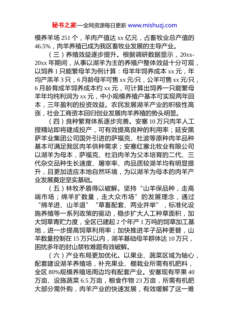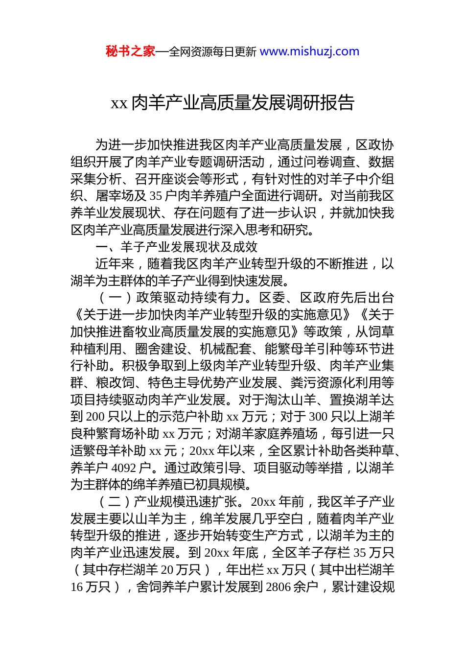 秘书之家—全网资源每日更新 www.mishuzj.comxx 肉羊产业高质量发展调研报告为进一步加快推进我区肉羊产业高质量发展,区政协组织开展了肉羊产业专题调研活动,通过问卷调查、数据采集分析、召开座谈会等形式,有针对性的对羊子中介组织、屠宰场及 35 户肉羊养殖户全面进行调研。对当前我区养羊业发展现状、存在问题有了进一步认识,并就加快我区肉羊产业高质量发展进行深入思考和研究。一、羊子产业发展现状及成效近年来,随着我区肉羊产业转型升级的不断推进,以湖羊为主群体的羊子产业得到快速发展。(一)政策驱动持续有力。区委、区政府先后出台《关于进一步加快肉羊产业转型升级的实施意见》《关于加快推进畜牧业高质量发展的实施意见》等政策,从饲草种植利用、圈舍建设、机械配套、能繁母羊引种等环节进行补助。积极争取到上级肉羊产业转型升级、肉羊产业集群、粮改饲、特色主导优势产业发展、粪污资源化利用等项目持续驱动肉羊产业发展。对于淘汰山羊、置换湖羊达到 200 只以上的示范户补助 xx 万元;对于 300 只以上湖羊良种繁育场补助 xx 万元;对湖羊家庭养殖场,每引进一只适繁母羊补助 xx 元;20xx 年以来,全区累计补助各类种草、养羊户 4092 户。通过政策引导、项目驱动等举措,以湖羊为主群体的绵羊养殖已初具规模。(二)产业规模迅速扩张。20xx 年前,我区羊子产业发展主要以山羊为主,绵羊发展几乎空白,随着肉羊产业转型升级的推进,逐步开始转变生产方式,以湖羊为主的肉羊产业迅速发展。到 20xx 年底,全区羊子存栏 35 万只(其中存栏湖羊 20 万只),年出栏 xx 万只(其中出栏湖羊16 万只),舍饲养羊户累计发展到 2806 余户,累计建设规秘书之家—全网资源每日更新 www.mishuzj.com模养羊场 251 个,羊肉产值达 xx 亿元,占畜牧业总产值的46.5%,肉羊养殖已成为我区畜牧业发展的主导产业。(三)养殖效益逐步提升。根据调研数据显示,20xx-20xx 年期间,从事以湖羊为主的养殖户整体效益十分可观,以饲养 1 只能繁母羊为例计算:母羊年饲养成本 xx 元,年均产羔羊 3 只,6 月龄母羊可售 xx 元/只,公羊可售 xx 元/只,6 月龄育成羊饲养成本约 xx 元,可计算出饲养一只能繁母羊年均纯利润为 xx 元,中小规模养殖户基本可实现两年回本,三年盈利的投资效益。农民发展湖羊产业的积极性高涨,社会工商资本回归创业发展肉羊养殖的势头明显。(四)良种繁育体系逐步完善。安塞 10 万只肉羊人工授精站即将建成投产,可有效提高良种的利用率;延安黑萨羊业集团公司国外引进的萨福克、杜波等原种肉羊品种基本可满足我区肉羊供种需求;安塞红塞北牧业有限公司以湖羊为母本,萨福克、杜泊肉羊为父本培育的二代、三代杂交品种生长速度、屠宰率、肉品质较湖羊均有明显提升,且更加适应本地自然环境,为以湖羊为母本的肉羊产业发展奠定坚实基础。(五)林牧矛盾得以破解。坚持“山羊保品种,走高端市场;绵羊扩数量,走大众市场”的发展理念,通过“绵羊进、山羊退”“草畜配套、两业并举”,标准化设施养殖等一系列政策的驱动,稳步扩大人工种草面积,加大饲草青贮力度,全区已建起 2 个年产 1 万吨的饲草加工基地,进一步提高饲草利用率;加快推进羊子品种更替,山羊数量控制在 15 万只以内,湖羊基础母羊群体达 10 万只,困扰多年的封山禁牧难题有效破解。(六)产业布局更加优化。以果业、蔬菜区域为轴心,配套建设湖羊养殖场,补充果业、棚栽业所需有机肥料,全区 80%规模养殖场周边均有配套产业。安塞现有苹果 40万亩、设施蔬菜 6.5 万亩,粮食作物 23 万亩,所需有机肥大部分需外购,肉羊产业的快速发展,有效缓解了这一难秘书之家—全网资源每日更新 www.mishuzj.com题。目前全区已建成高桥北宋塔、招安谢屯、沿河湾高家峁等 30 多个生态农业循环园区。(七)品牌助推产业发展。“安塞地椒羊肉”成功注册国家地理标志证明商标,已在北京、广州、西安等地建成“安塞地椒羊肉”品牌店 36 家,200 多家网店线上销售,形成企业提供产品、网店吸纳客户、窗口店打造品牌、线上线下同步发力...