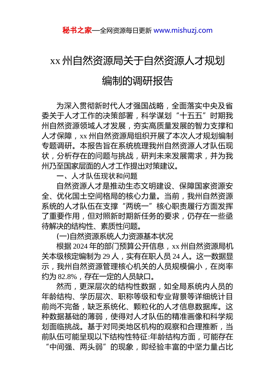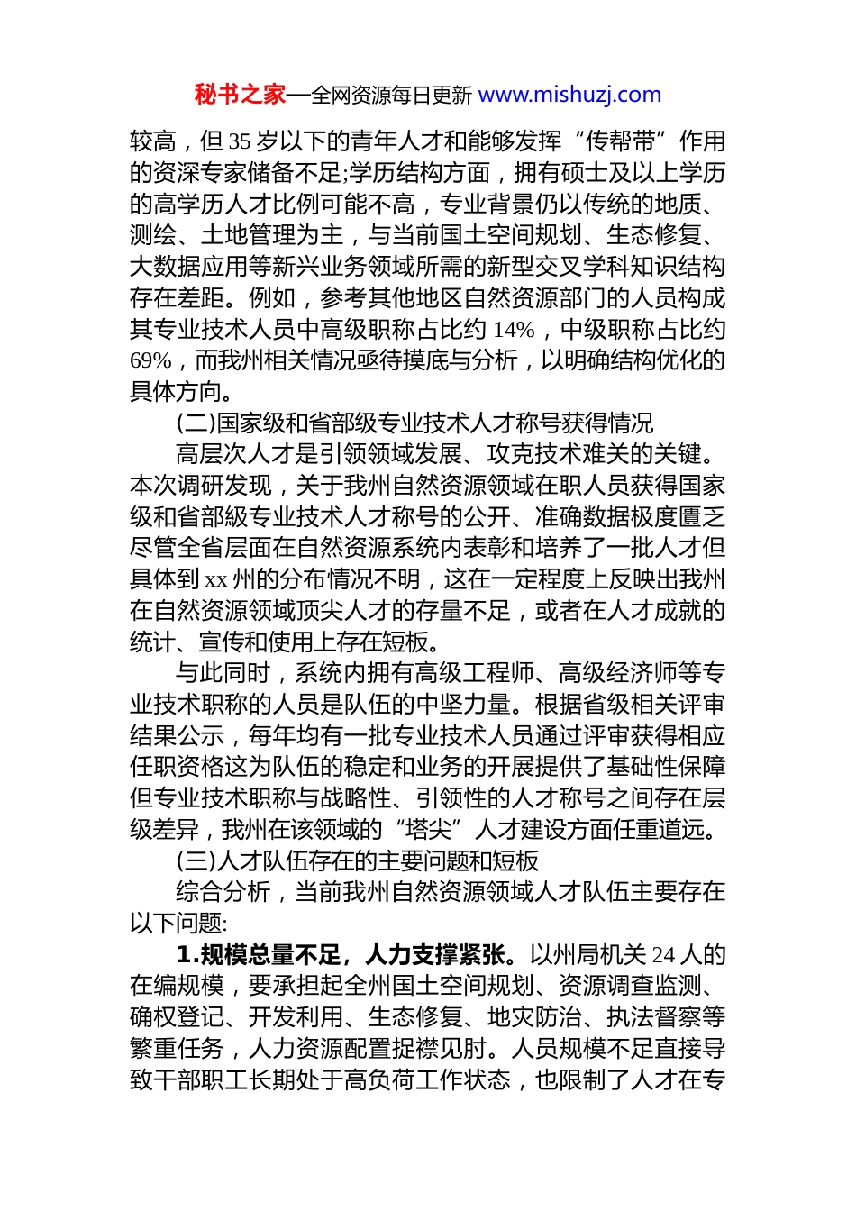 秘书之家—全网资源每日更新 www.mishuzj.comxx 州自然资源局关于自然资源人才规划编制的调研报告为深入贯彻新时代人才强国战略,全面落实中央及省委关于人才工作的决策部署,科学谋划“十五五”时期我州自然资源领域人才发展,夯实高质量发展的智力支撑和人才保障,xx 州自然资源局组织开展了本次人才规划编制专题调研。本报告旨在系统梳理我州自然资源人才队伍现状,分析存在的问题与挑战,研判未来发展需求,并为我州乃至国家层面的人才工作提出对策建议。一、人才队伍现状和问题自然资源人才是推动生态文明建设、保障国家资源安全、优化国土空间格局的核心力量。当前,我州自然资源系统的人才队伍在支撑“两统一”核心职责履行方面发挥了重要作用,但对照新时期新任务的要求,仍存在一些亟待解决的结构性、素质性问题。(一)自然资源系统人力资源基本状况根据 2024 年的部门预算公开信息,xx 州自然资源局机关本级核定编制为 29 人,实有在职人员 24 人。这一数据显示,我州自然资源管理核心机关的人员规模偏小,在岗率约为 82.8%,存在一定的人员缺口。然而,更深层次的结构性数据,如全局系统内人员的年龄结构、学历层次、职称等级和专业背景等详细统计目前尚不完备,缺乏系统化、颗粒化的人才信息数据库。这种数据基础的薄弱,使得对人才队伍的精准画像和科学规划面临挑战。基于对同类地区机构的观察和合理推断,当前队伍可能呈现以下结构性特征:年龄结构方面,可能存在“中间强、两头弱”的现象,即经验丰富的中坚力量占比秘书之家—全网资源每日更新 www.mishuzj.com较高,但 35 岁以下的青年人才和能够发挥“传帮带”作用的资深专家储备不足;学历结构方面,拥有硕士及以上学历的高学历人才比例可能不高,专业背景仍以传统的地质、测绘、土地管理为主,与当前国土空间规划、生态修复、大数据应用等新兴业务领域所需的新型交叉学科知识结构存在差距。例如,参考其他地区自然资源部门的人员构成其专业技术人员中高级职称占比约 14%,中级职称占比约69%,而我州相关情况亟待摸底与分析,以明确结构优化的具体方向。(二)国家级和省部级专业技术人才称号获得情况高层次人才是引领领域发展、攻克技术难关的关键。本次调研发现,关于我州自然资源领域在职人员获得国家级和省部級专业技术人才称号的公开、准确数据极度匱乏尽管全省层面在自然资源系统内表彰和培养了一批人才但具体到 xx 州的分布情况不明,这在一定程度上反映出我州在自然资源领域顶尖人才的存量不足,或者在人才成就的统计、宣传和使用上存在短板。与此同时,系统内拥有高级工程师、高级经济师等专业技术职称的人员是队伍的中坚力量。根据省级相关评审结果公示,每年均有一批专业技术人员通过评审获得相应任职资格这为队伍的稳定和业务的开展提供了基础性保障但专业技术职称与战略性、引领性的人才称号之间存在层级差异,我州在该领域的“塔尖”人才建设方面任重道远。(三)人才队伍存在的主要问题和短板综合分析,当前我州自然资源领域人才队伍主要存在以下问题:1.规模总量不足,人力支撑紧张。以州局机关 24 人的在编规模,要承担起全州国土空间规划、资源调查监测、确权登记、开发利用、生态修复、地灾防治、执法督察等繁重任务,人力资源配置捉襟见肘。人员规模不足直接导致干部职工长期处于高负荷工作状态,也限制了人才在专秘书之家—全网资源每日更新 www.mishuzj.com业领域深耕细作的空间。2.高端人才匮乏,创新引领力弱。缺乏能够在国家和省级层面产生影响力的领军人才和学科带头人,导致我州在争取国家重大科研项目、参与制定行业标准、攻克关键核心技术等方面处于被动地位。人才队伍的“高峰”不突出,制约了全州自然资源工作的创新发展水平。3.人才结构失衡,适配性有待提升。一是年龄结构存在断层风险,青年人才储备不足,影响队伍的可持续发展二是专业结构与新职能不完全匹配,面对“山水林田湖草沙”一体化保护和治理的系统性要求,以及大数据、人工智能、实景三维等新技术应用的浪潮,干部队伍在生态学地理信息科学、数据科学、法学、经济学等领域的知识储备和应用能力亟待加...