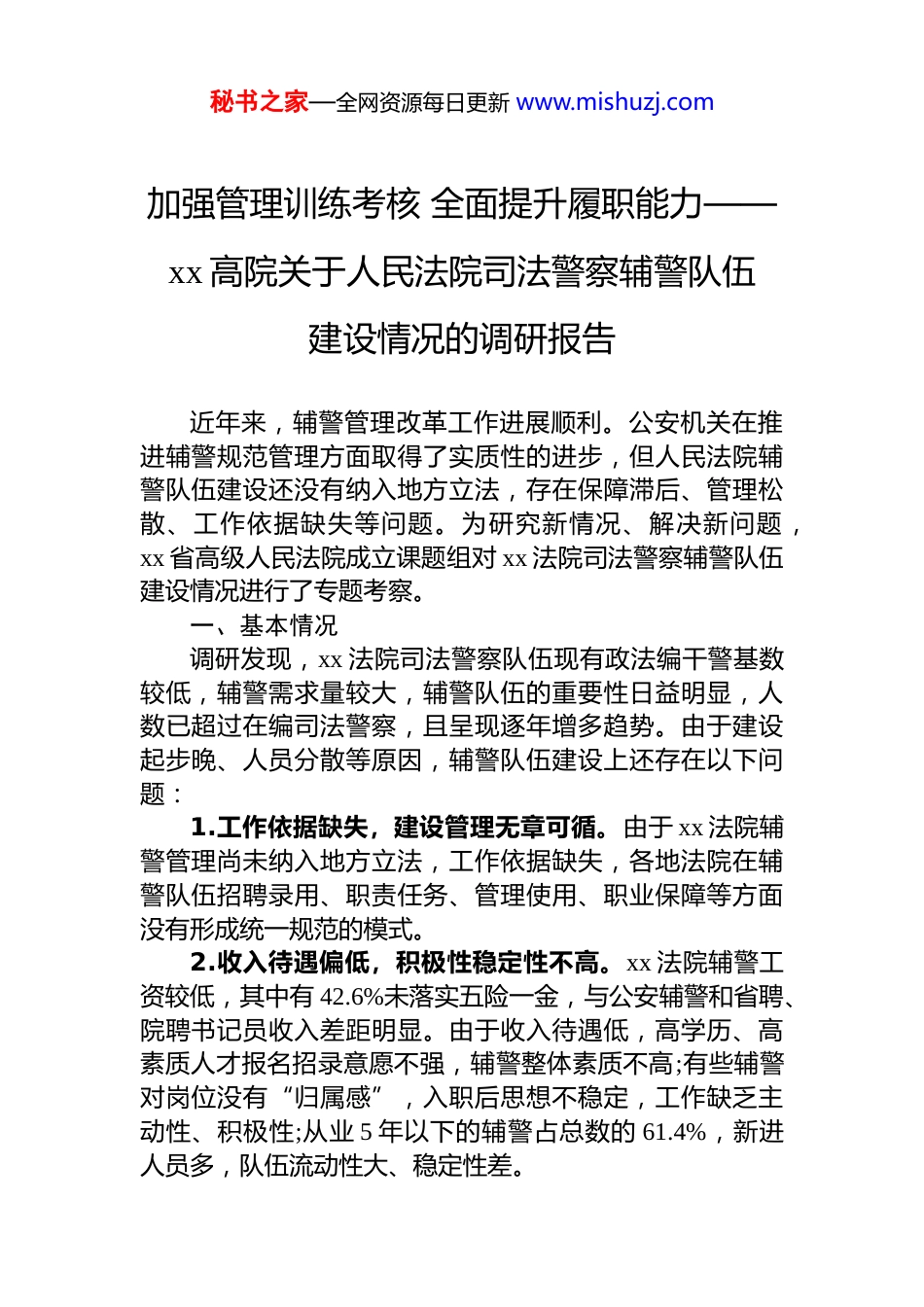 秘书之家—全网资源每日更新 www.mishuzj.com加强管理训练考核 全面提升履职能力——xx 高院关于人民法院司法警察辅警队伍建设情况的调研报告近年来,辅警管理改革工作进展顺利。公安机关在推进辅警规范管理方面取得了实质性的进步,但人民法院辅警队伍建设还没有纳入地方立法,存在保障滞后、管理松散、工作依据缺失等问题。为研究新情况、解决新问题,xx 省高级人民法院成立课题组对 xx 法院司法警察辅警队伍建设情况进行了专题考察。一、基本情况调研发现,xx 法院司法警察队伍现有政法编干警基数较低,辅警需求量较大,辅警队伍的重要性日益明显,人数已超过在编司法警察,且呈现逐年增多趋势。由于建设起步晚、人员分散等原因,辅警队伍建设上还存在以下问题:1.工作依据缺失,建设管理无章可循。由于 xx 法院辅警管理尚未纳入地方立法,工作依据缺失,各地法院在辅警队伍招聘录用、职责任务、管理使用、职业保障等方面没有形成统一规范的模式。2.收入待遇偏低,积极性稳定性不高。xx 法院辅警工资较低,其中有 42.6%未落实五险一金,与公安辅警和省聘、院聘书记员收入差距明显。由于收入待遇低,高学历、高素质人才报名招录意愿不强,辅警整体素质不高;有些辅警对岗位没有“归属感”,入职后思想不稳定,工作缺乏主动性、积极性;从业 5 年以下的辅警占总数的 61.4%,新进人员多,队伍流动性大、稳定性差。秘书之家—全网资源每日更新 www.mishuzj.com3.教育训练难落实,履职能力偏弱。辅警队伍教育训练的“时间、内容、人员、效果”难以落实。很多警队的日常庭审保障任务重,警力都在岗位上,难以集中时间开展教育训练;一些基层警队缺乏教官人才,没有教学力量,加之年龄层次相差较大,教学内容难以安排;很多警队的辅警常年派驻在其他部门工作,召回需与被派驻部门协商,人员难召集;由于教育训练落实不好,效果达不到,队伍整体业务能力偏弱。二、原因分析1.对辅警队伍建设重视不够。一些法院对司法警察工作重视不够,存在认识偏差,重使用、轻管理、弱保障,对司法警察队伍存在的编制人员少、年龄老化、警力不足等问题关注度不多,辅警队伍建设摆不上应有位置。2.缺乏规范配套的管理制度。目前,xx 法院还没有专门规范辅警管理的制度,现有相关规定仅散见于几个通知文件中,内容大多较为原则,操作性不强,缺乏规范完整配套的制度规定,致使全省法院辅警在招聘、使用、管理保障上都呈现出不同的情况。3.对辅警队伍建设管理的督查考核不够。目前对辅警队伍建设的监督检查,大多只是对辅警履职情况的检查,而对这支队伍“建、训、管”抓建不够。xx 高院还没有将辅警建设纳入警务工作高质量发展考核体系,使得部分法院对辅警队伍的建设管理不够重视。三、对策建议依法规范辅警管理,提升辅警效能,应以提供法律支撑、建立相关配套制度、创新辅警管理手段为抓手,积极推动辅警队伍法治化、制度化、规范化建设,实现辅警队伍建设从数量扩张向质量提升、从粗放化管理向精细化管理转变。1.积极推进辅警队伍建设立法。加强与省人大、财政厅等进行沟通协调,主动联系检察机关、司法行政部门,秘书之家—全网资源每日更新 www.mishuzj.com形成工作合力,加大法院辅警管理立法推进力度,确保 xx法院辅警管理工作有法可依。2.建立完善辅警队伍建设管理制度。在法院辅警管理未纳入立法的过渡期,突出人员招录的科学性、职业保障的合理性、考核激励的有效性,围绕辅警的招录聘用、职责任务、职业保障、使用管理、考核激励等方面进行建章立制,尽快出台关于 xx 法院司法警务辅助人员管理的规范性文件,完善配套制度,使辅警管理各项工作有章可循。3.狠抓法院辅警队伍教育训练。建立完善 xx 法院辅警与司法警察相融合、与职业特点相适应、与本职岗位相匹配的教育、训练、考核机制,不断提升辅警队伍履职能力和战斗力。一是抓好辅警岗前集中培训。紧贴辅警岗位实情实际,突出实战实效,加强政治理论教育,强化基础理论知识、基本体能技能和专业技能训练,提升新聘辅警的政治素养和履职能力。二是扎实开展岗位练兵。充分利用“五小练兵”模式即挤出“小段时间”、利用...