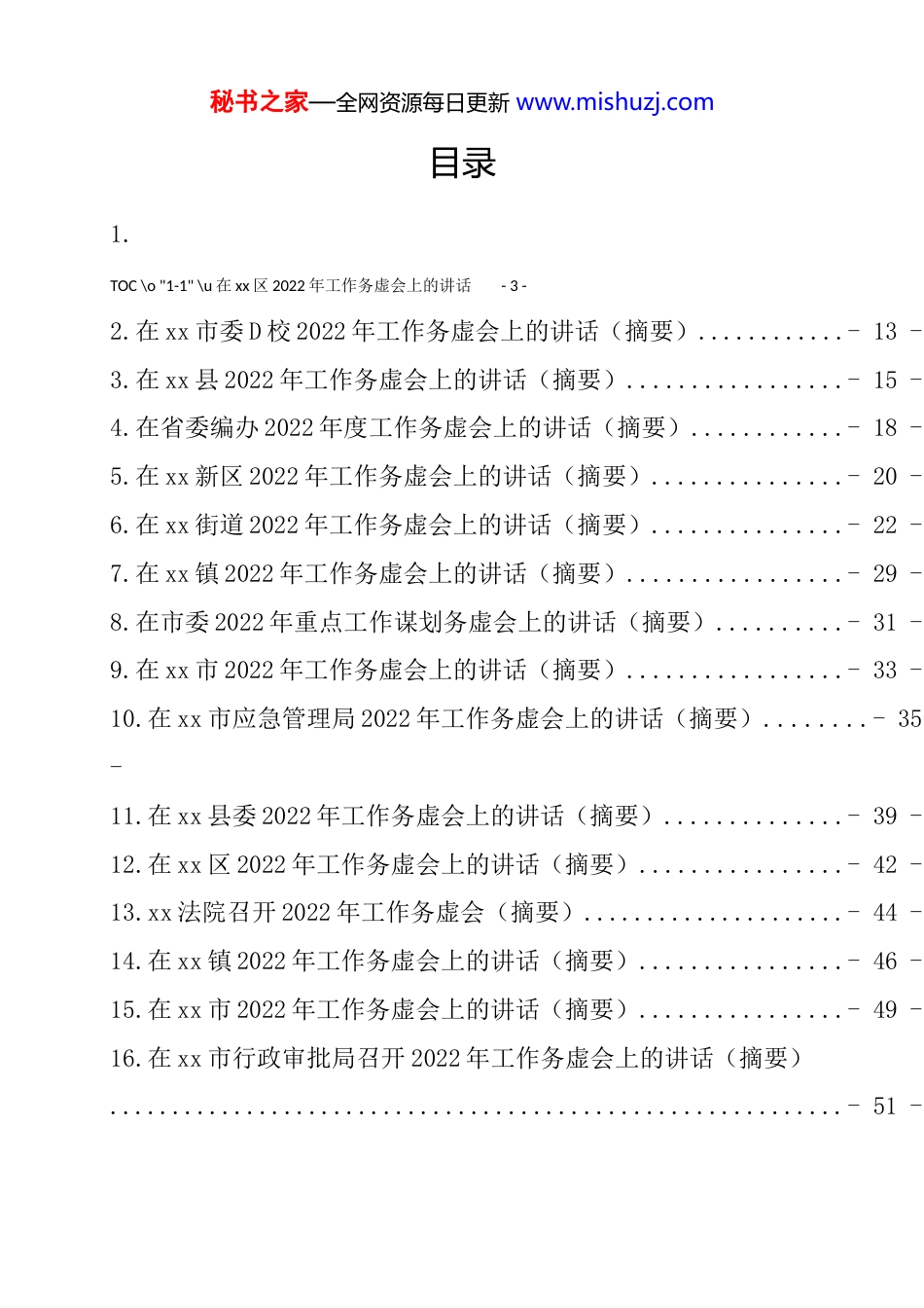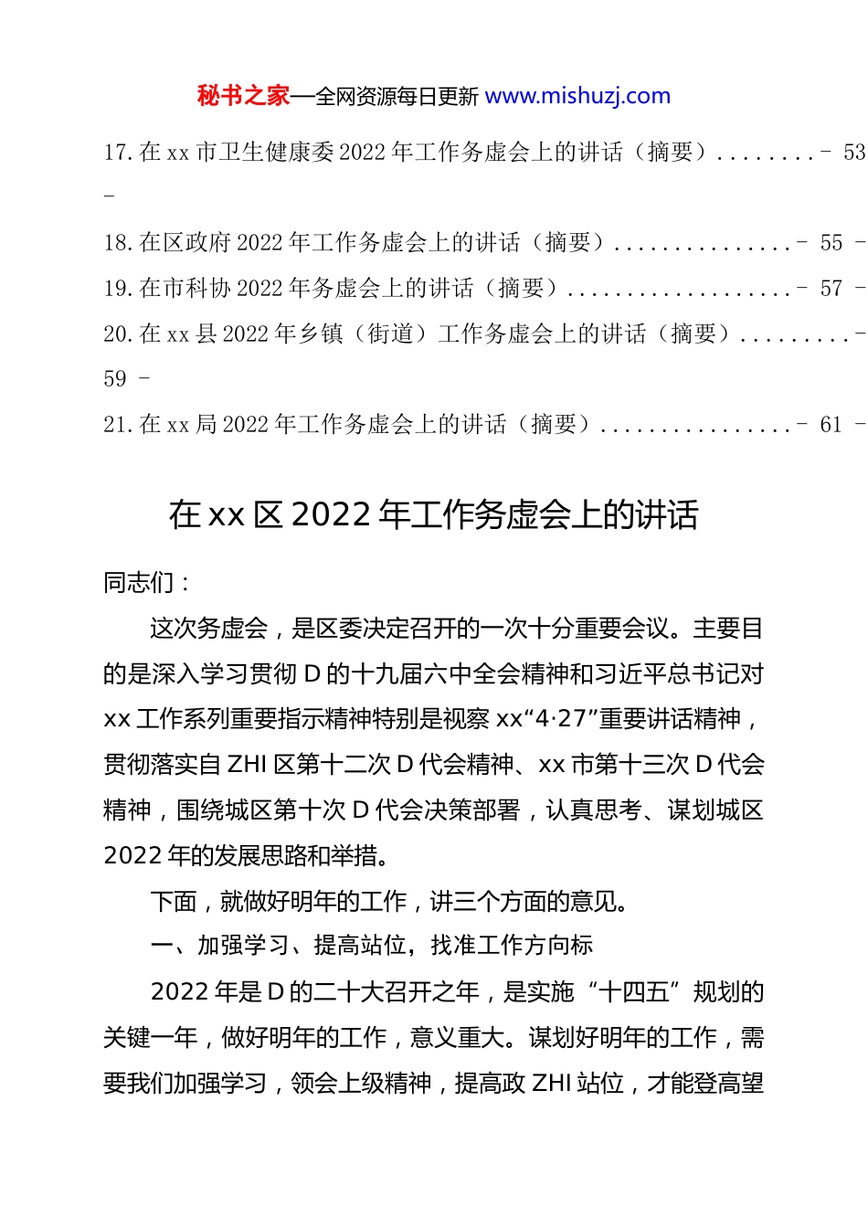 秘书之家—全网资源每日更新 www.mishuzj.com目录1.TOC \o "1-1" \u 在 xx 区 2022 年工作务虚会上的讲话- 3 -2.在 xx 市委 D 校 2022 年工作务虚会上的讲话(摘要)............- 13 -3.在 xx 县 2022 年工作务虚会上的讲话(摘要).................- 15 -4.在省委编办 2022 年度工作务虚会上的讲话(摘要)............- 18 -5.在 xx 新区 2022 年工作务虚会上的讲话(摘要)...............- 20 -6.在 xx 街道 2022 年工作务虚会上的讲话(摘要)...............- 22 -7.在 xx 镇 2022 年工作务虚会上的讲话(摘要).................- 29 -8.在市委 2022 年重点工作谋划务虚会上的讲话(摘要)..........- 31 -9.在 xx 市 2022 年工作务虚会上的讲话(摘要).................- 33 -10.在 xx 市应急管理局 2022 年工作务虚会上的讲话(摘要)........- 35-11.在 xx 县委 2022 年工作务虚会上的讲话(摘要)..............- 39 -12.在 xx 区 2022 年工作务虚会上的讲话(摘要)................- 42 -13.xx 法院召开 2022 年工作务虚会(摘要).....................- 44 -14.在 xx 镇 2022 年工作务虚会上的讲话(摘要)................- 46 -15.在 xx 市 2022 年工作务虚会上的讲话(摘要)................- 49 -16.在 xx 市行政审批局召开 2022 年工作务虚会上的讲话(摘要)...........................................................- 51 -秘书之家—全网资源每日更新 www.mishuzj.com17.在 xx 市卫生健康委 2022 年工作务虚会上的讲话(摘要)........- 53-18.在区政府 2022 年工作务虚会上的讲话(摘要)...............- 55 -19.在市科协 2022 年务虚会上的讲话(摘要)...................- 57 -20.在 xx 县 2022 年乡镇(街道)工作务虚会上的讲话(摘要).........-59 -21.在 xx 局 2022 年工作务虚会上的讲话(摘要)................- 61 -在 xx 区 2022 年工作务虚会上的讲话同志们:这次务虚会,是区委决定召开的一次十分重要会议。主要目的是深入学习贯彻 D 的十九届六中全会精神和习近平总书记对xx 工作系列重要指示精神特别是视察 xx“4·27”重要讲话精神,贯彻落实自 ZHI 区第十二次 D 代会精神、xx 市第十三次 D 代会精神,围绕城区第十次 D 代会决策部署,认真思考、谋划城区2022 年的发展思路和举措。下面,就做好明年的工作,讲三个方面的意见。一、加强学习、提高站位,找准工作方向标2022 年是 D 的二十大召开之年,是实施“十四五”规划的关键一年,做好明年的工作,意义重大。谋划好明年的工作,需要我们加强学习,领会上级精神,提高政 ZHI 站位,才能登高望秘书之家—全网资源每日更新 www.mishuzj.com远,把握发展大局大势,明确工作的方向和路径。一要全面学习贯彻领袖嘱托。自 ZHI 区第十二次 D 代会报告的标题提出“牢记领袖嘱托”,就是要求我们要全面系统学习 D的十八大以来,习近平总书记对 xx 工作的系列重要指示精神,确保领袖嘱托在城区落地生根、开花结果。D 的十八大以来,以习近平同志为核心的 D 中 Y 对 xx 工作高度重视、亲切关怀。习近平总书记情系壮乡各族人民,多次作出重要指示批示,赋予xx“三大定位”,提出“五个扎实”要求,在自 ZHI 区成立 60周年之际专门题写了“建设壮美 xx 共圆复兴梦想”的贺匾。总书记两次亲临 xx,今年视察时发表了“4·27”重要讲话,要求我们按照“四个新”总要求,突出抓好四个方面重要工作,凝心聚力建设新时代中国特色社会主义壮美 xx。这为 xx 经济社会高质量发展进一步指明了前进方向、提供了根本遵循。我们要牢记领袖嘱托、提高政 ZHI 站位,增强“四个意识”、坚定“四个自信”、做到“两个维护”,为建设新时代中国特色社会主义壮美xx 贡献 xx 力量。二要全面学习贯彻 D 的十九届六中全会精神。十九届六中全会是在重要历史关头召开的一次具有重大历史意义的会议,全会最重要的成果是审议通...
